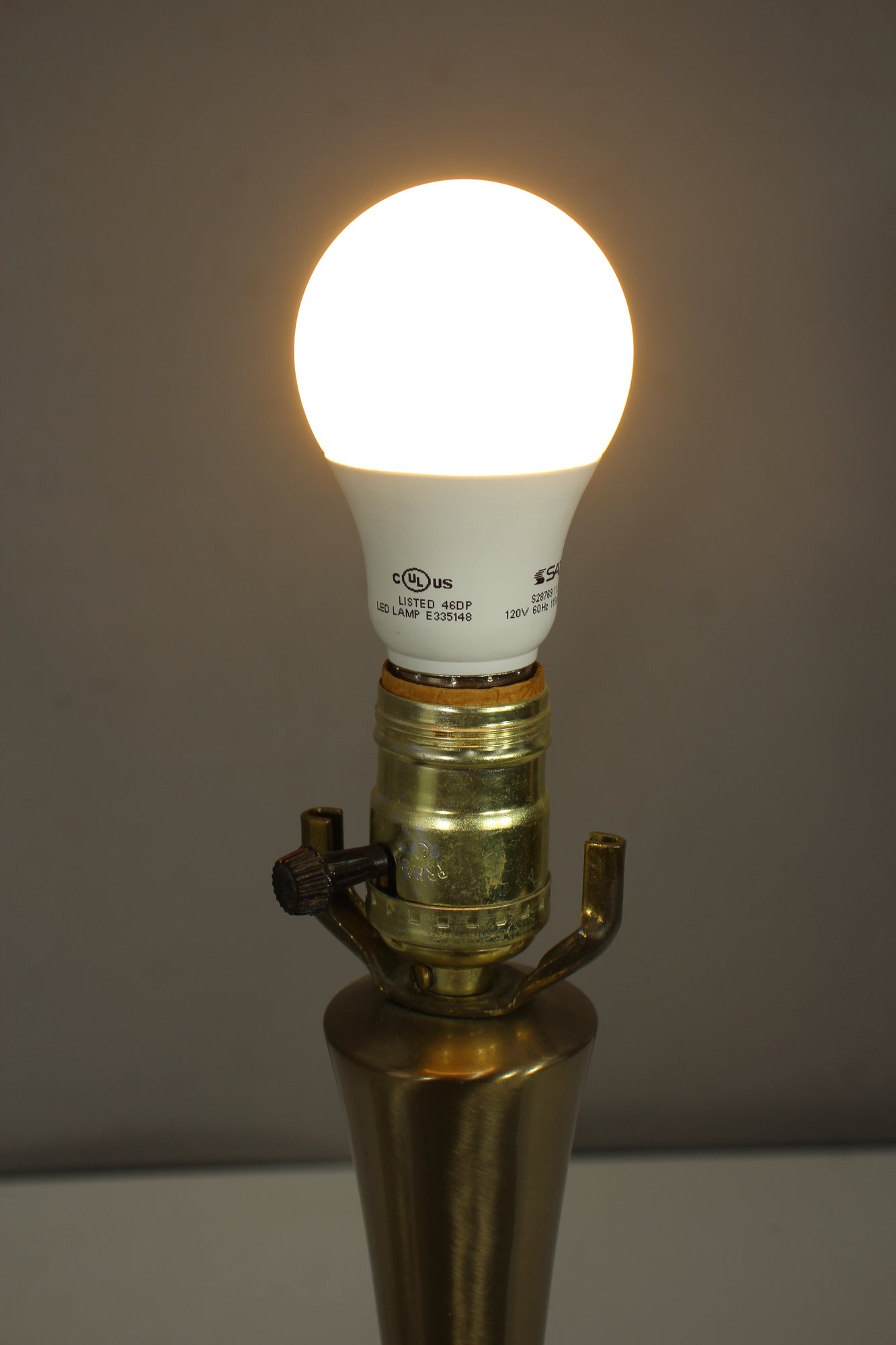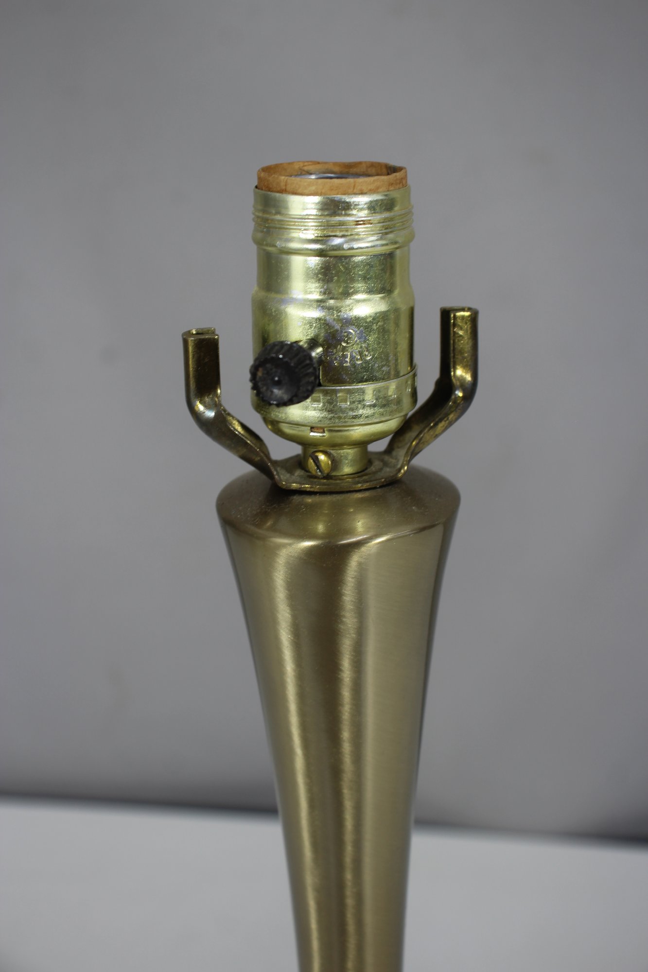 The lamp is in working condition, as shown in the photos, and has a felt-lined base to protect surfaces. Perfect for mid-century, modern, or minimalist interiors, this lamp adds a touch of vintage charm with its organic, fluid shape. Some minor patina and wear are present, consistent with age. Lampshade not included.