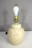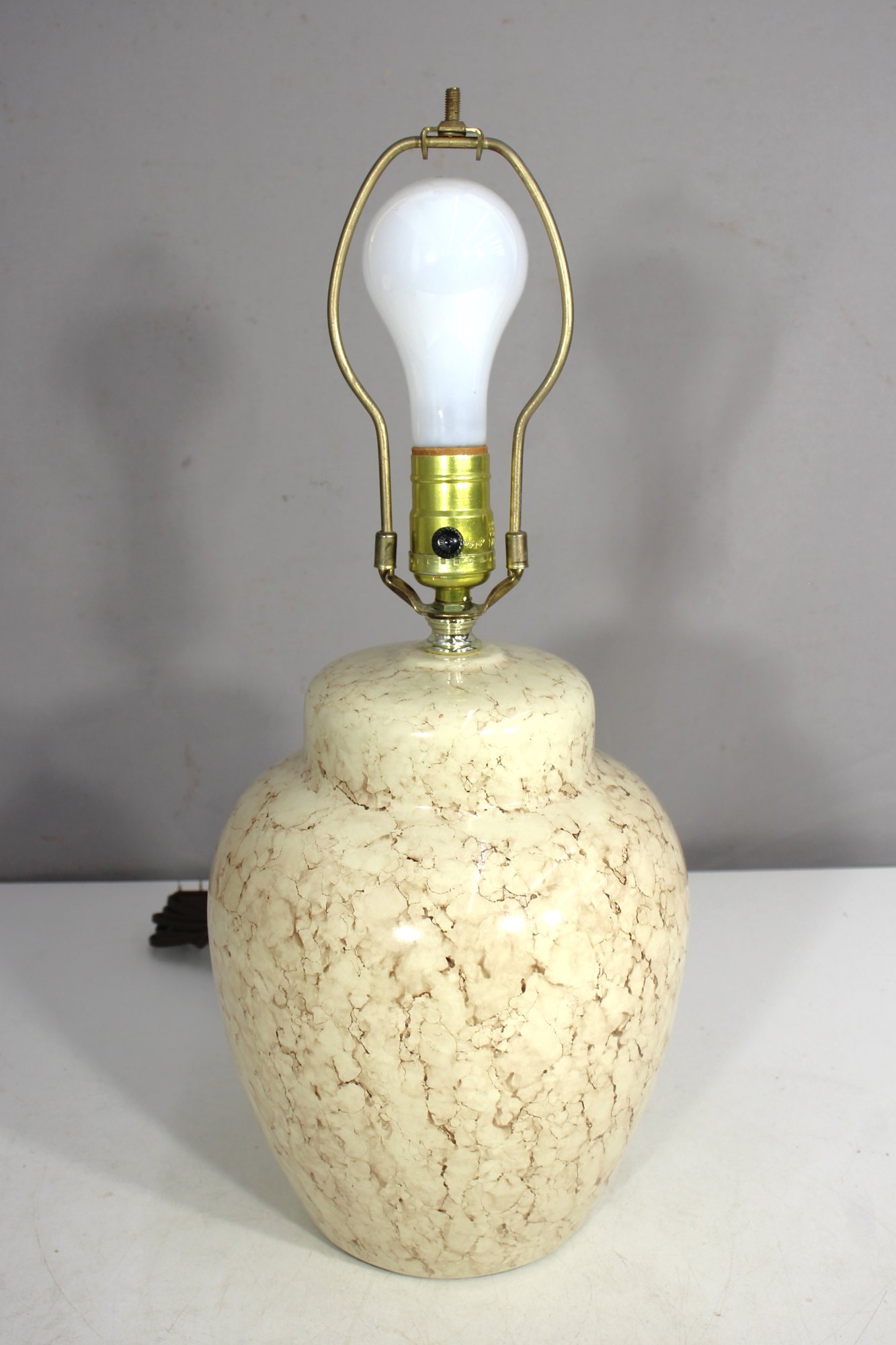 This vintage 19-inch ceramic table lamp features a classic marbleized crackle finish in a neutral beige tone, making it a timeless and versatile accent piece for any home or office. The lamp’s rounded vase-like body is complemented by a brass harp and socket, providing a simple yet elegant design.