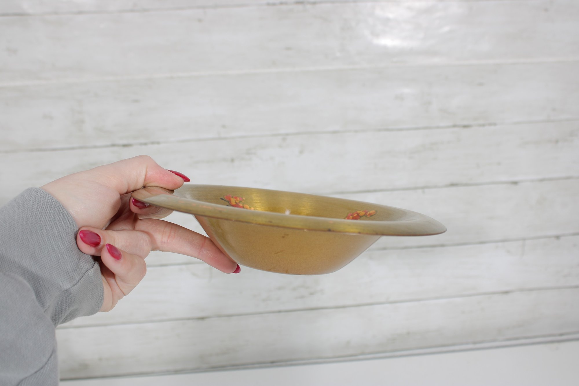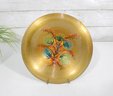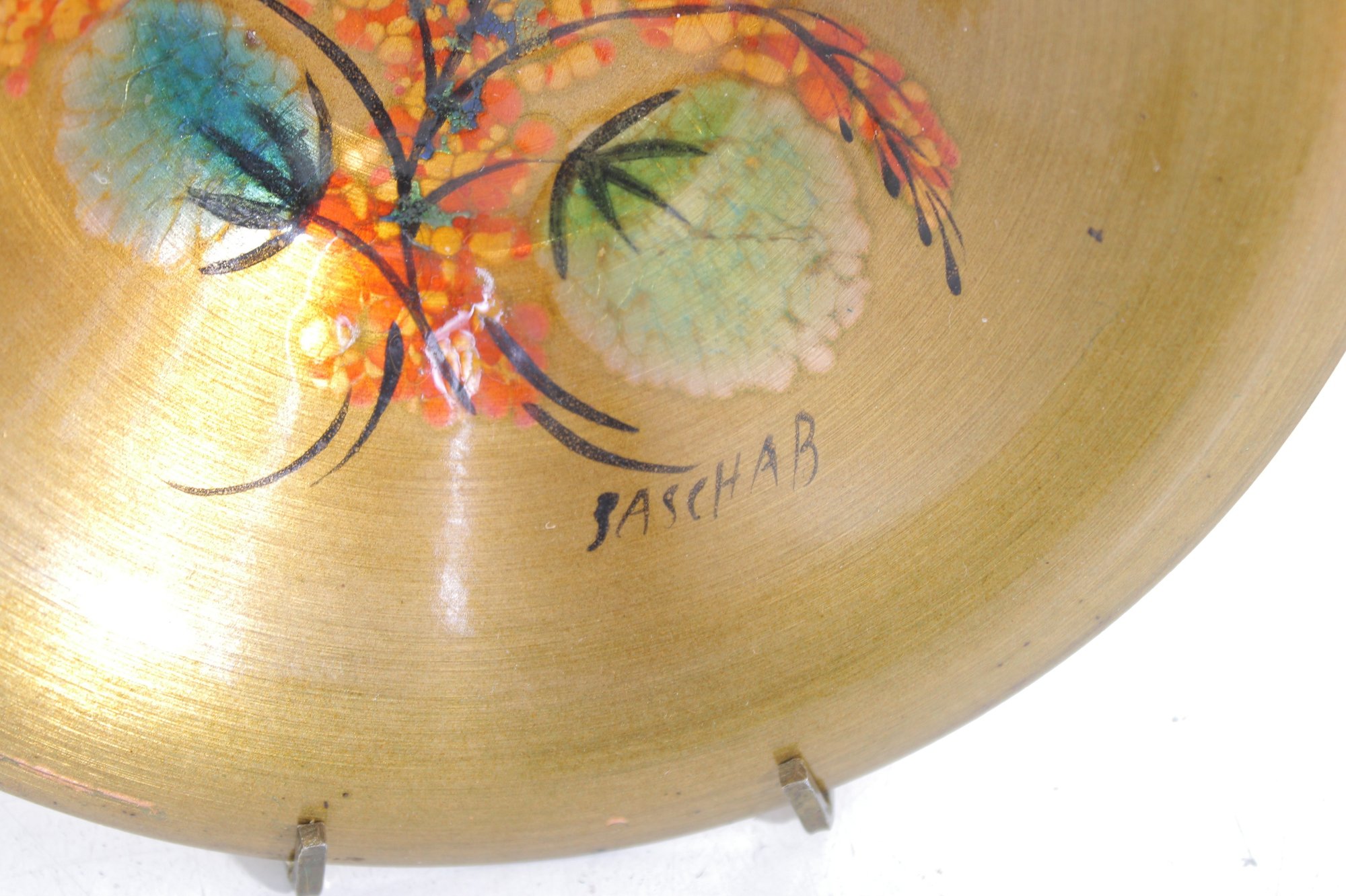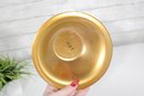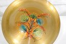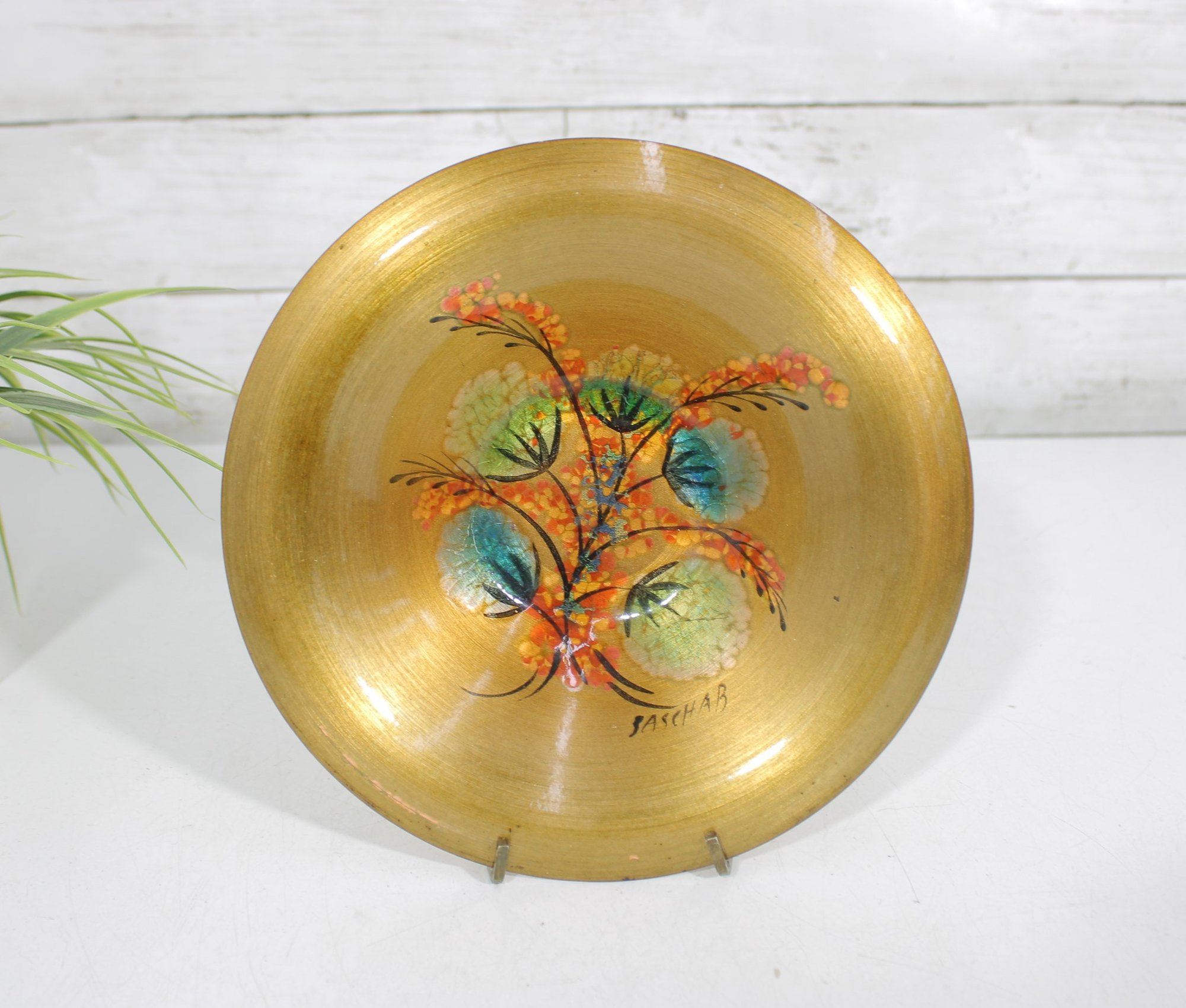 Beautiful vintage mid-century modern console bowl designed by renowned artist Sascha Brastoff, dating to circa 1950s. This striking piece features a hand-painted enamel design on copper with a radiant gold-toned finish. The interior showcases an abstract floral motif in vibrant hues of orange, teal, and green, accented by delicate black linework—classic of Brastoff’s distinctive style.