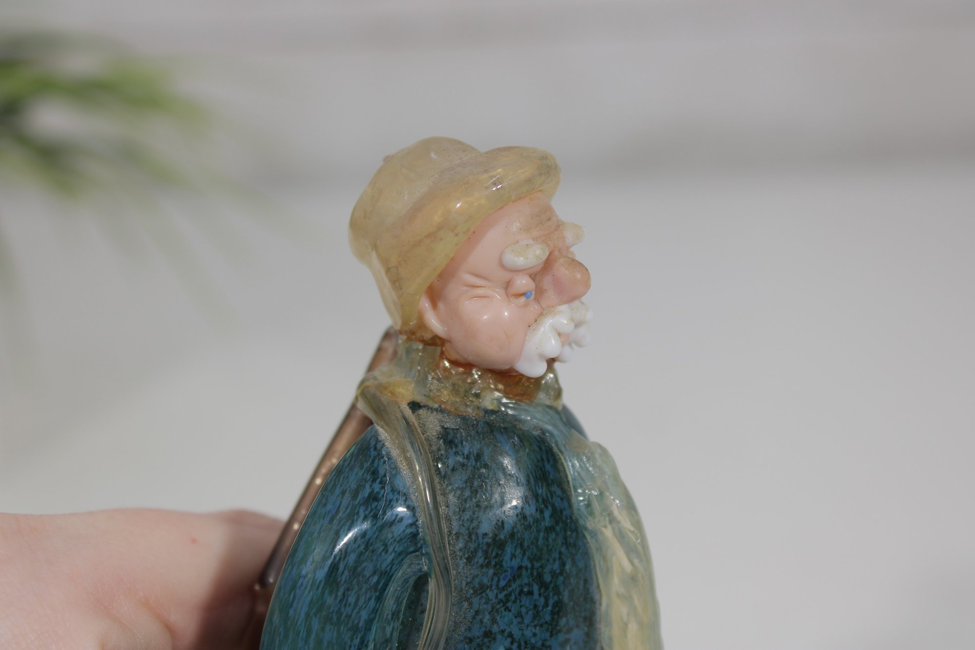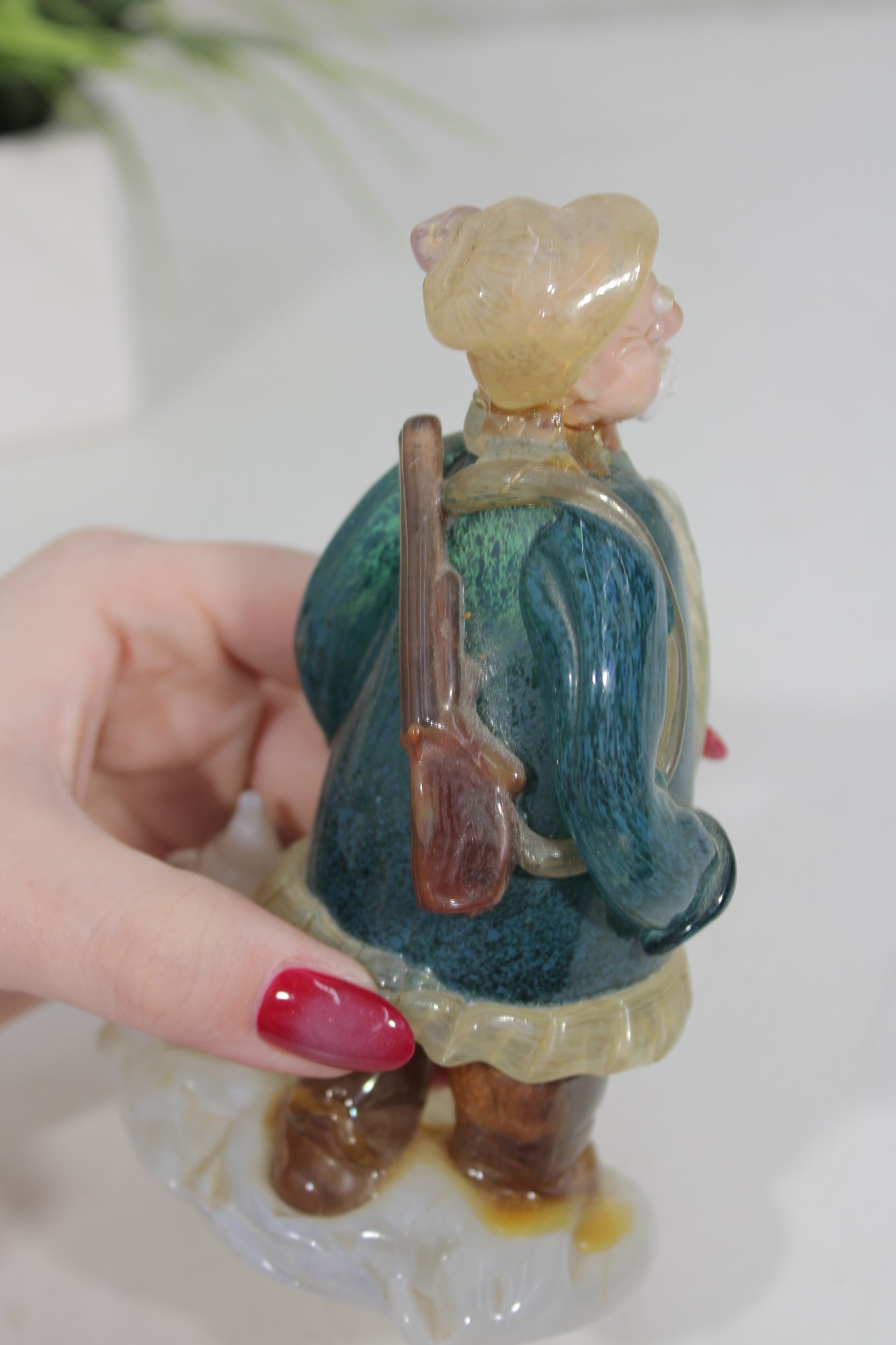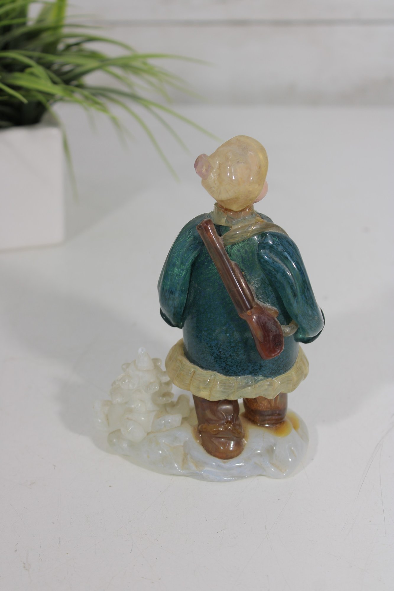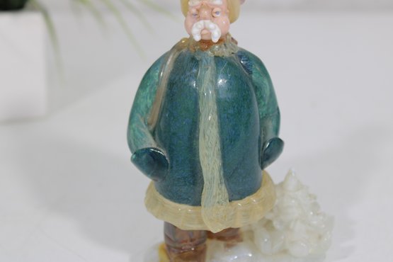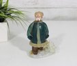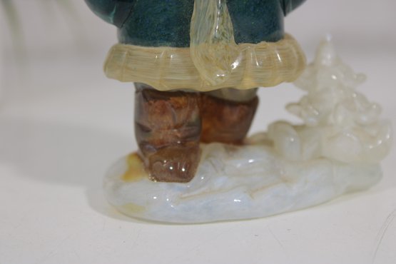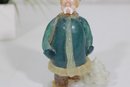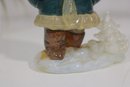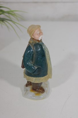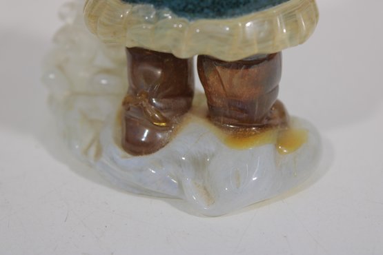vintage hunter figurine, dating to approximately the 1950s–1960s. This hand-painted ceramic statuette depicts a bundled outdoorsman in winter attire, complete with coat, hat, and boots, standing on a snowy base with a small tree detail.