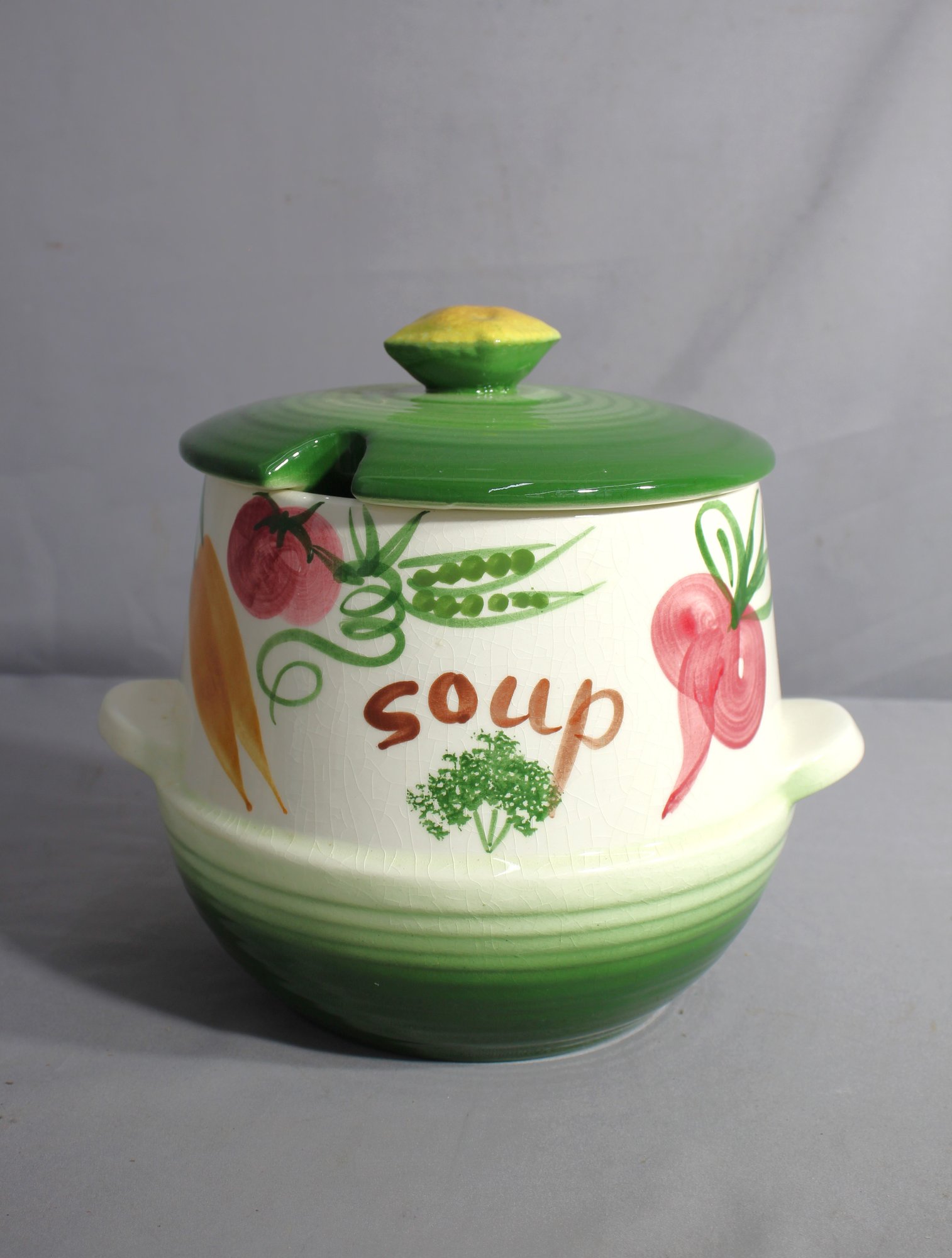 This mid-century ceramic piece boasts a lively vegetable motif, featuring hand-painted renderings of radishes, carrots, peas, and the word 'soup' in a playful font.