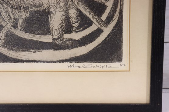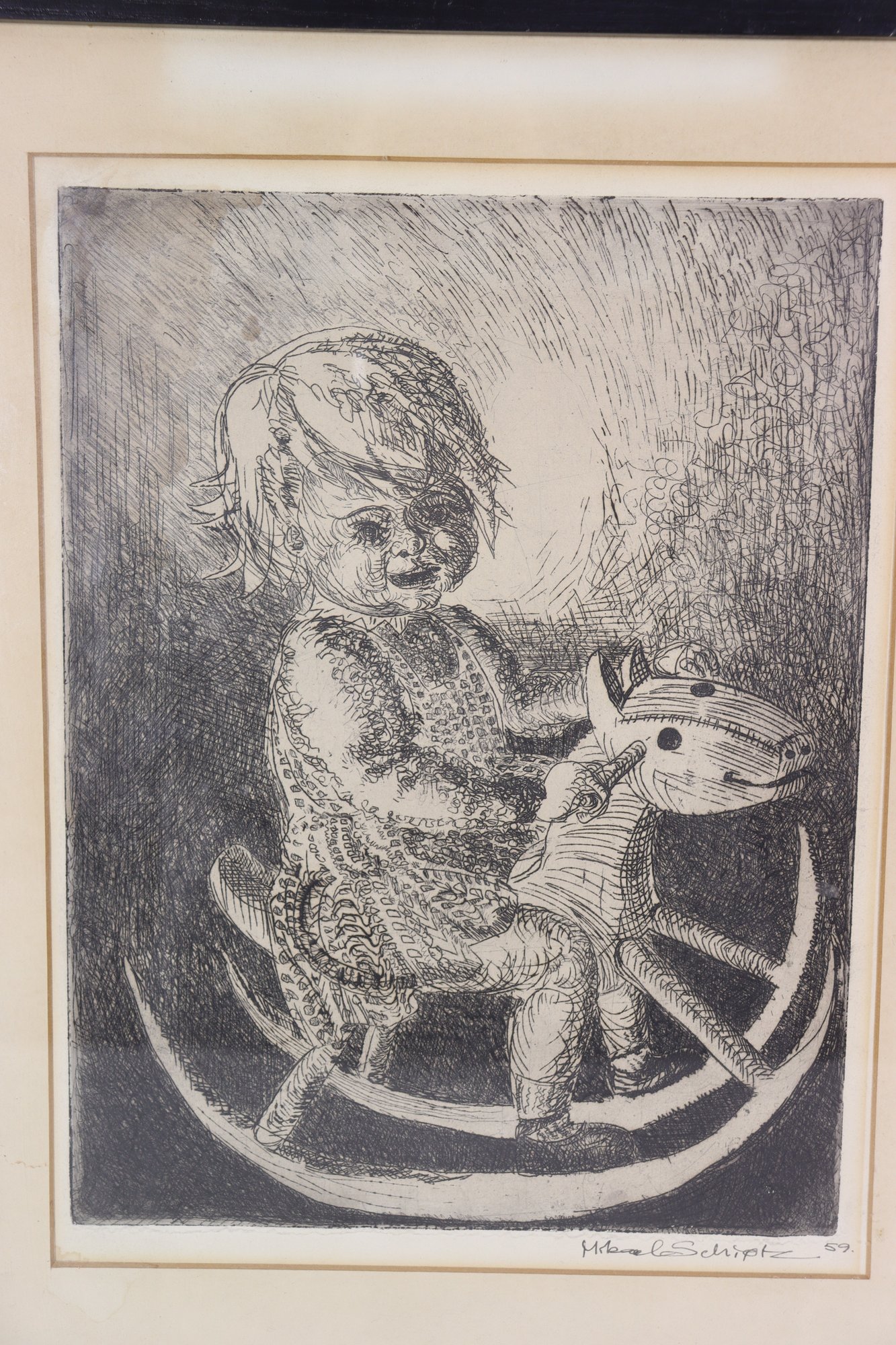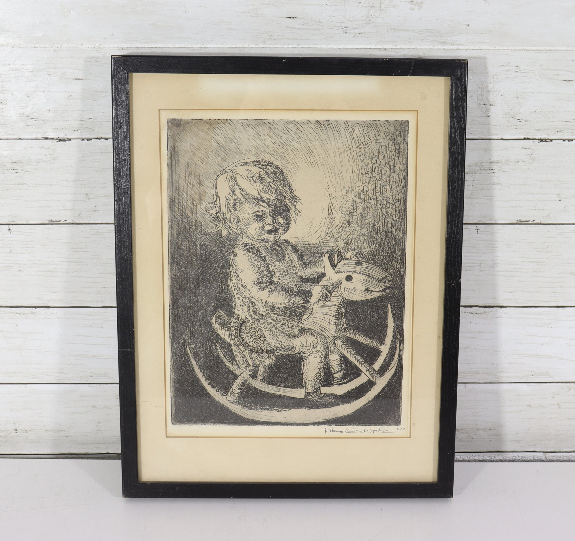 The artwork is signed and dated “M. Schiptz ’59” in the lower margin, adding collector appeal. The composition balances softness and texture, with careful attention to the child’s expression, clothing, and the curved motion of the rocking horse beneath.