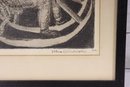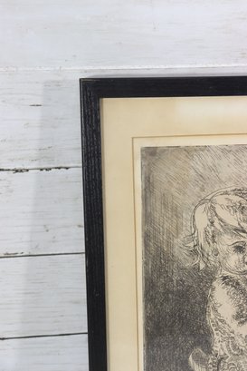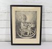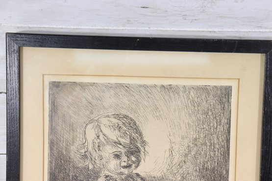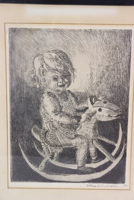 a charming vintage etching dated 1959, depicting a young child seated on a classic rocking horse. The image captures a timeless moment of childhood innocence, rendered with expressive line work and rich tonal contrast characteristic of mid-20th-century etching.