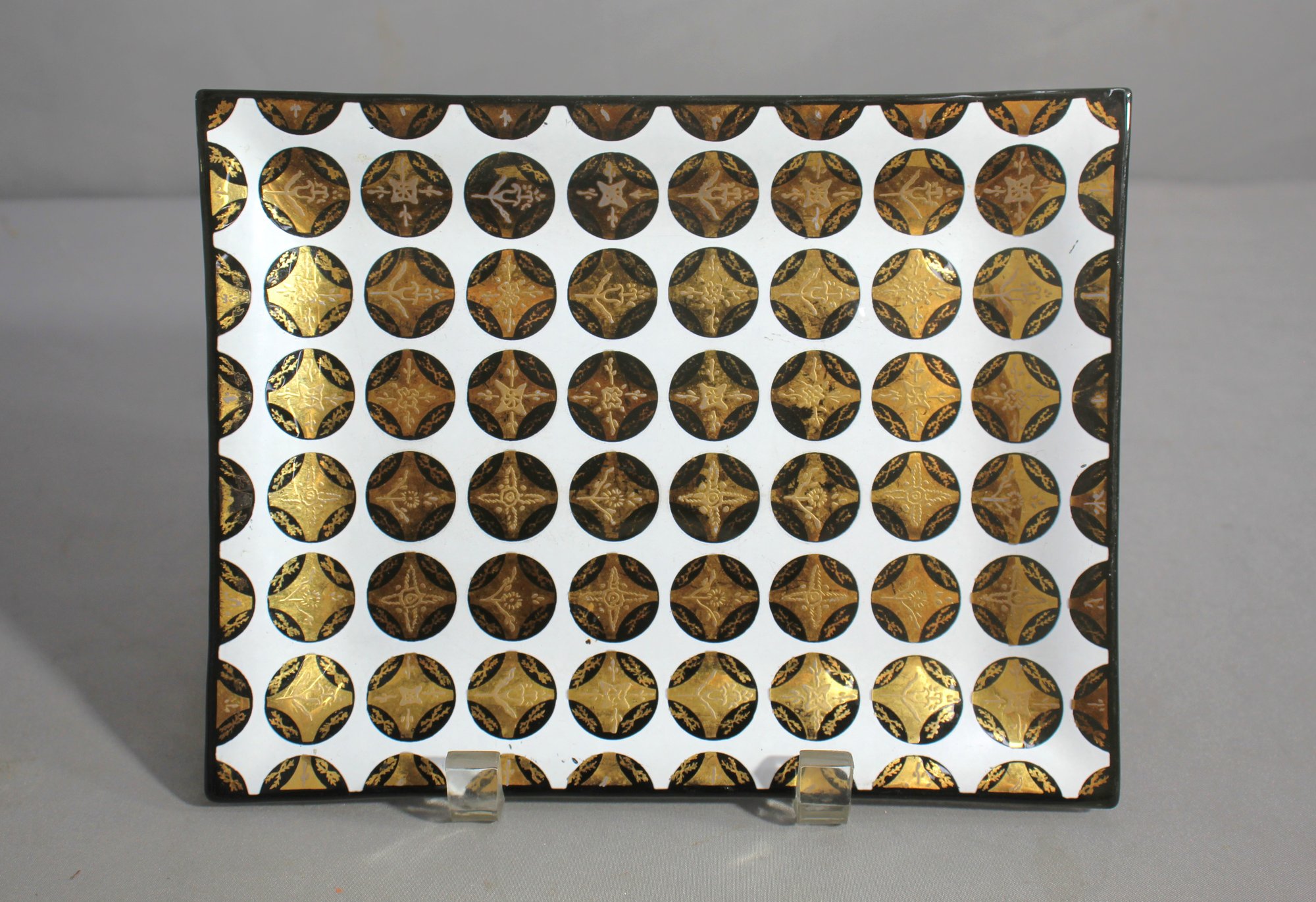 1960s features a mesmerizing diamond pattern adorned with gold and brown tones. The reflective quality of the gold embellishments creates a dazzling visual effect, making it a sophisticated and eye-catching addition to any collection. Measuring 7" x 9", this piece perfectly captures the elegance and style of the mid-century modern era. Ideal for holding jewelry, keys, or as a standalone decorative item