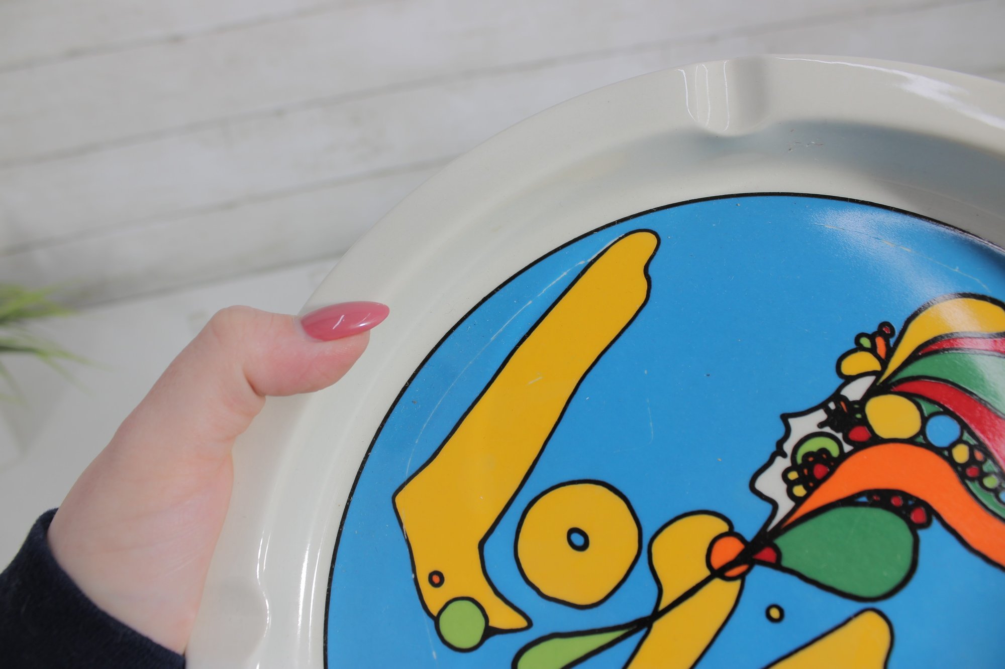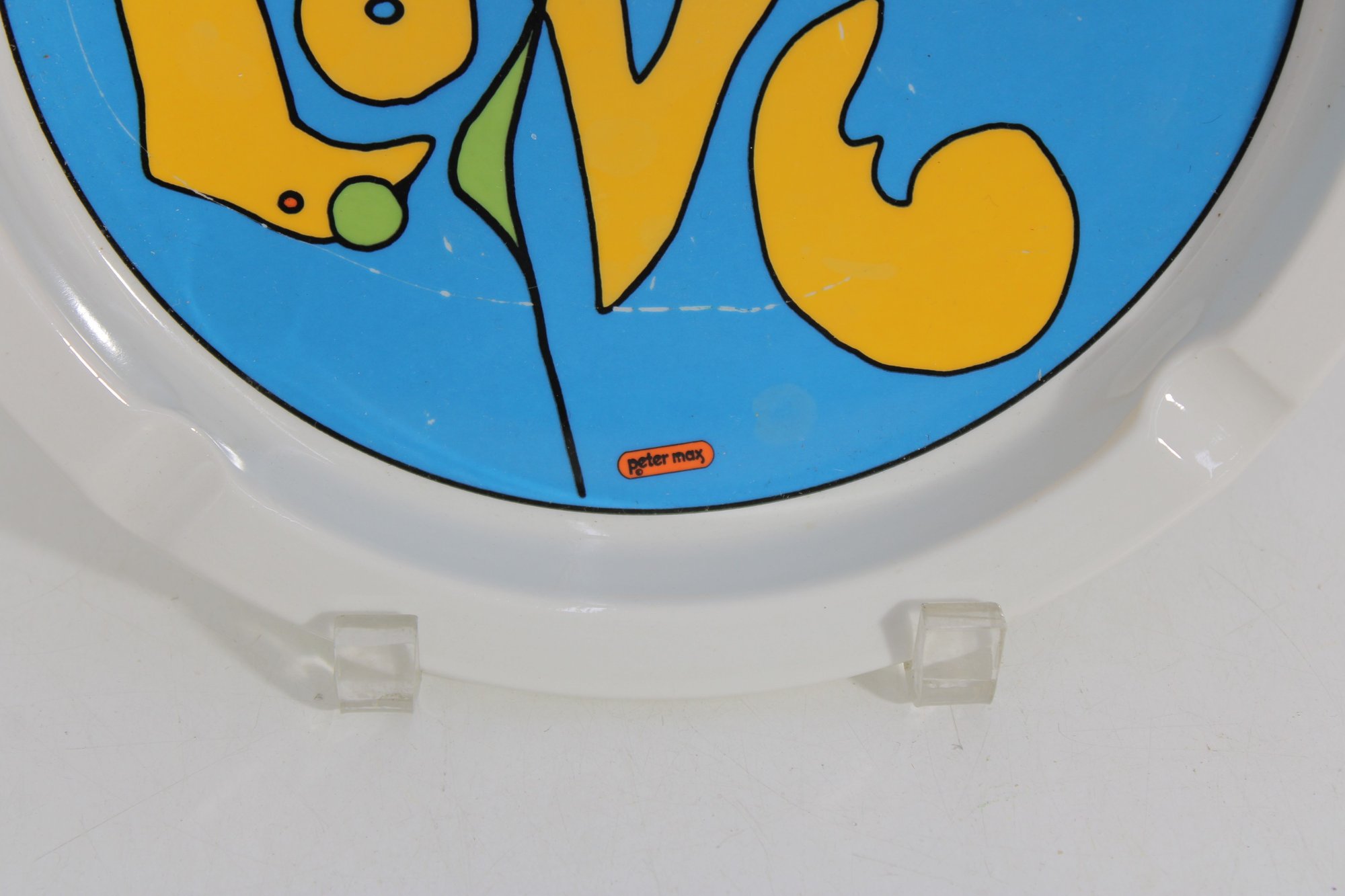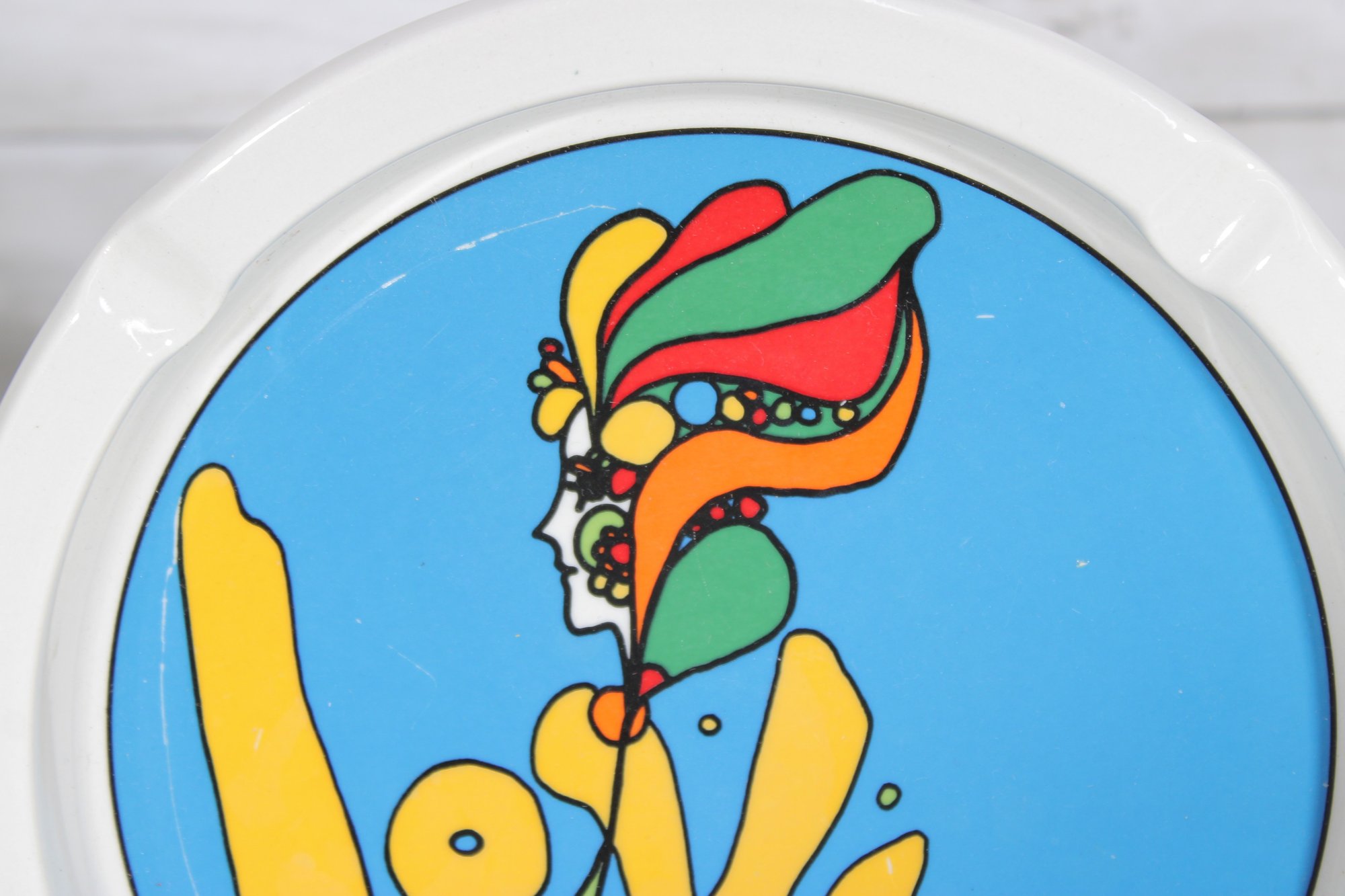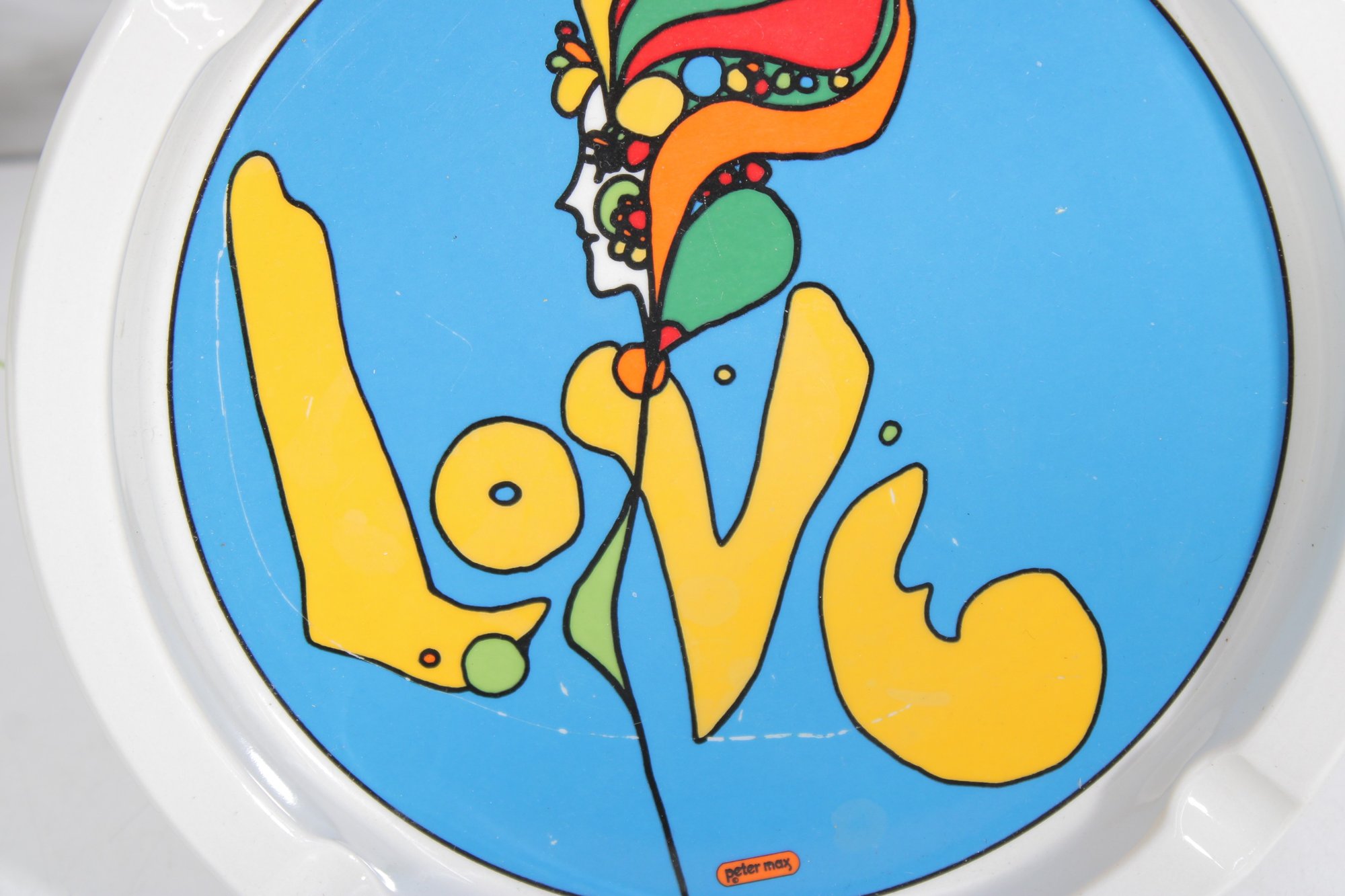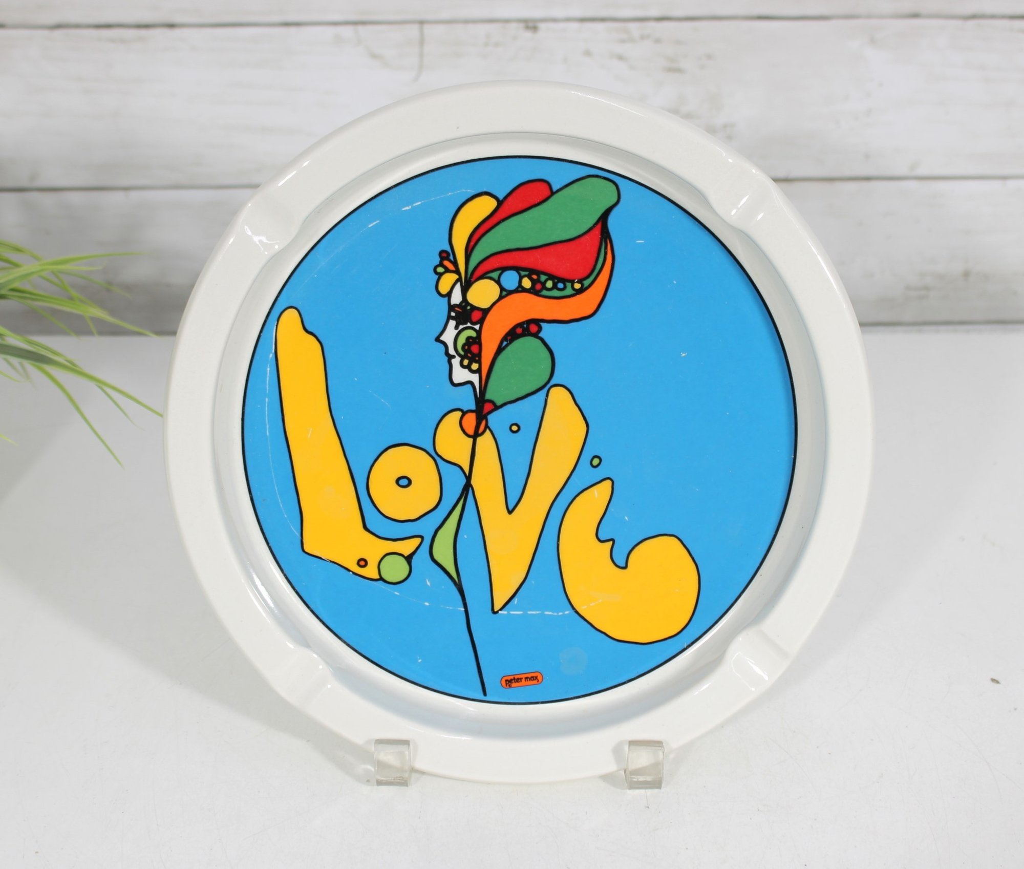 a vibrant and highly collectible vintage 1960s Peter Max “LOVE” ashtray, produced by Iroquois China of Syracuse, New York. This iconic piece features Max’s bold pop art design with bright colors and psychedelic styling, capturing the spirit of the era perfectly.