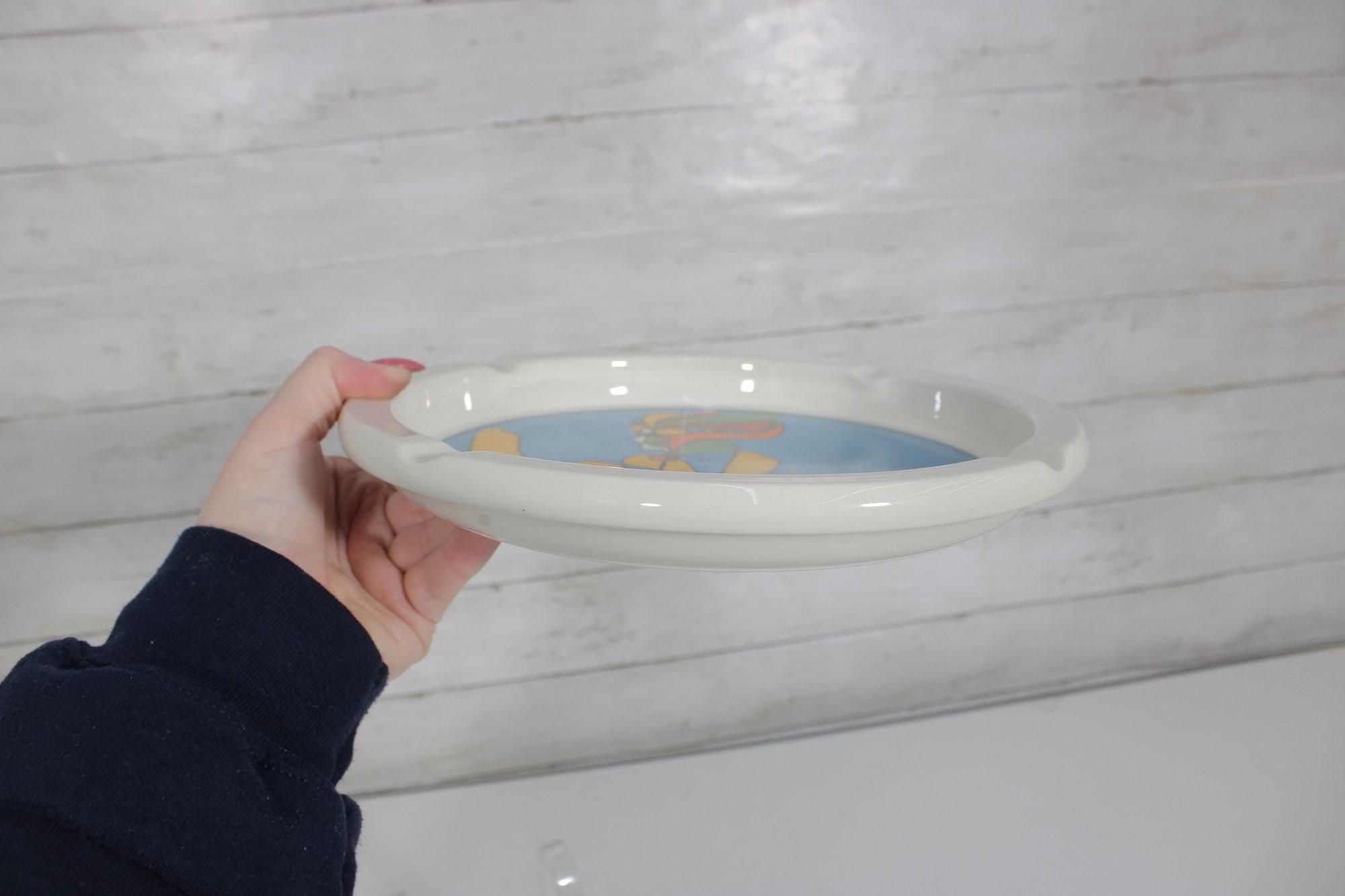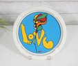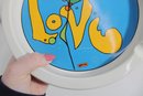 Measuring approximately 10 inches in diameter, this large ashtray is made of durable china with a glossy white rim and a striking central graphic in vivid blue, yellow, red, and green. The stylized “LOVE” design is instantly recognizable and remains a standout piece for collectors of pop art and mid-century memorabilia.
