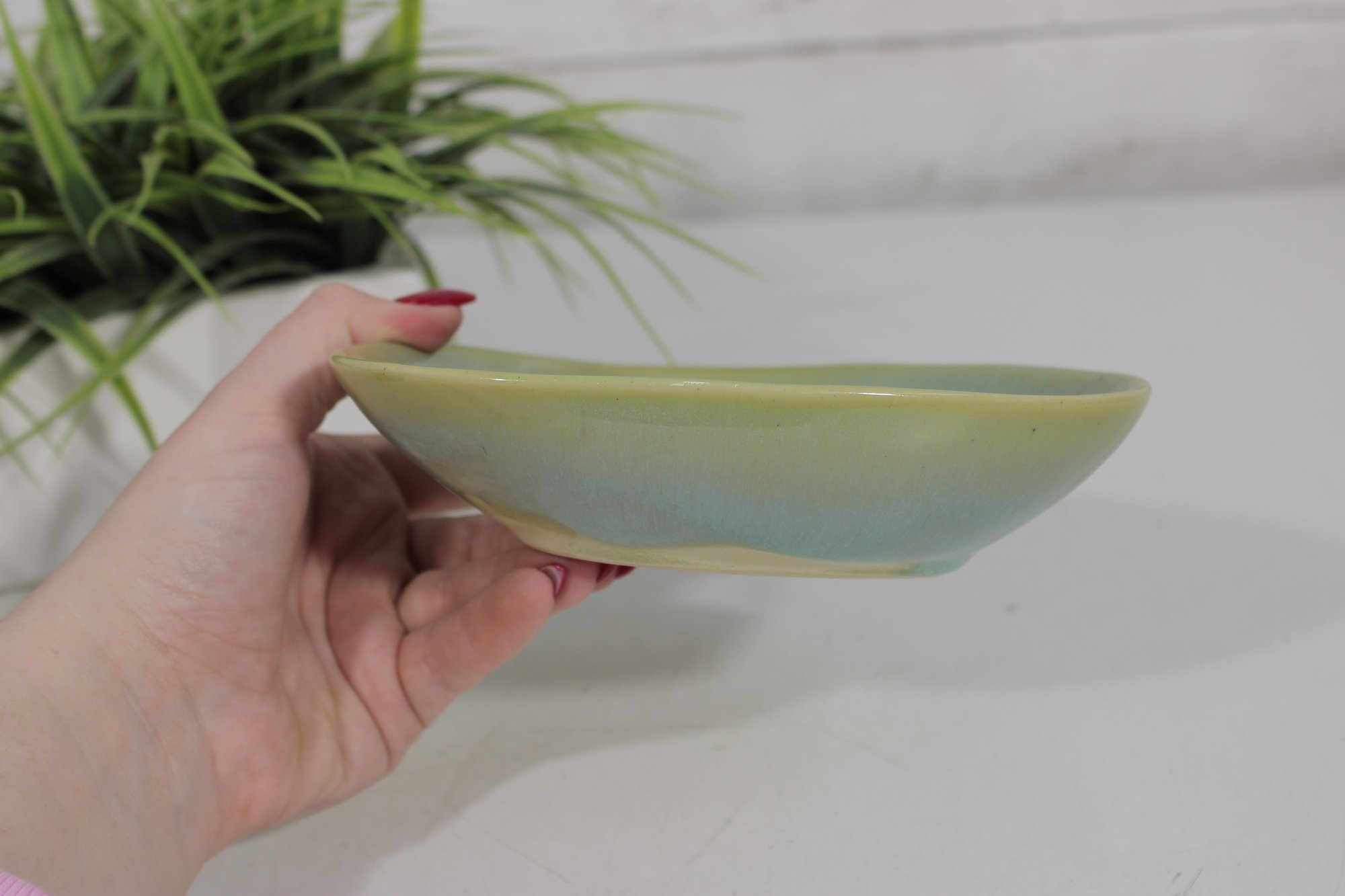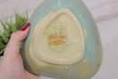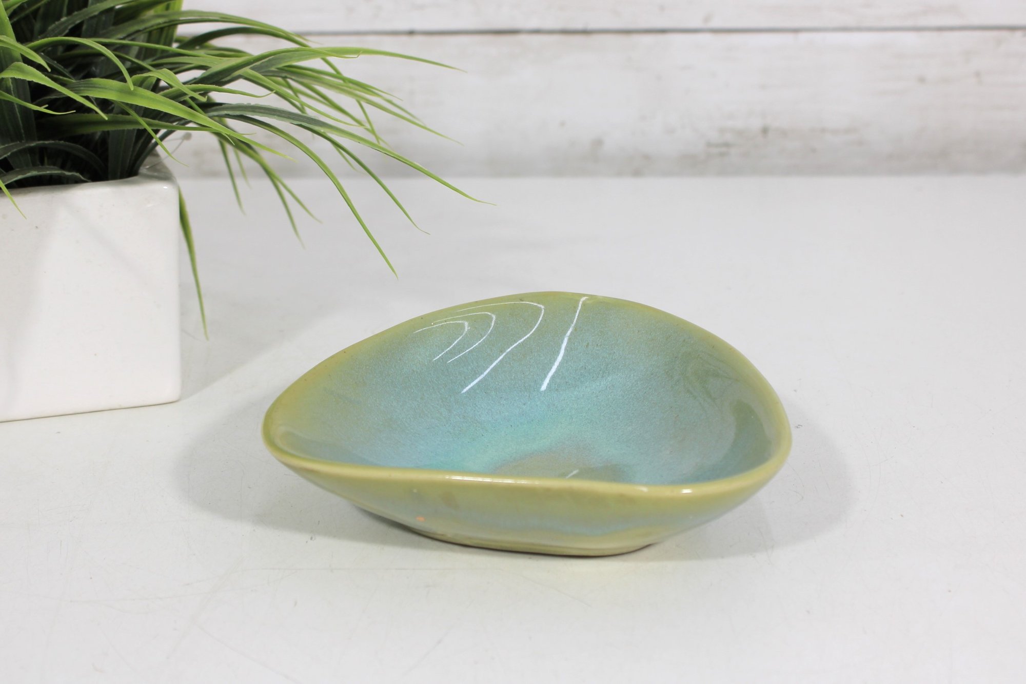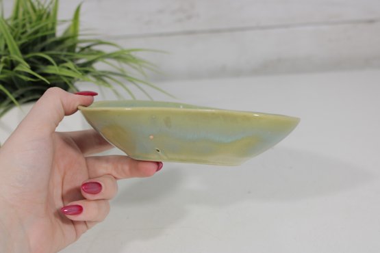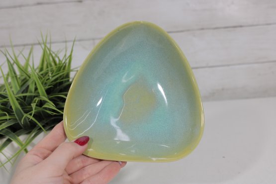a charming vintage studio pottery bowl dated 1967, featuring a distinctive triangular form with softly rounded edges. This mid-century modern piece displays a beautiful blend of soft green and blue glazes with subtle tonal variation, giving it a calm and organic aesthetic.