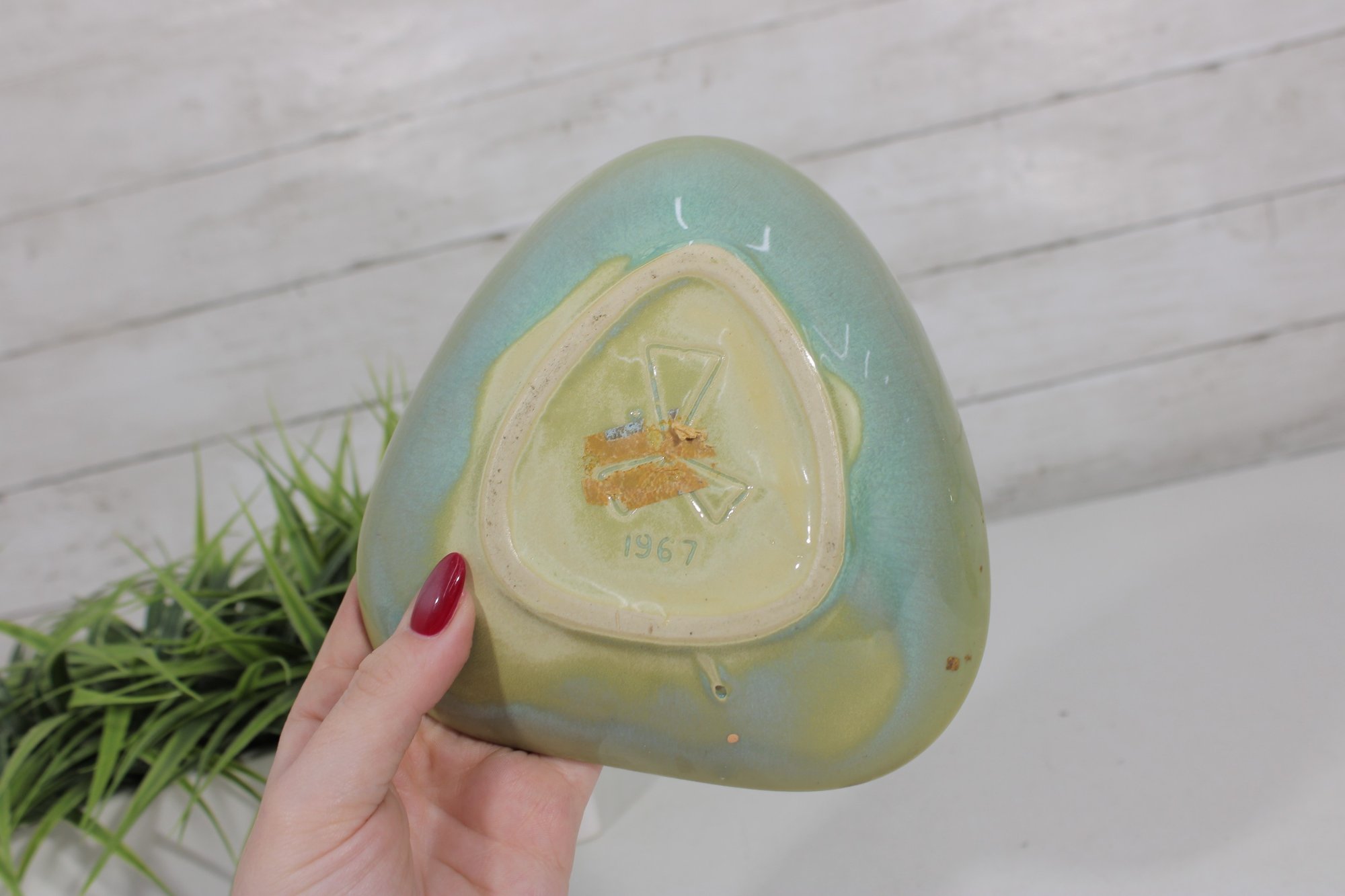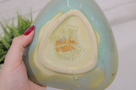 The underside is impressed with a maker’s mark and clearly dated 1967, adding to its collectible appeal. Its unique shape makes it perfect as a decorative accent, small serving dish, or display piece.