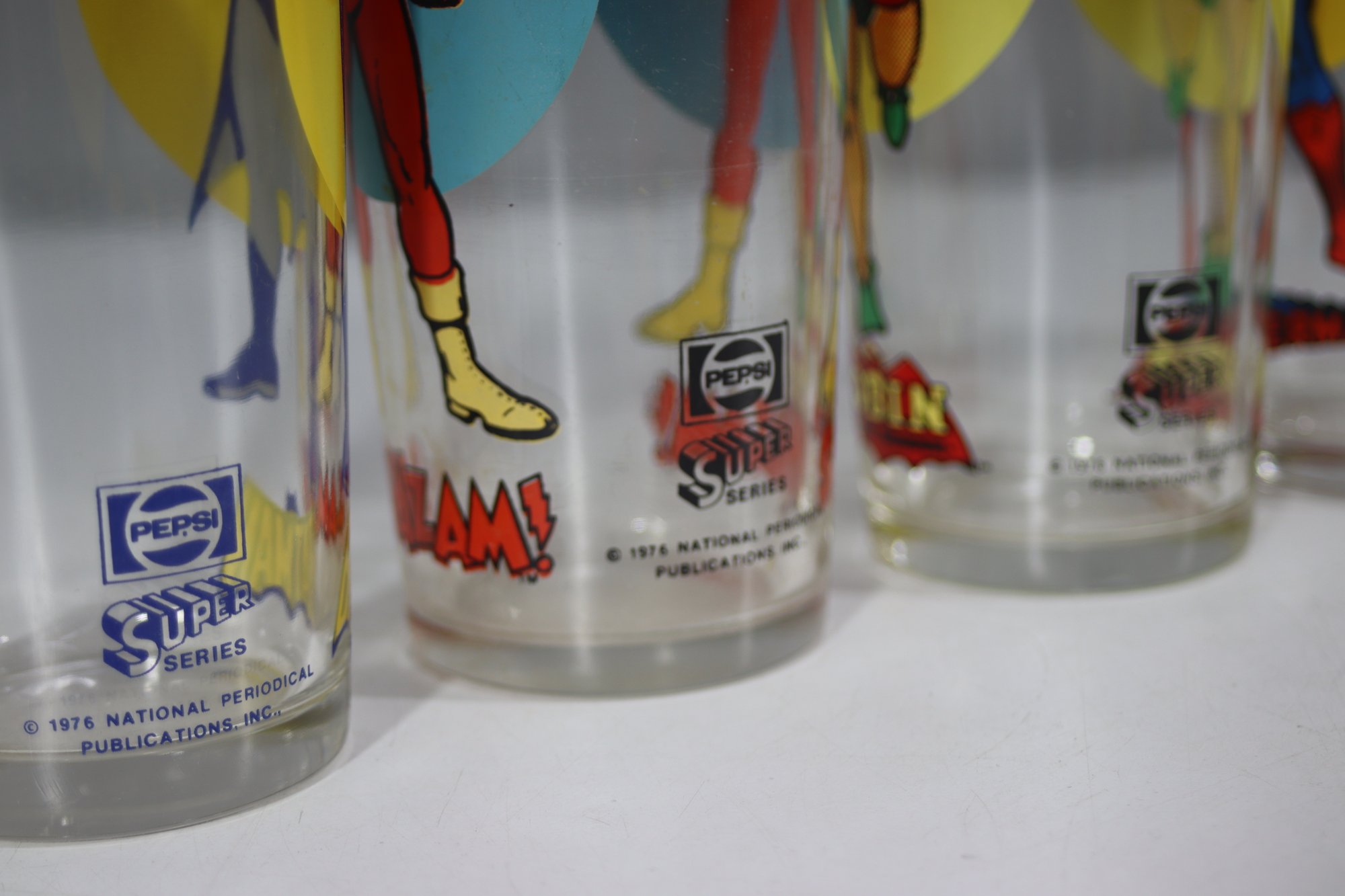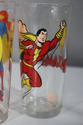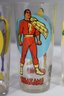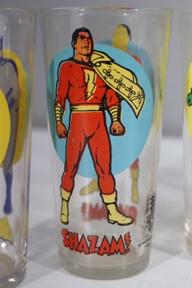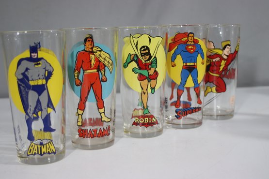 This is a rare and collectible set of five vintage 1976 Pepsi Super Series glasses featuring iconic DC Comics superheroes. The set includes Batman, Superman, Robin, Shazam, and Captain Marvel, all beautifully illustrated with bright, vibrant colors. Each glass is officially licensed by DC Comics and branded with the Pepsi logo.