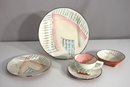 a visually elegant and highly collectible 5-piece place setting by noted ceramic artist Patrick Loughran, signed and dated 1984. This hand-painted studio pottery set features a harmonious abstract design in soft blush pink, teal blue, and charcoal, accented by expressive linear detail and finished with a gilded rim for a refined touch.