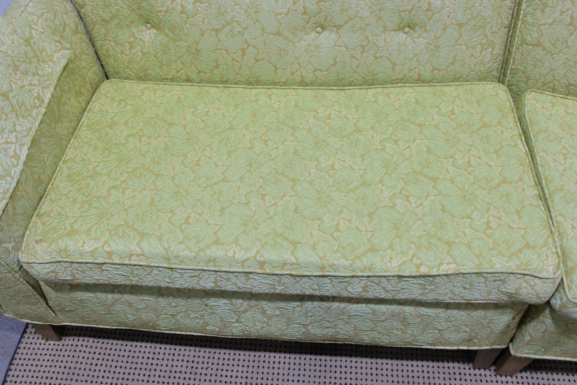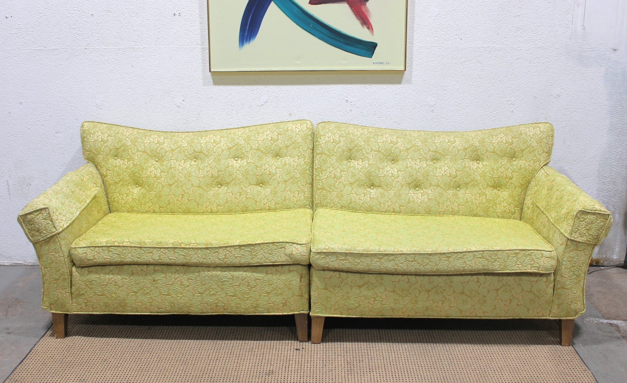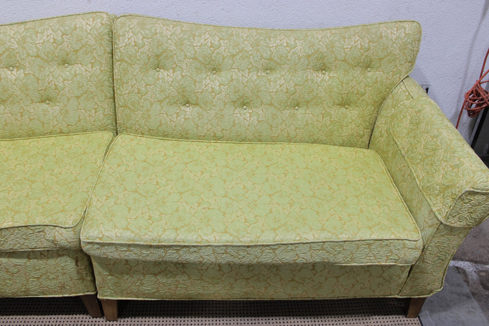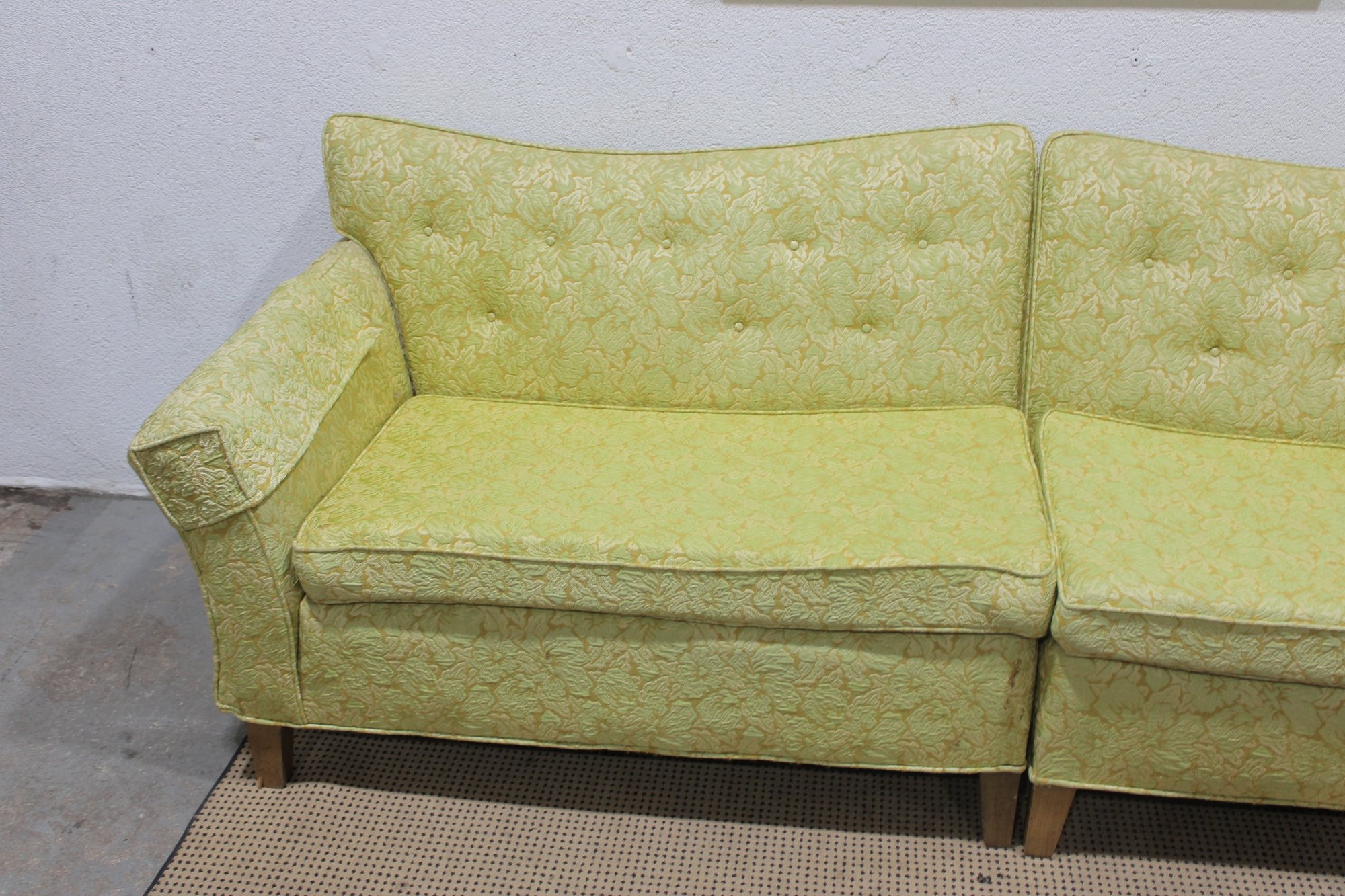 a vintage 2-piece mid-century modern sofa featuring a gently curved, button-tufted back and upholstered in a vibrant light green patterned fabric. This modular design allows the two sections to be arranged together as a full-length sofa or separated for flexible seating options.