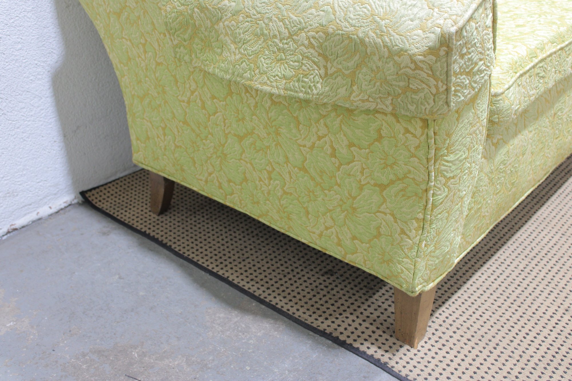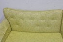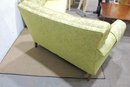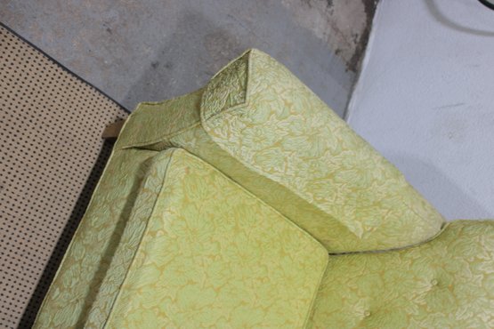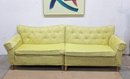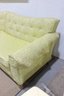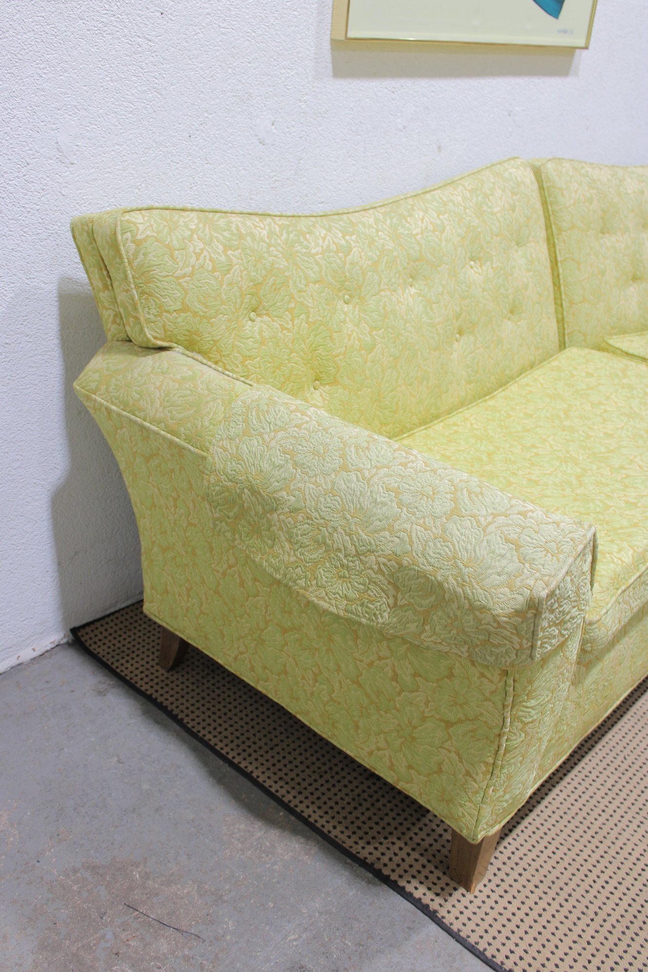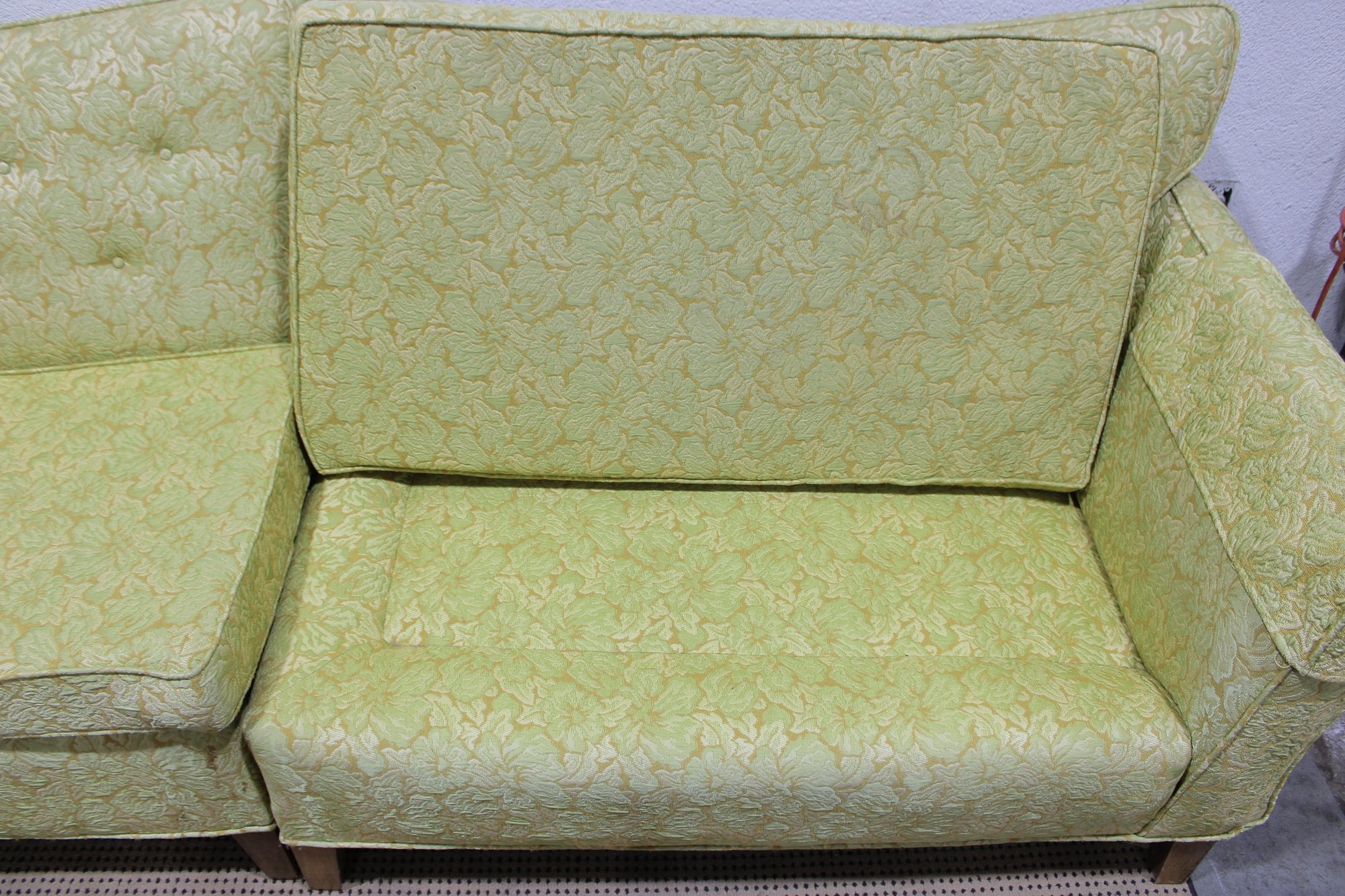 a vintage 2-piece mid-century modern sofa featuring a gently curved, button-tufted back and upholstered in a vibrant light green patterned fabric. This modular design allows the two sections to be arranged together as a full-length sofa or separated for flexible seating options.