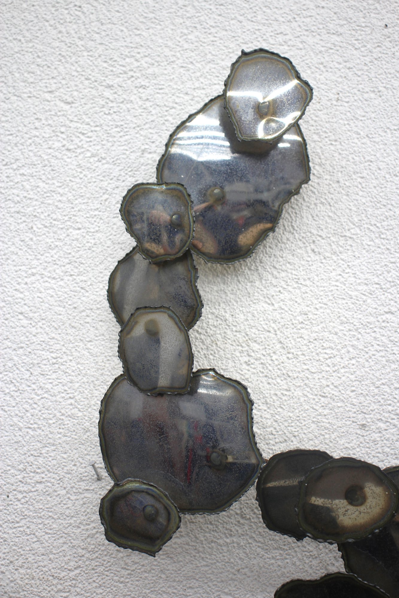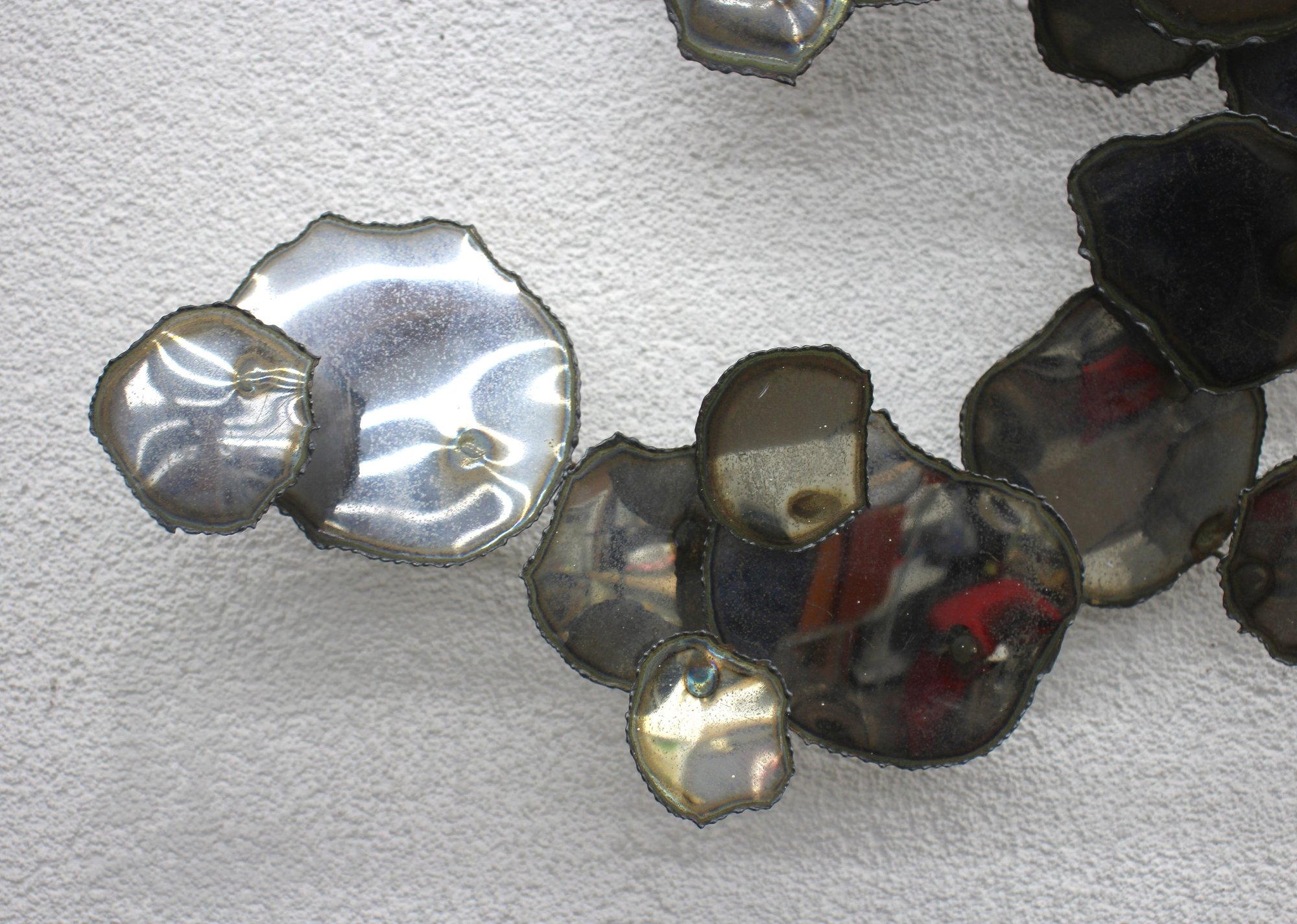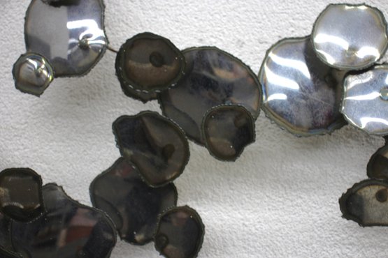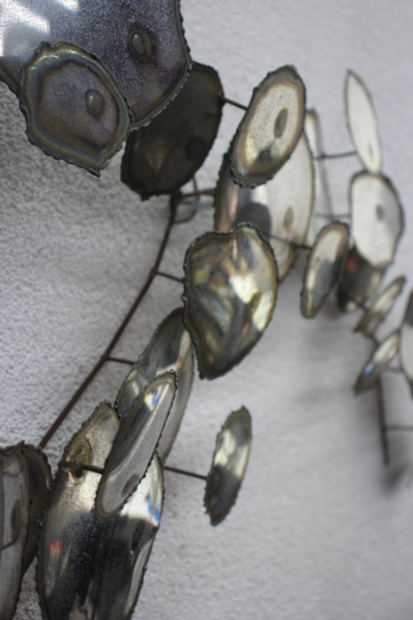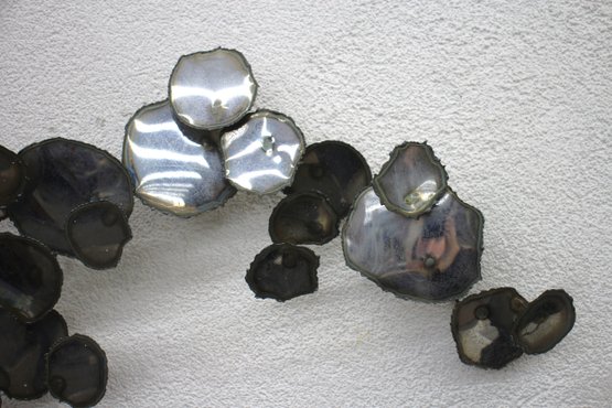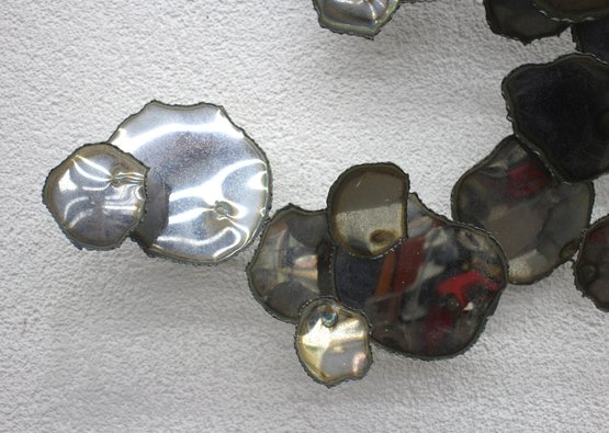 A stunning vintage brutalist metal wall sculpture, measuring 23” x 32”, featuring an organic, free-flowing design with torch-cut metal discs and a sculptural wire frame. This unique mid-century modern-style artwork showcases an industrial yet elegant aesthetic, making it a perfect statement piece for any space.