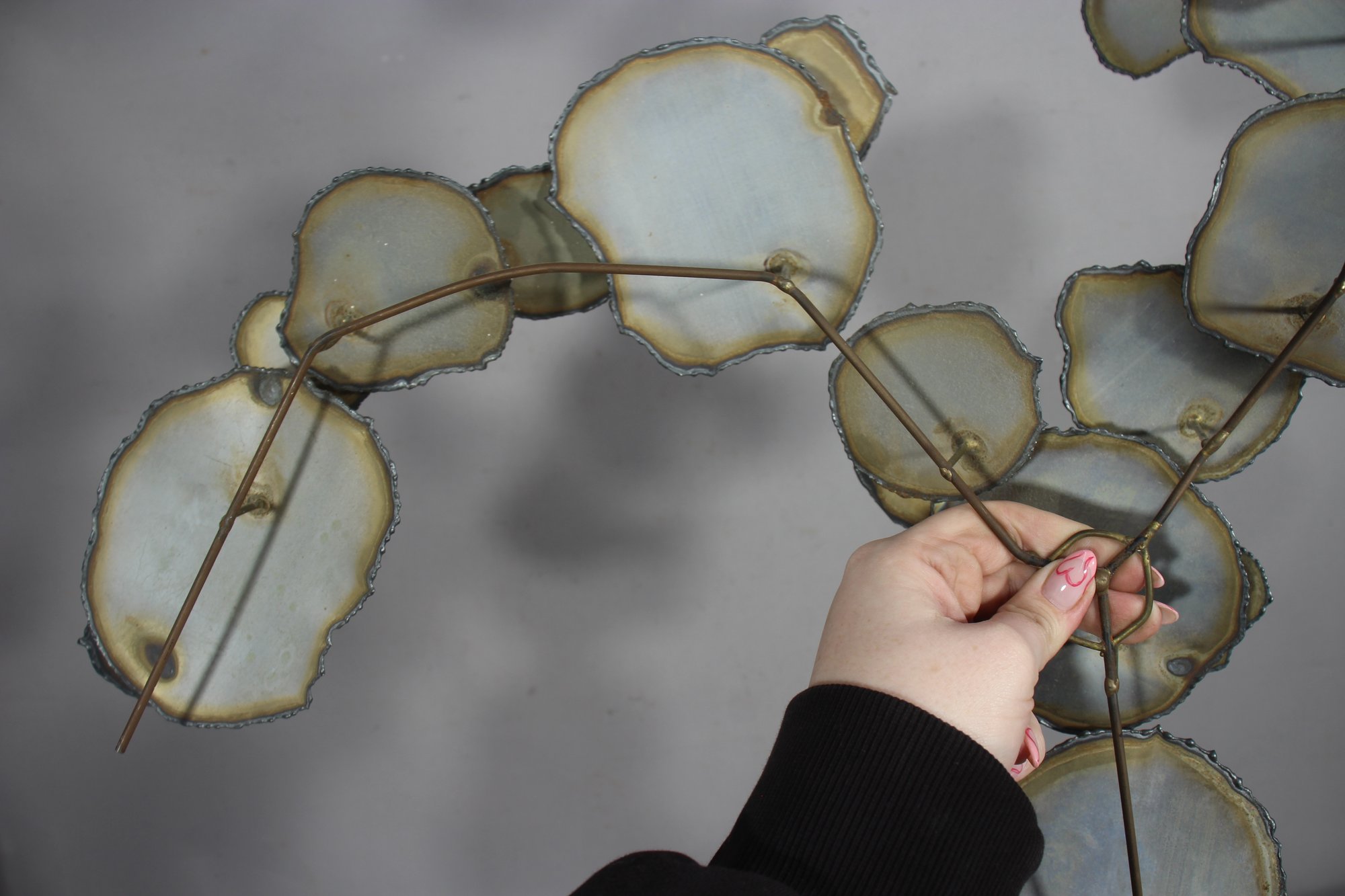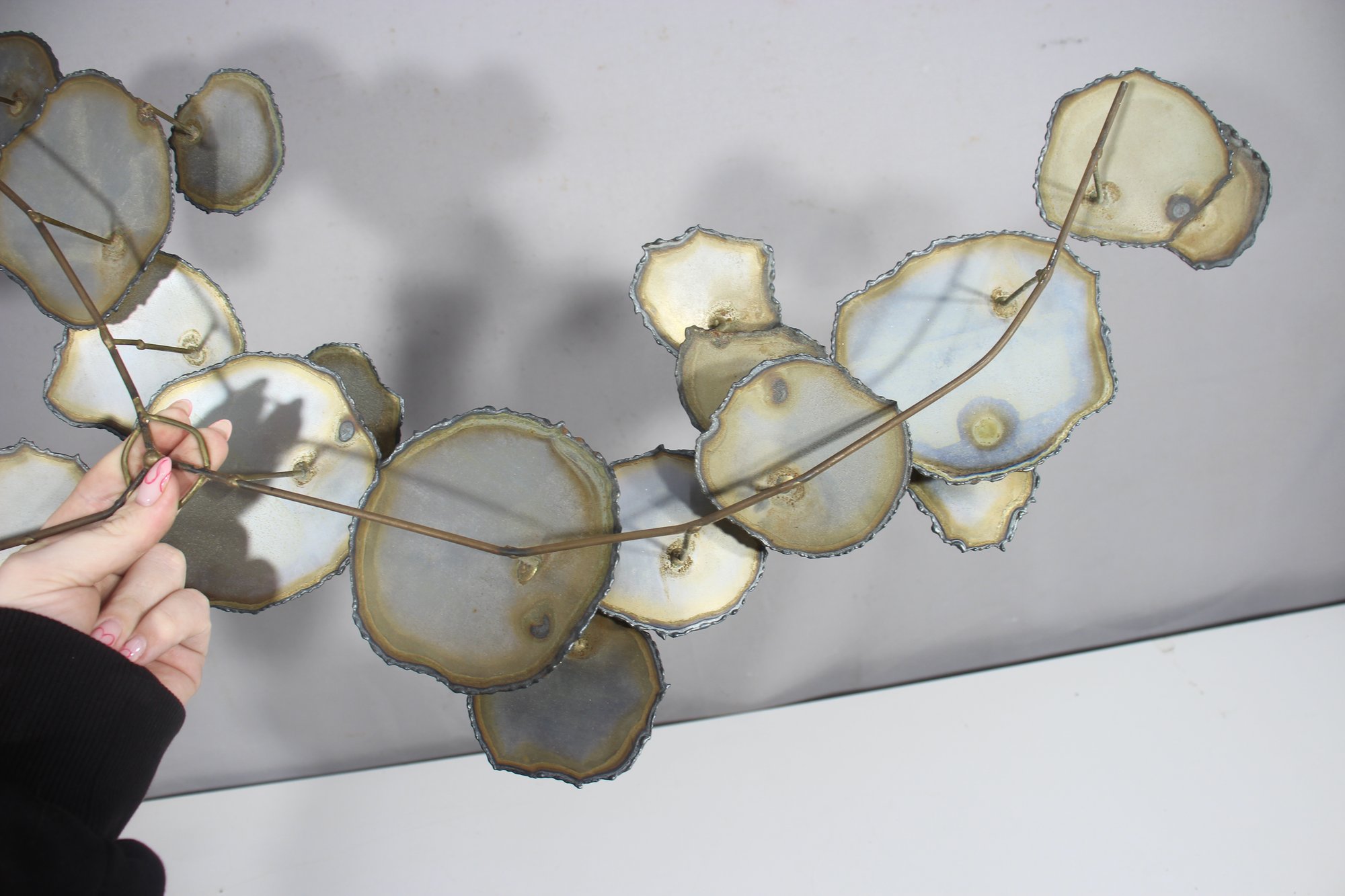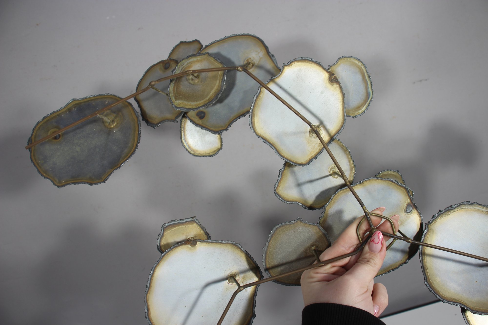 A stunning vintage brutalist metal wall sculpture, measuring 23” x 32”, featuring an organic, free-flowing design with torch-cut metal discs and a sculptural wire frame. This unique mid-century modern-style artwork showcases an industrial yet elegant aesthetic, making it a perfect statement piece for any space.