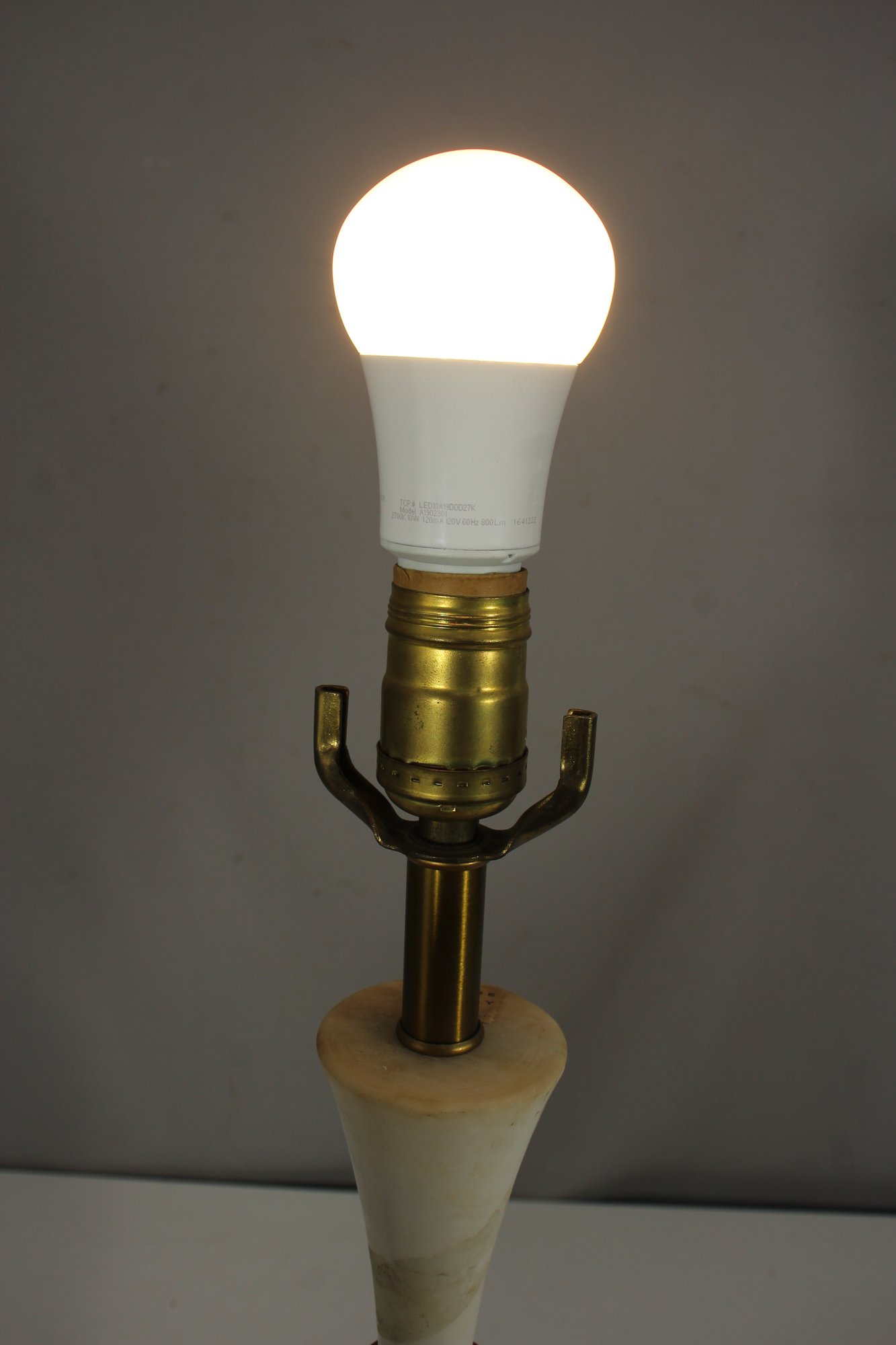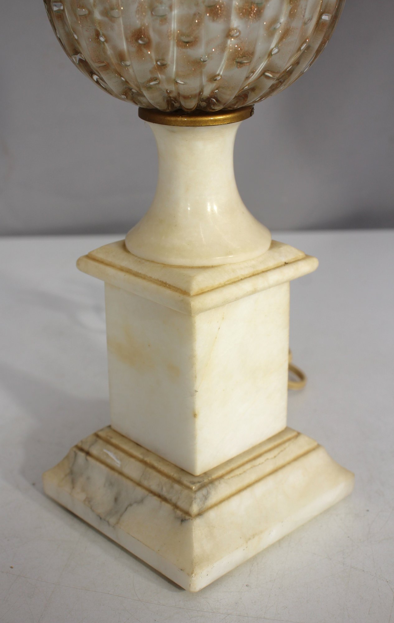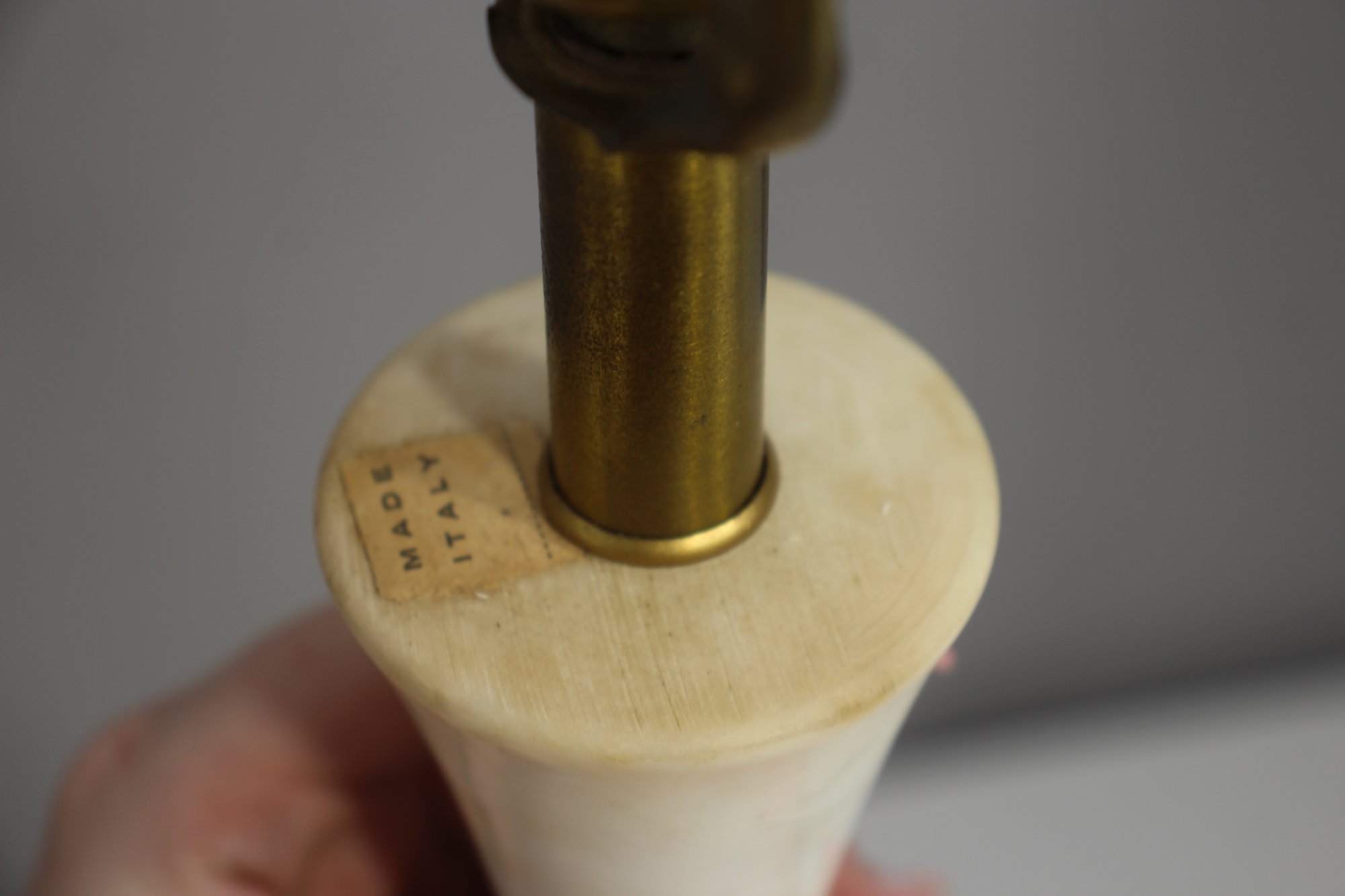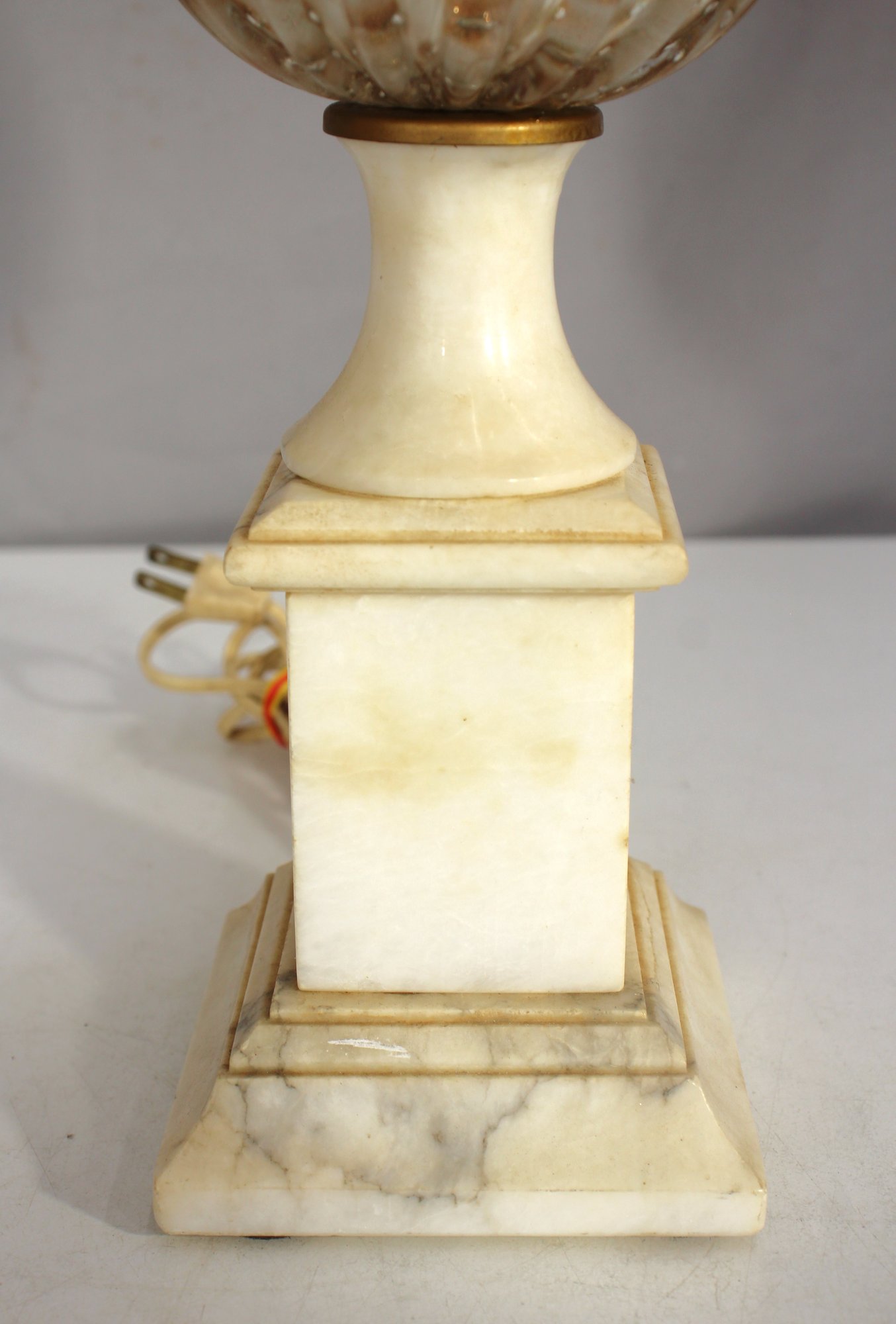 The base and upper sections are crafted from solid marble, showcasing natural veining and a sophisticated presence. The lamp is in working condition, as shown in the photos, and retains its original brass fittings.