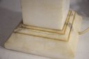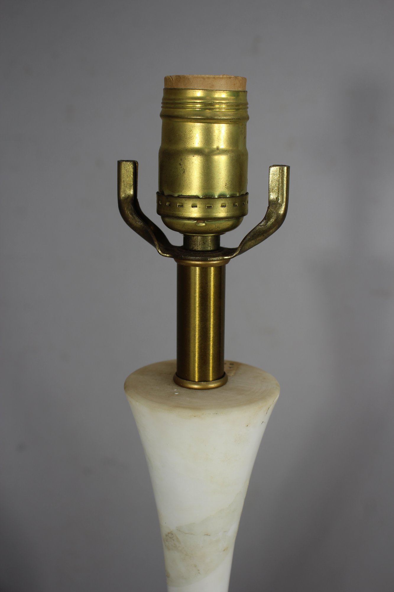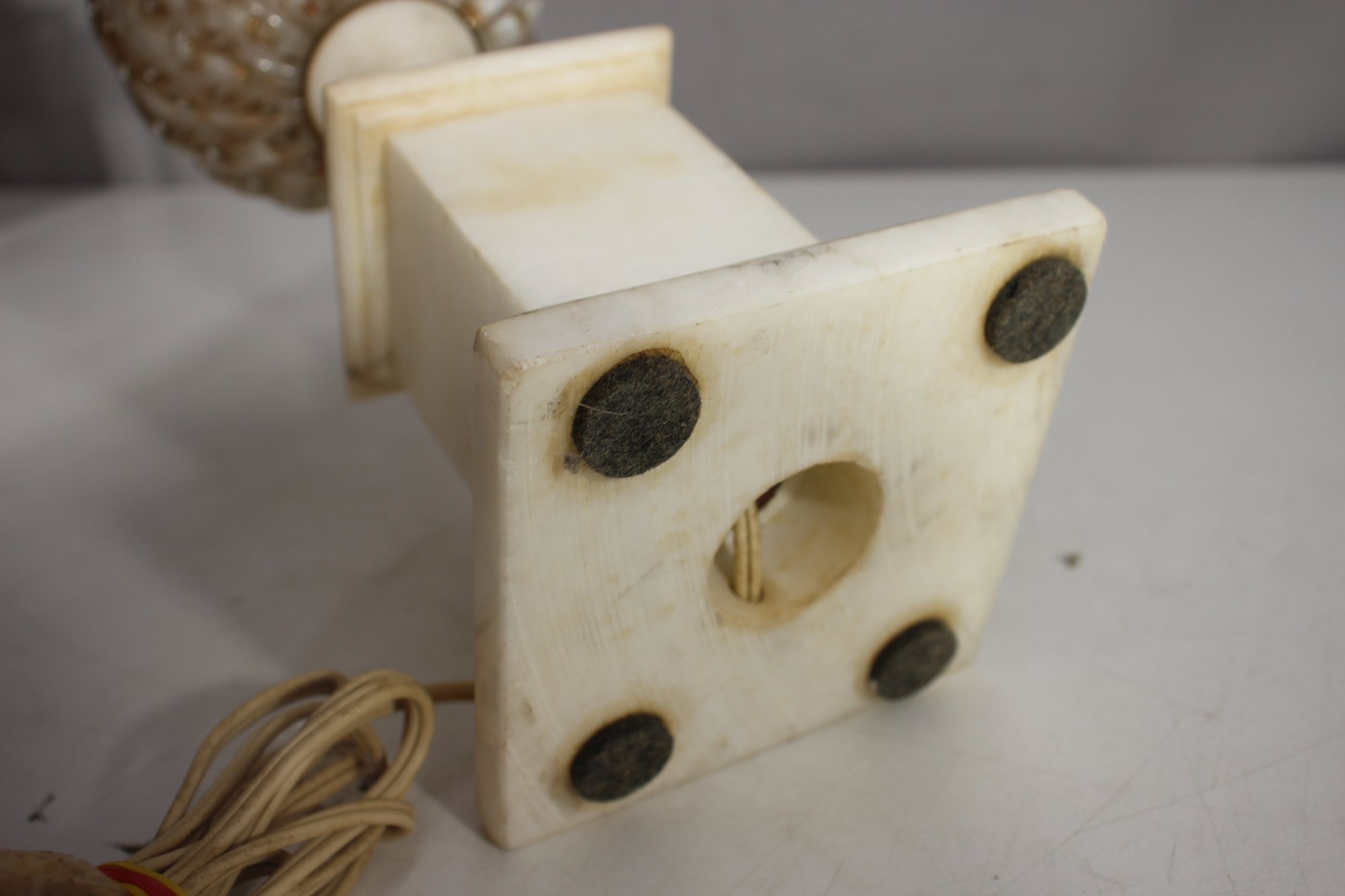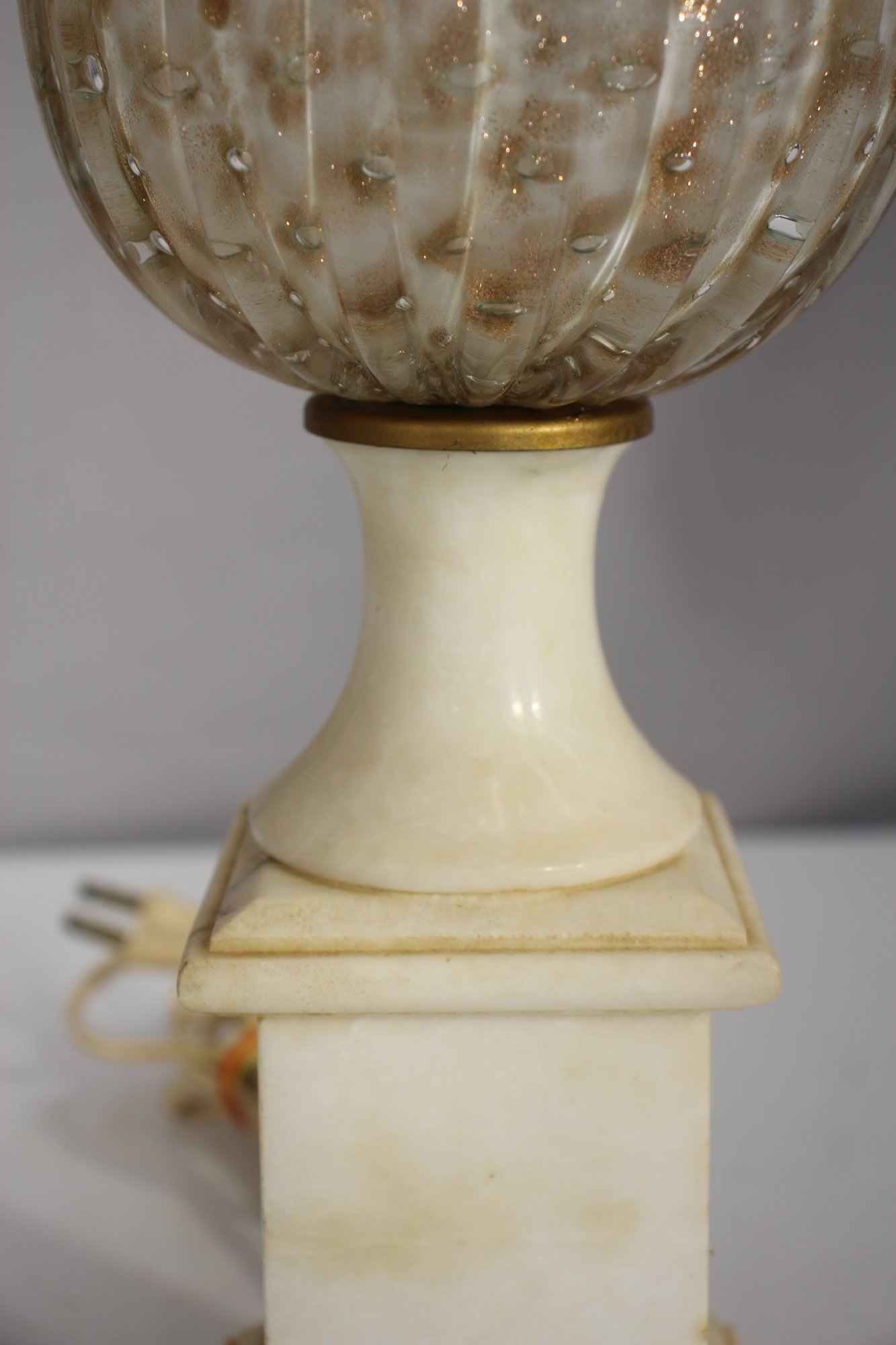 The base and upper sections are crafted from solid marble, showcasing natural veining and a sophisticated presence. The lamp is in working condition, as shown in the photos, and retains its original brass fittings.