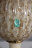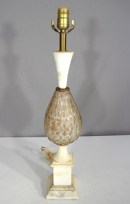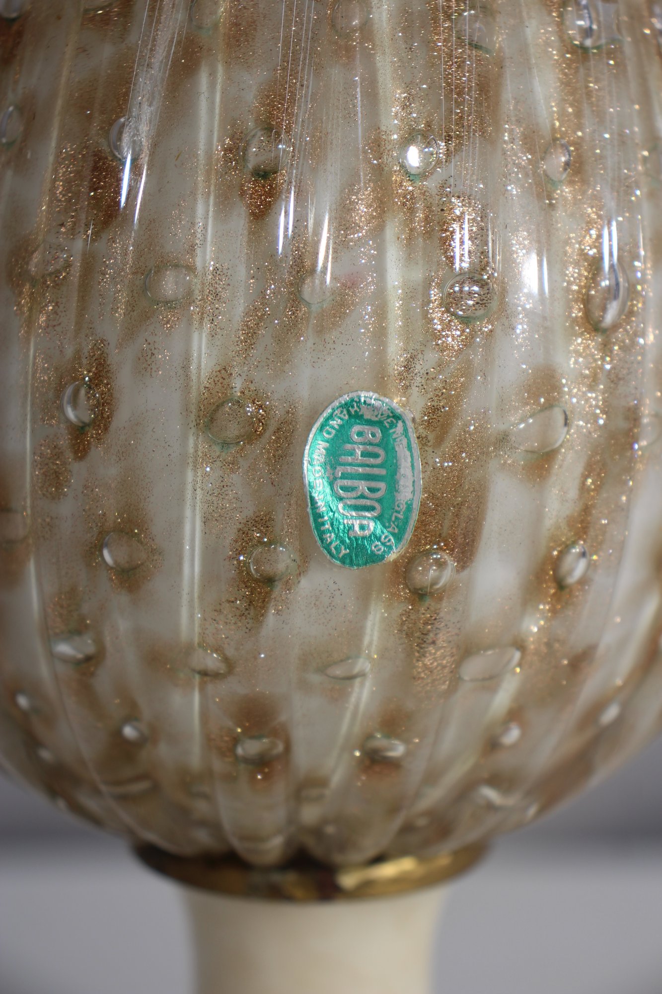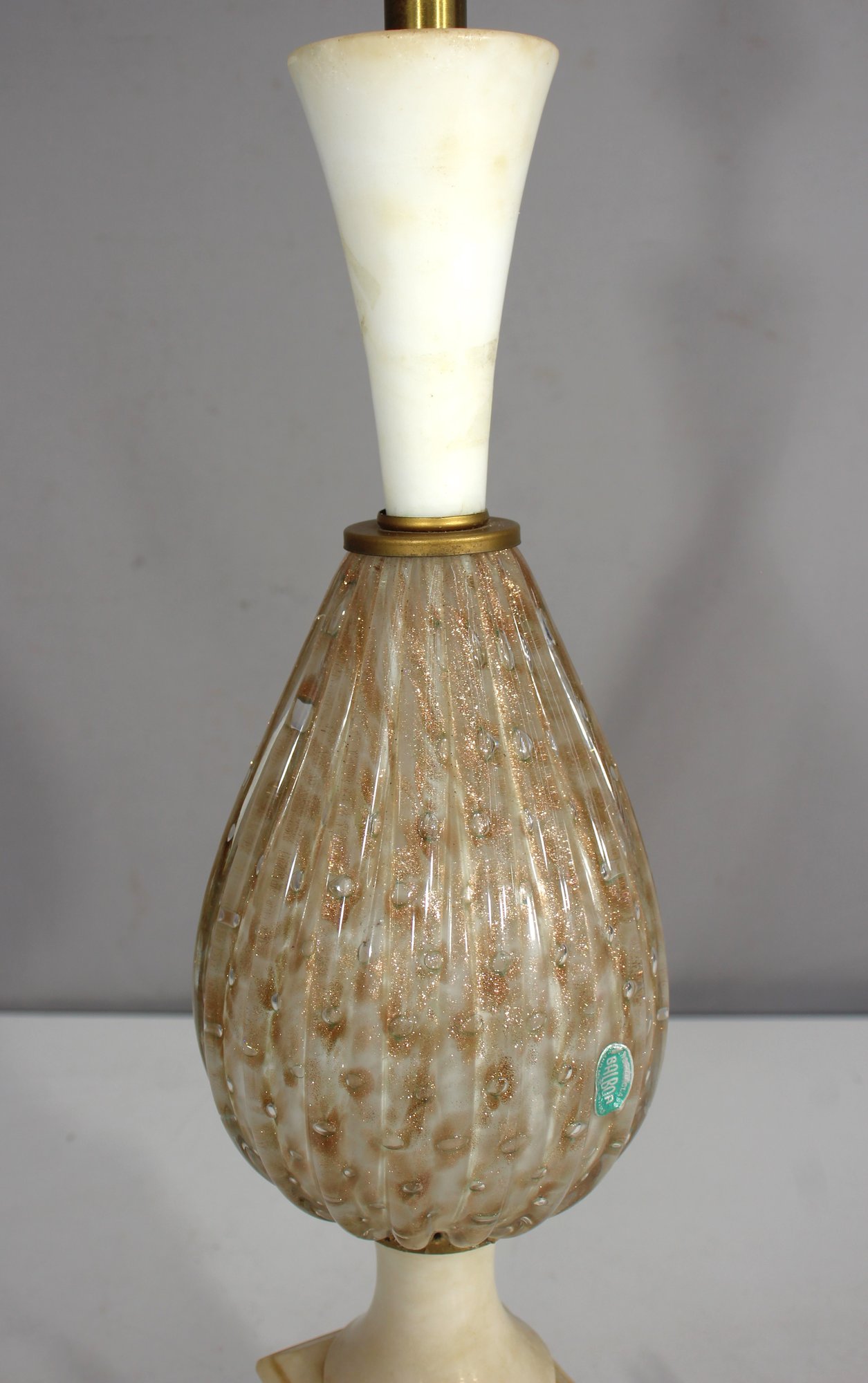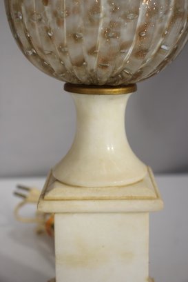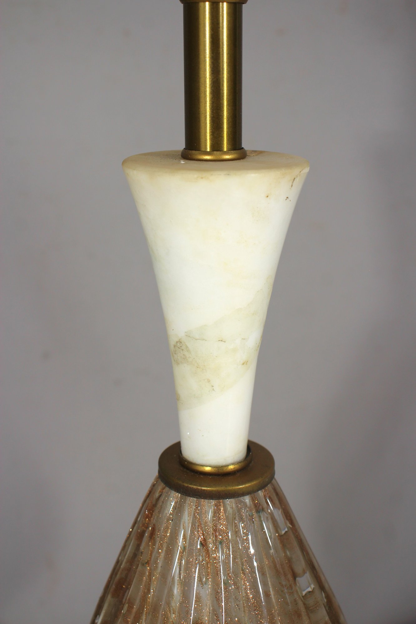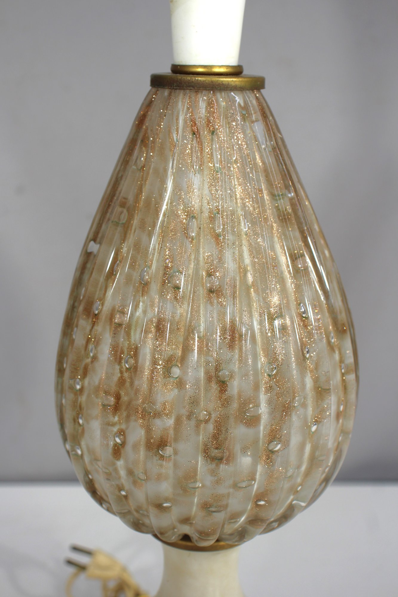 This stunning vintage table lamp, standing 24 inches tall, features a Murano gold flecked art glass body with a ribbed teardrop shape. The rich texture and shimmering gold details create an elegant and timeless aesthetic.
