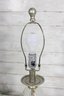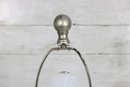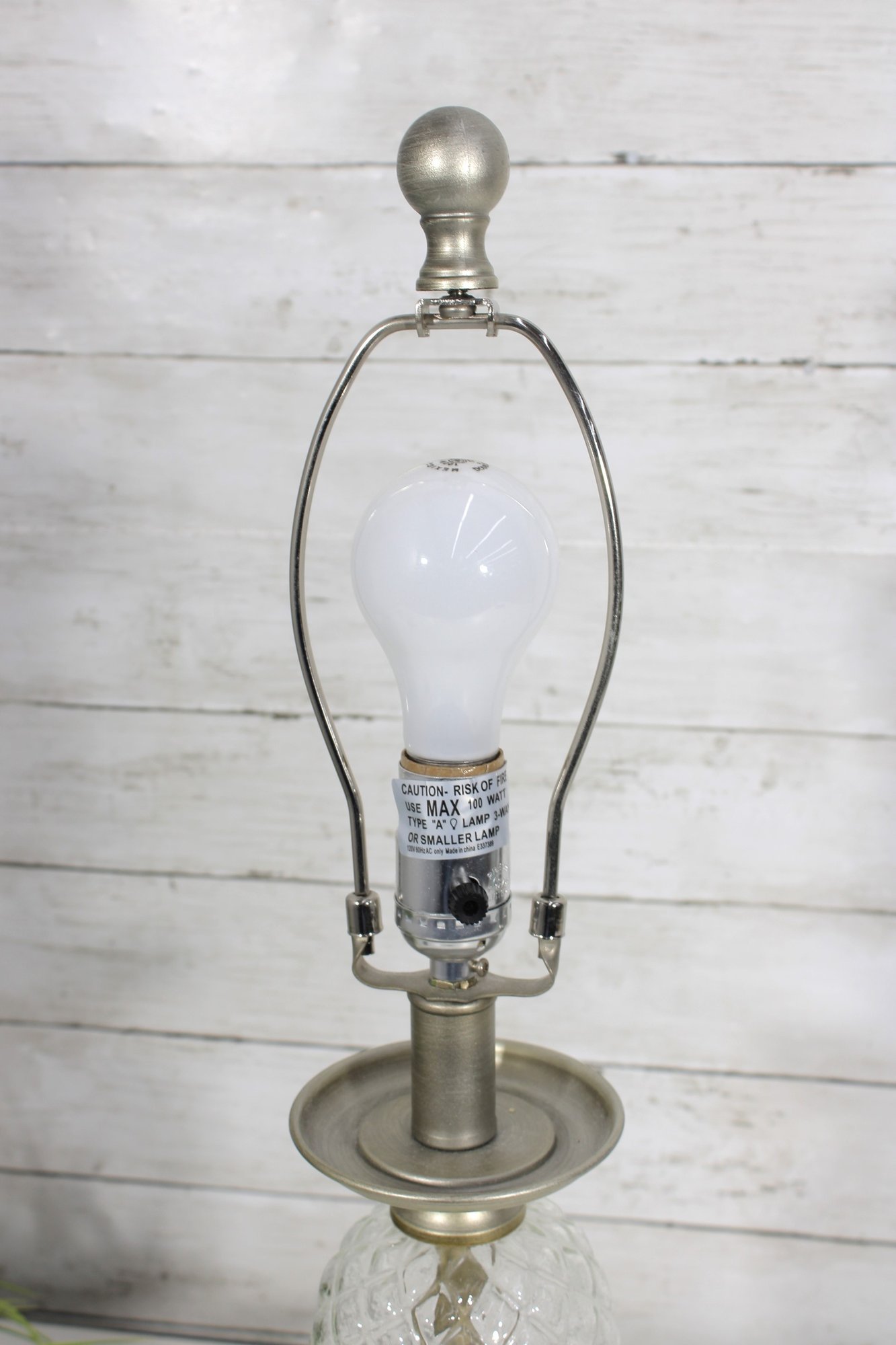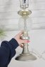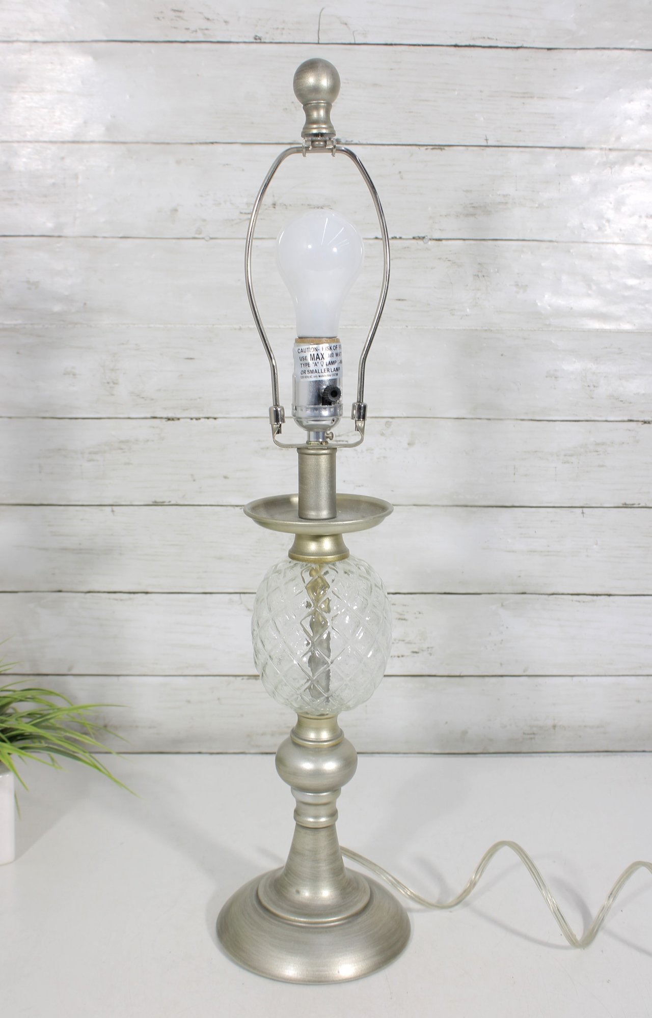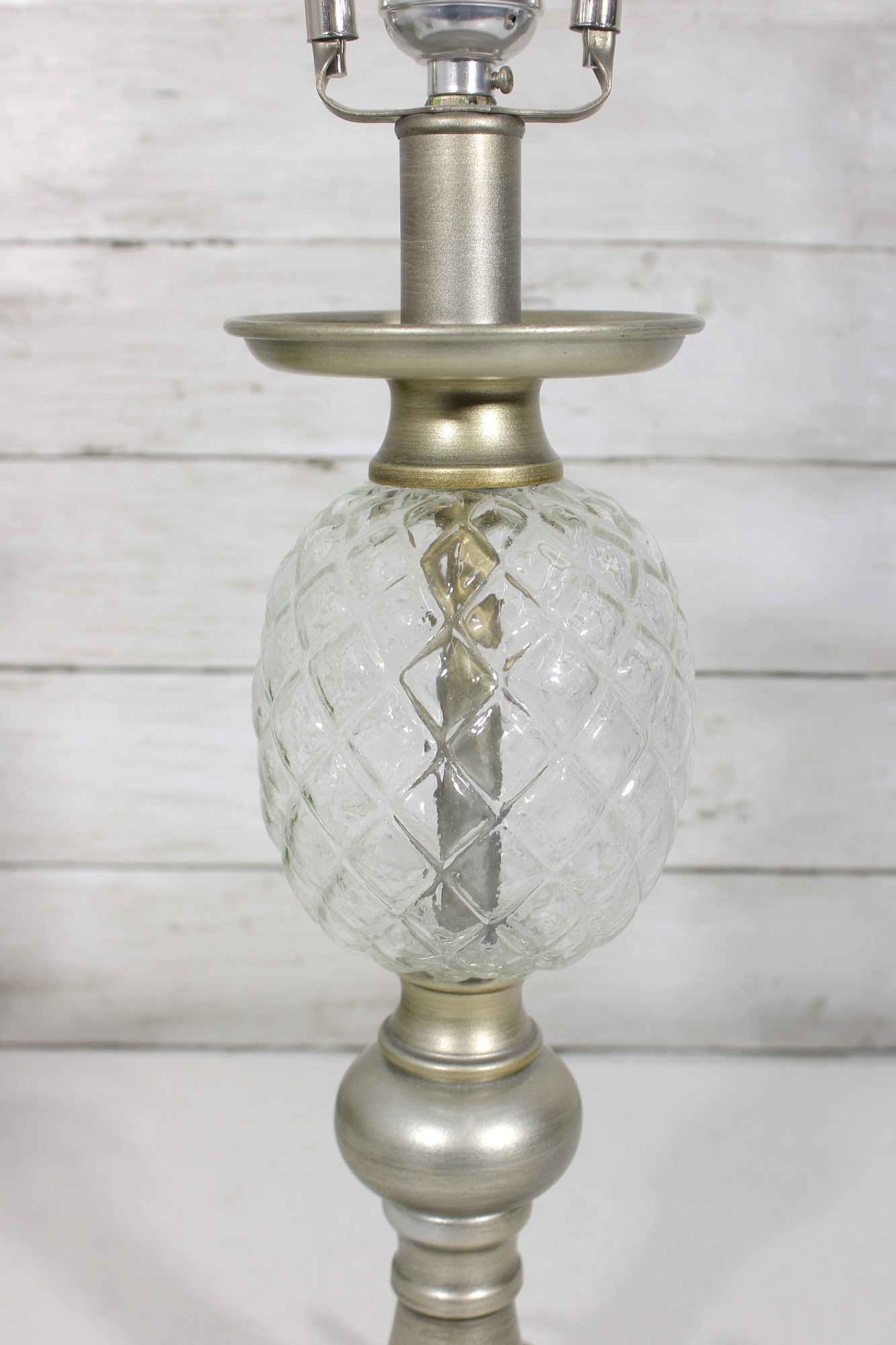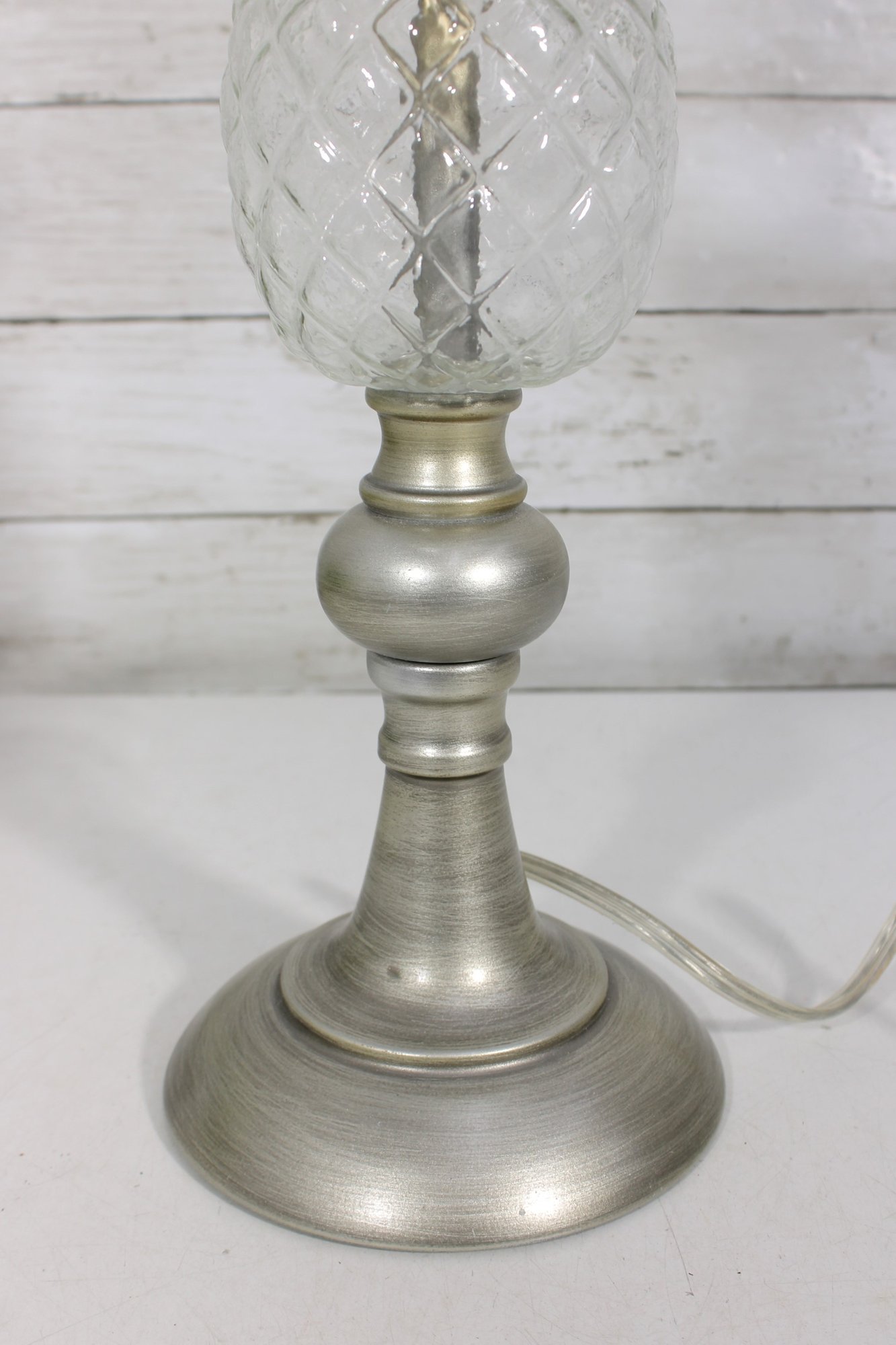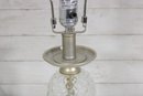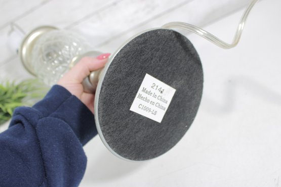 vintage table lamp featuring a beautiful diamond-cut crystal glass center column paired with a brushed nickel or satin silver-tone metal base and accents. The faceted glass section reflects light nicely, adding sparkle and sophistication to the lamp’s classic traditional design.