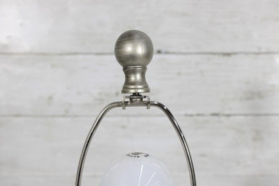 The lamp stands approximately 25 inches tall to the top of the finial and includes a harp-style shade holder. Its timeless style works well in both traditional and transitional interiors and would look great on a side table, nightstand, or living room end table.