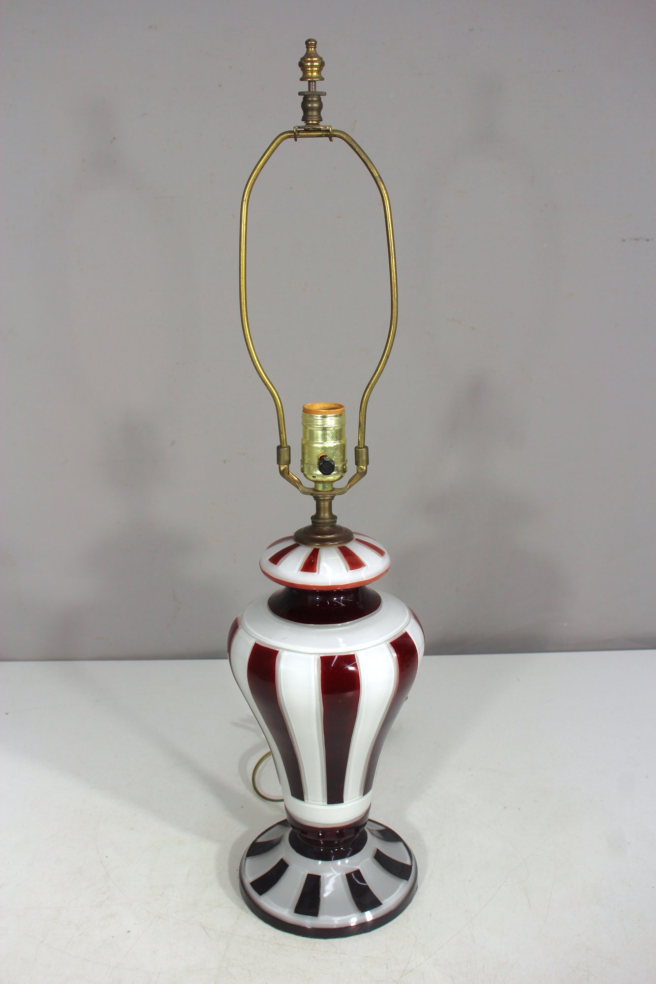 This stunning vintage 26-inch Bohemian glass table lamp features an eye-catching red and white cased glass design with a bold striped pattern. The beautifully handcrafted glass body sits atop a sturdy base, and the lamp is fitted with its original brass harp and finial, enhancing its elegant vintage appeal.