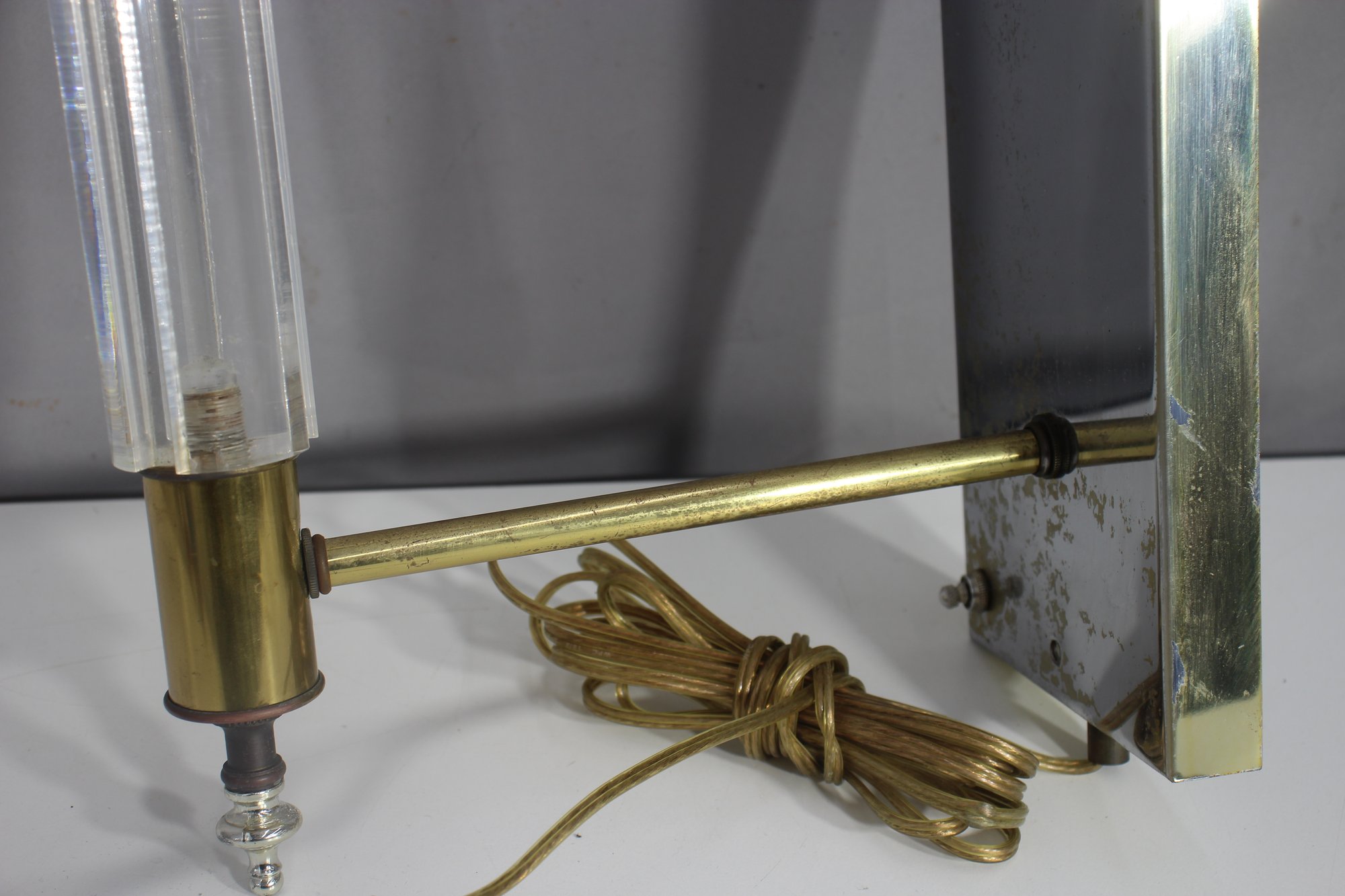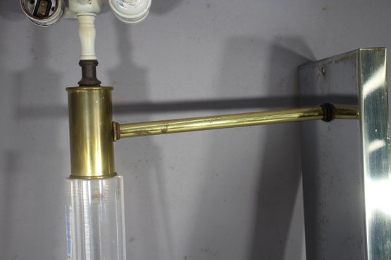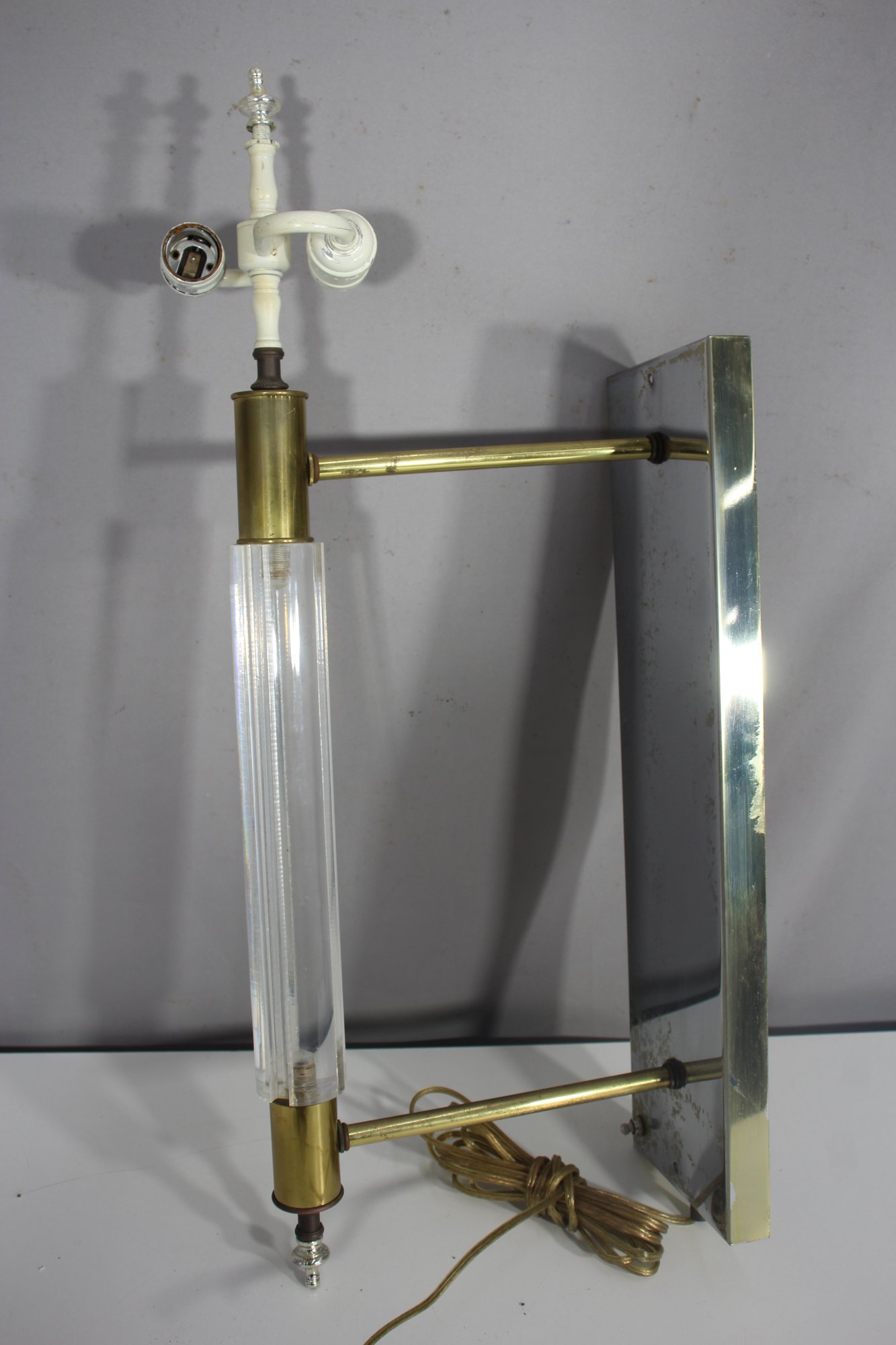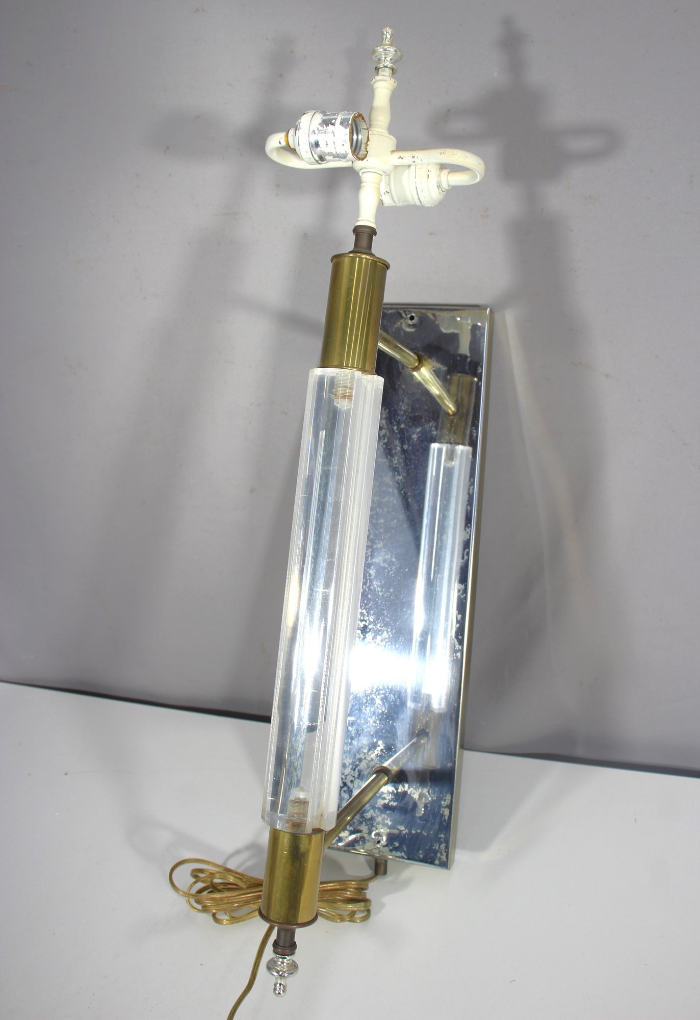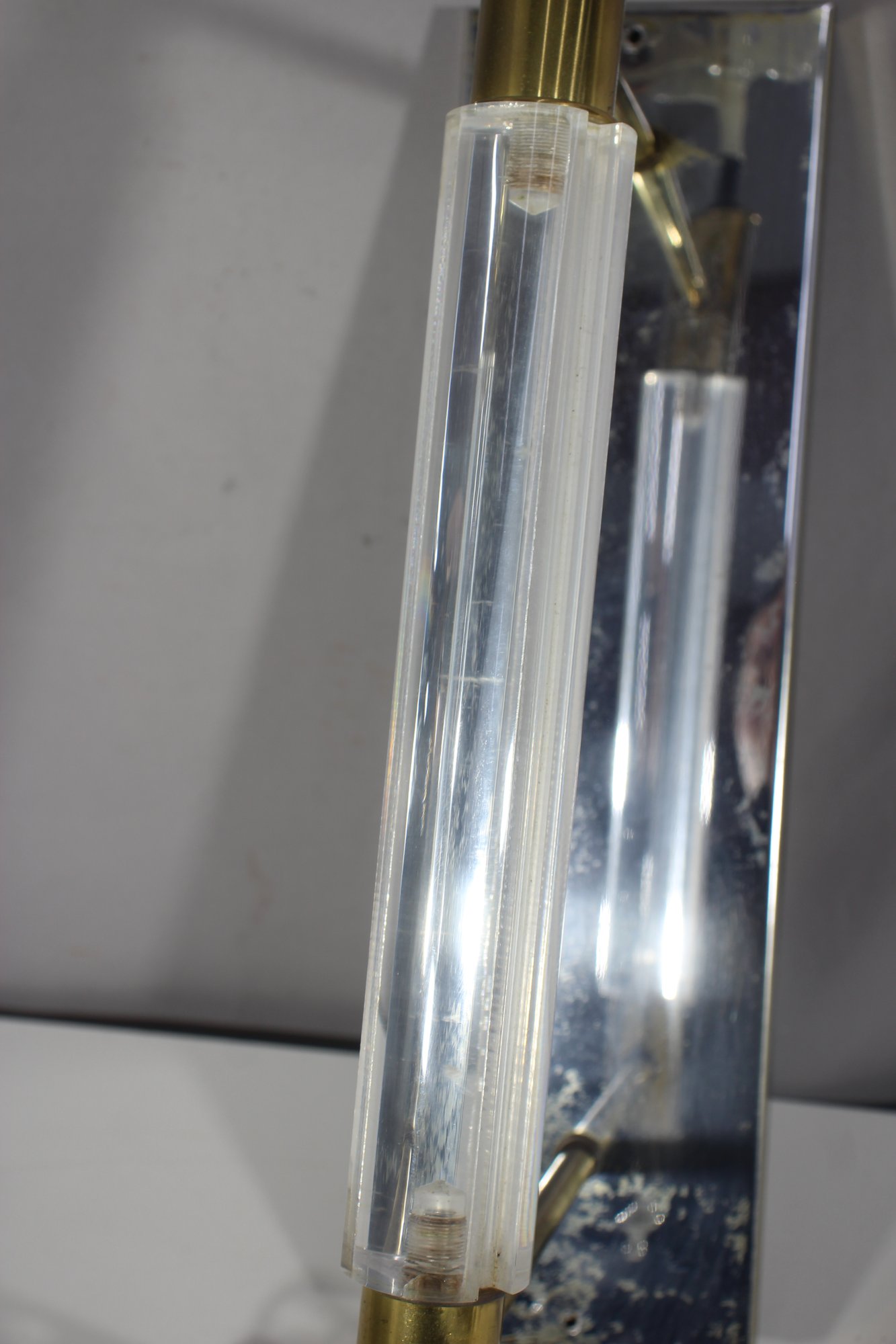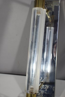 a 26” vintage brass and lucite wall sconce lamp, featuring a sleek mirrored backplate, brass accents, and a clear ribbed lucite rod. This unique piece has a mid-century modern meets industrial aesthetic, making it a great restoration project for collectors or designers.