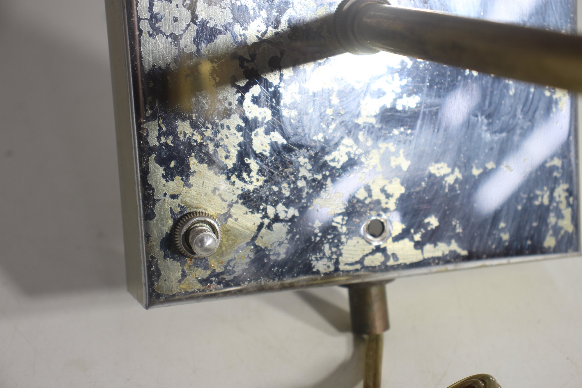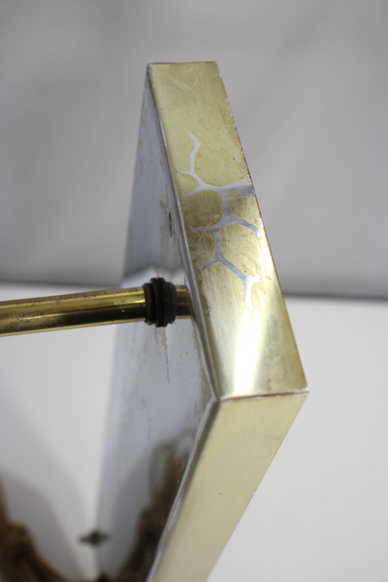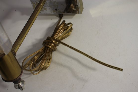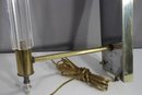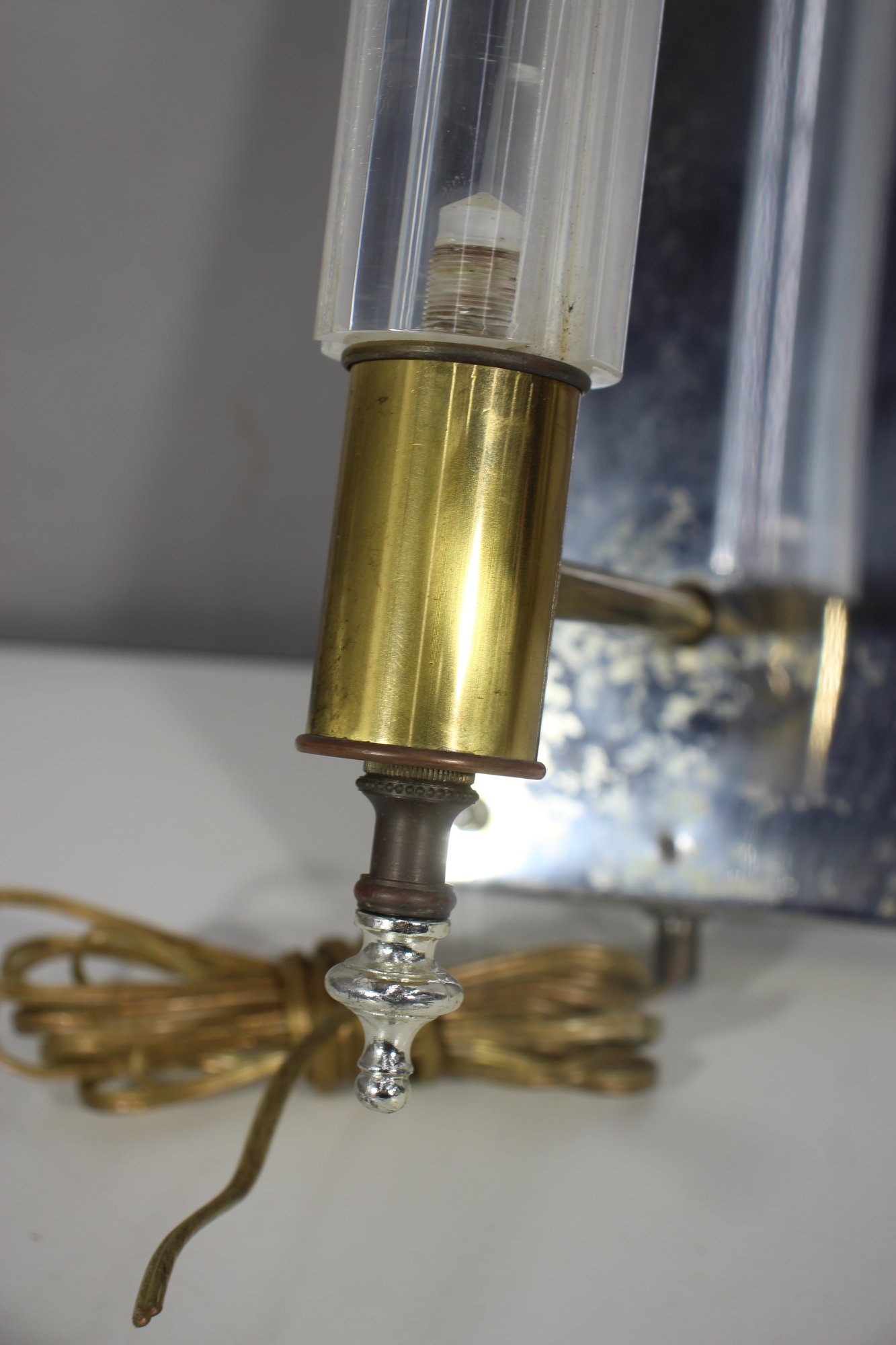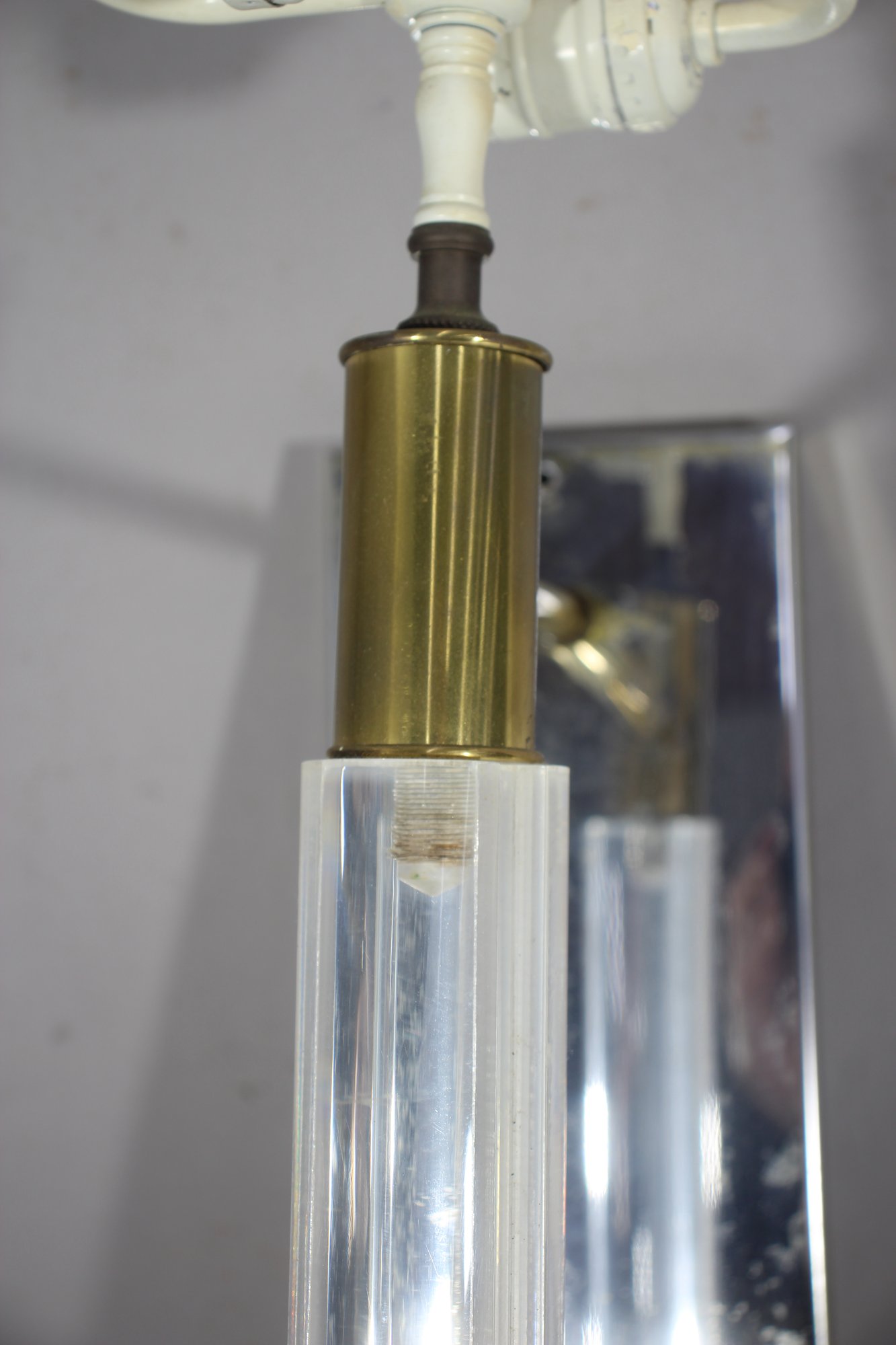 a 26” vintage brass and lucite wall sconce lamp, featuring a sleek mirrored backplate, brass accents, and a clear ribbed lucite rod. This unique piece has a mid-century modern meets industrial aesthetic, making it a great restoration project for collectors or designers.