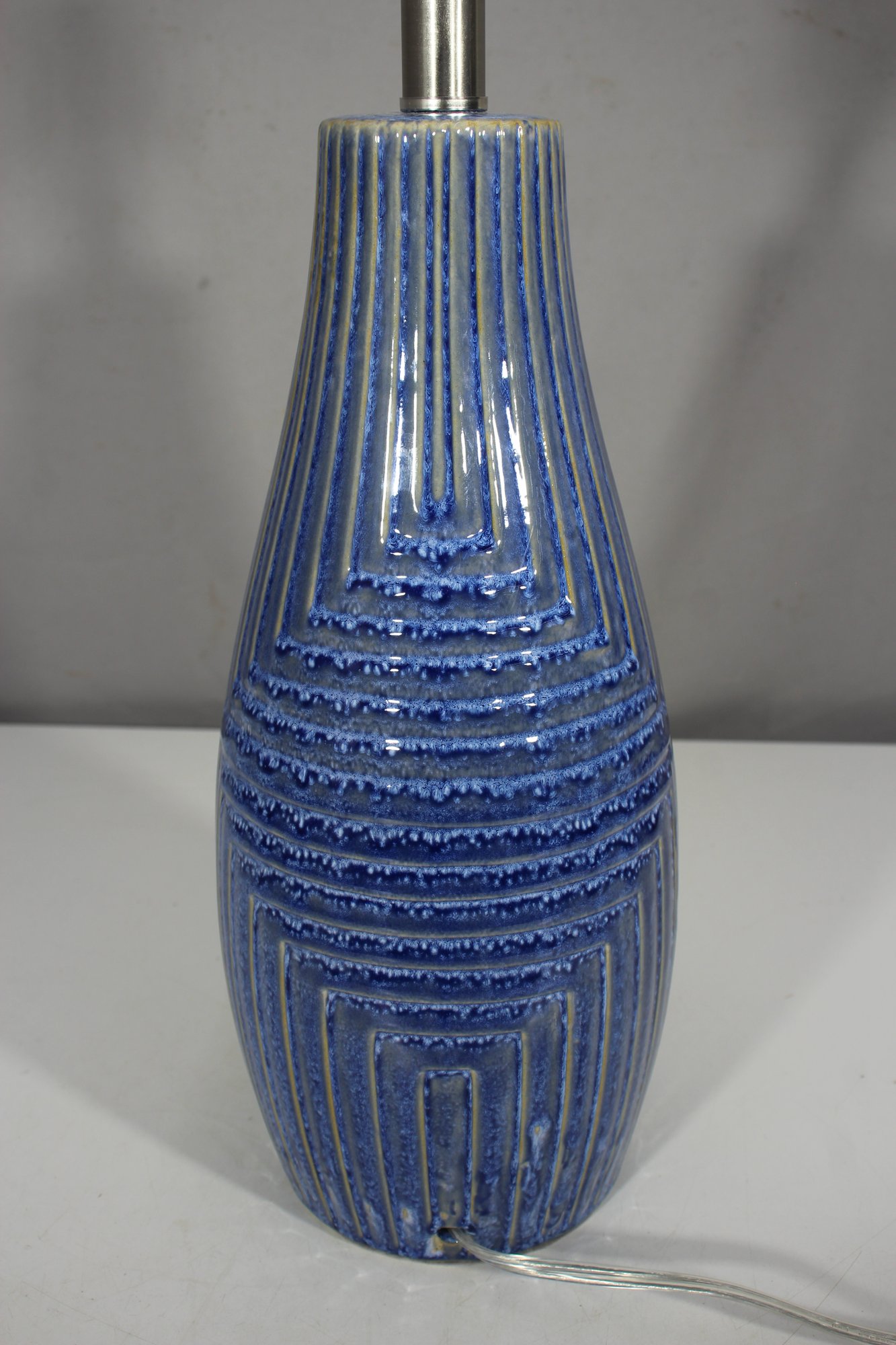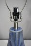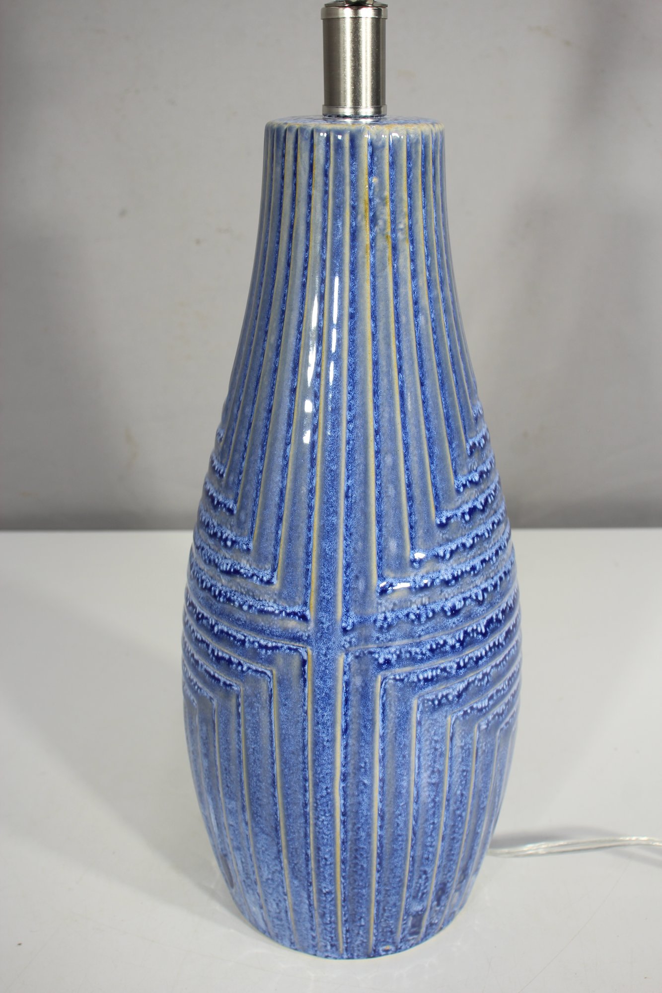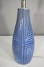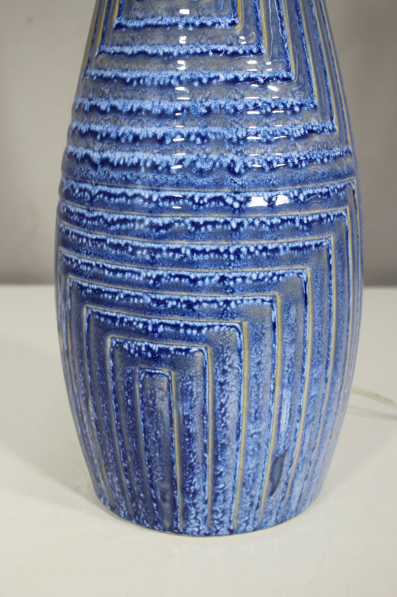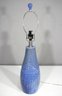 a gorgeous 27” vintage ceramic table lamp featuring a striking blue glaze with a geometric textured pattern. The lamp has a matching ceramic finial, adding to its cohesive and artistic design.