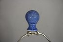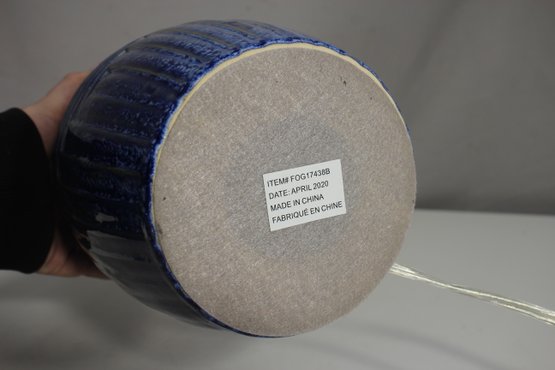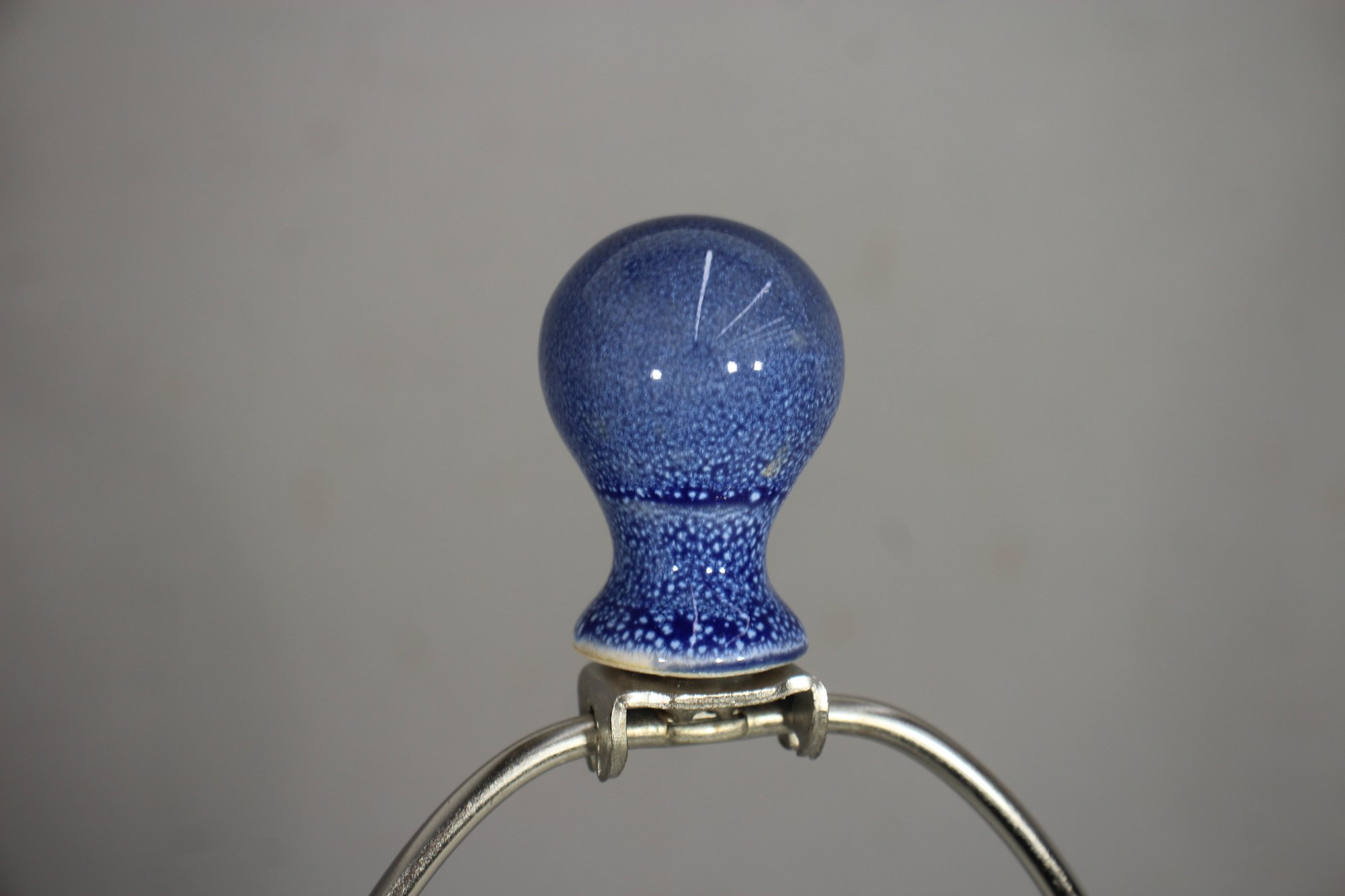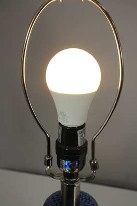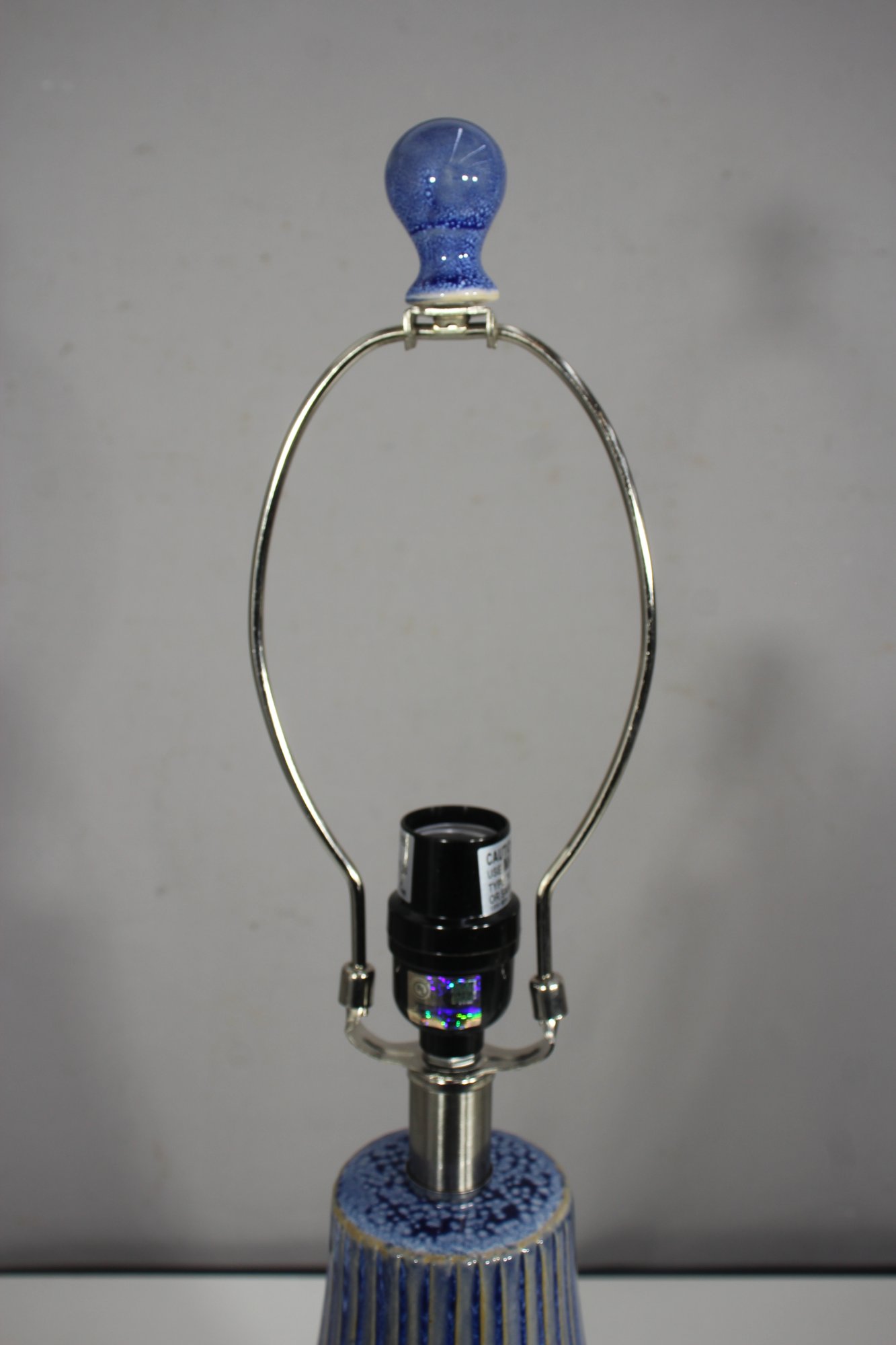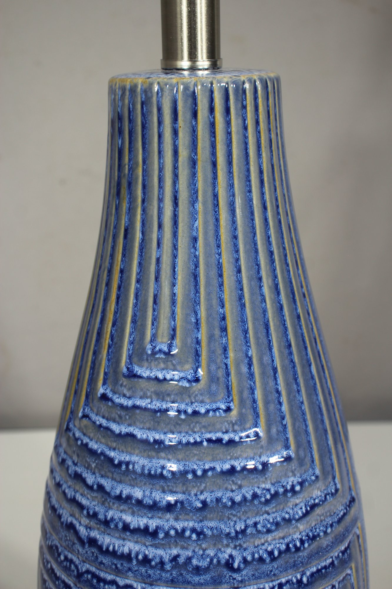 a gorgeous 27” vintage ceramic table lamp featuring a striking blue glaze with a geometric textured pattern. The lamp has a matching ceramic finial, adding to its cohesive and artistic design.