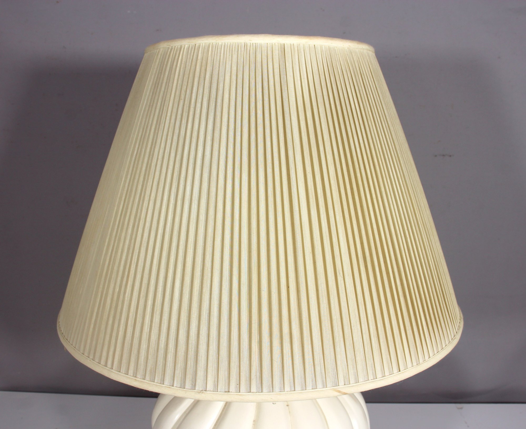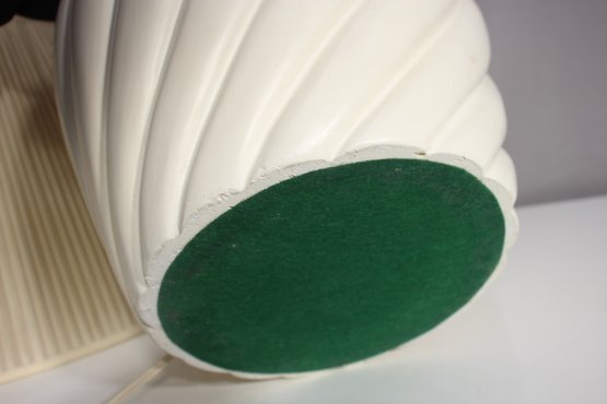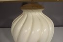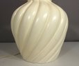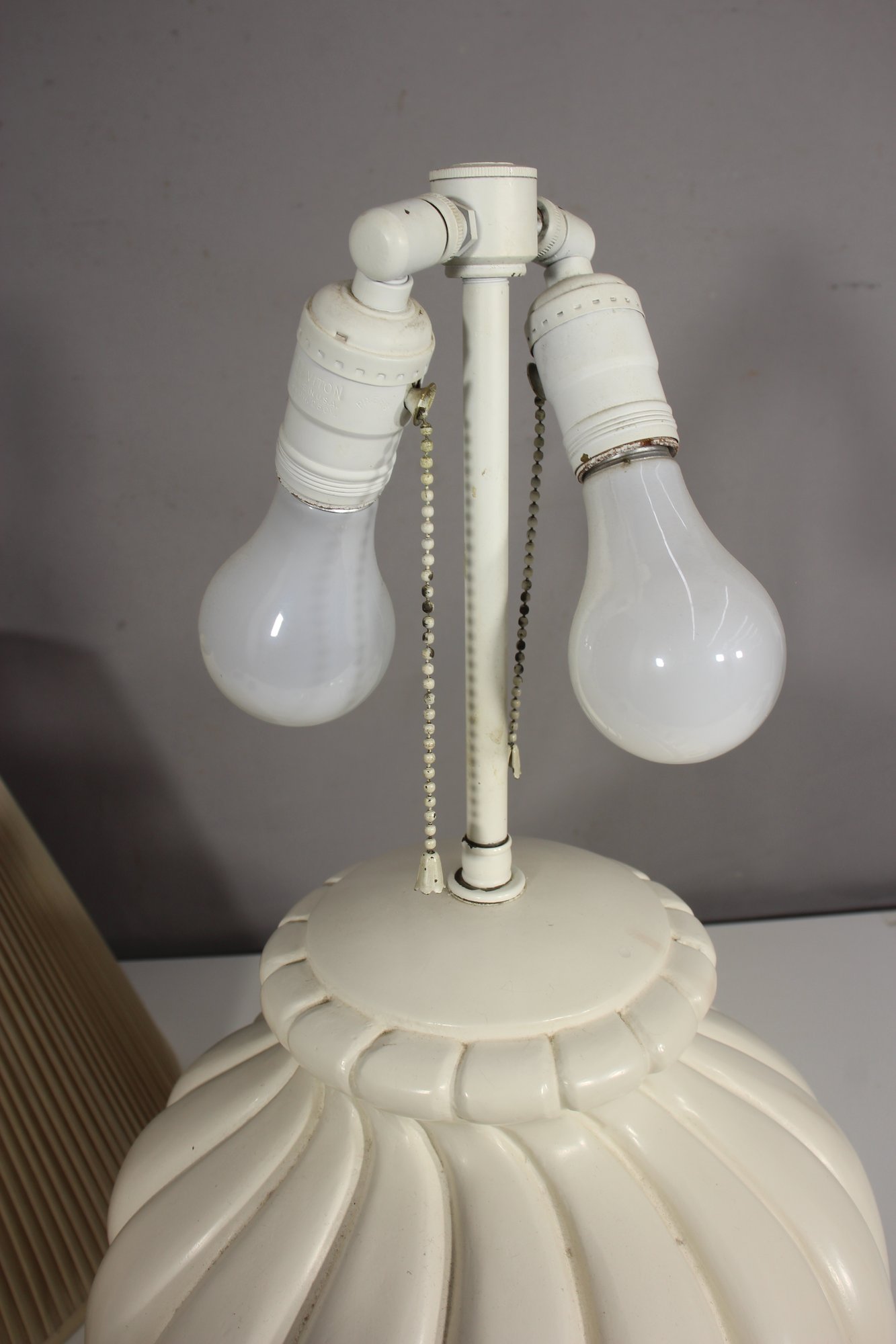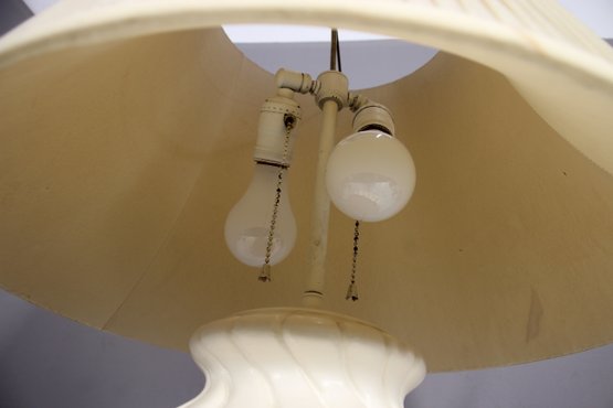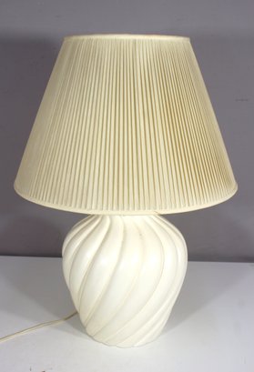 vintage ceramic table lamp, featuring an elegant white swirl design and a pleated fabric lampshade. This timeless piece adds a soft, neutral accent to any interior style, from coastal and shabby chic to traditional and modern.