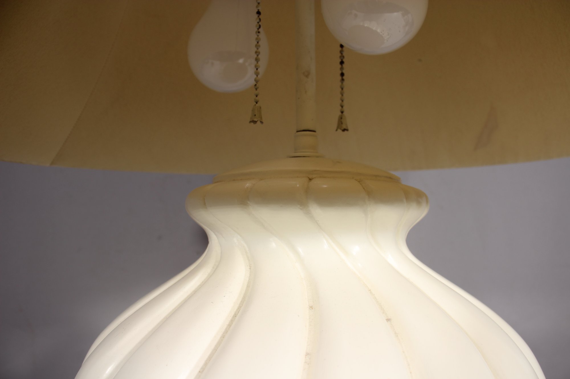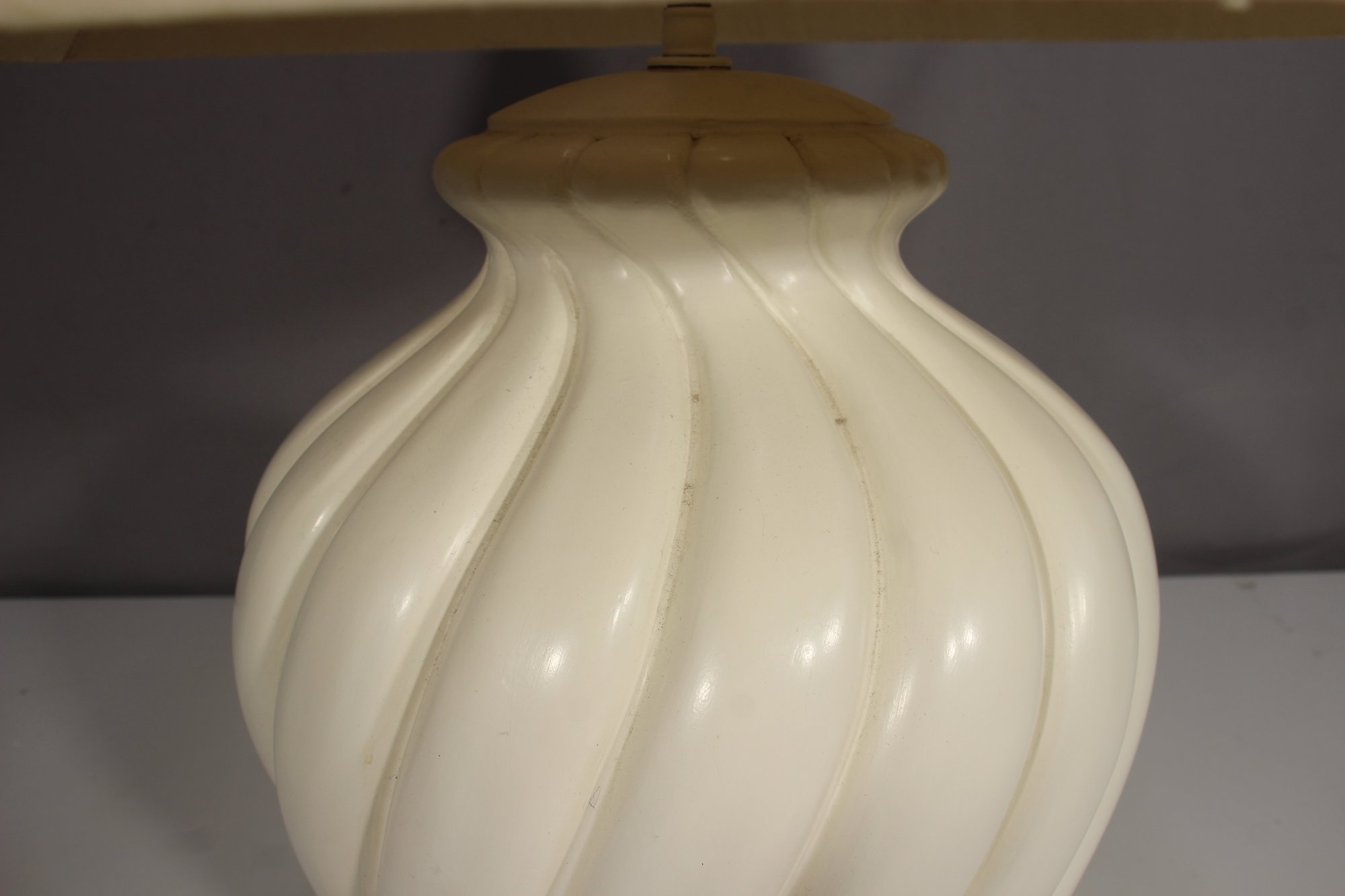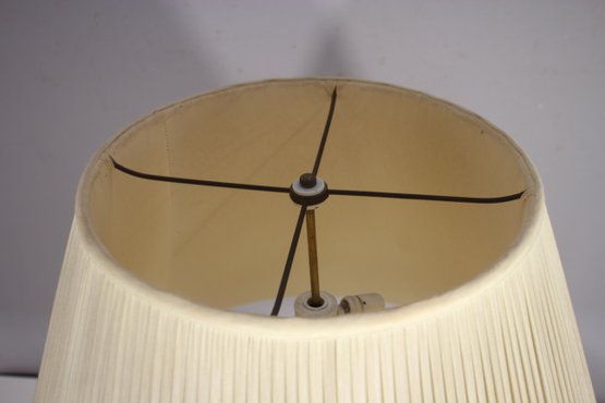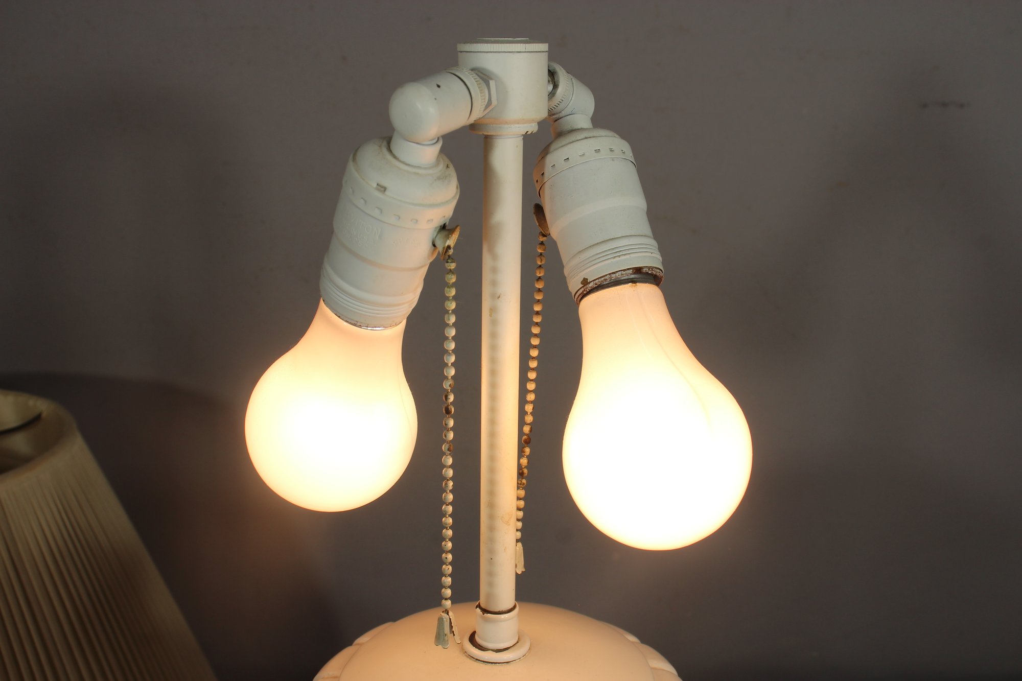 vintage ceramic table lamp, featuring an elegant white swirl design and a pleated fabric lampshade. This timeless piece adds a soft, neutral accent to any interior style, from coastal and shabby chic to traditional and modern.