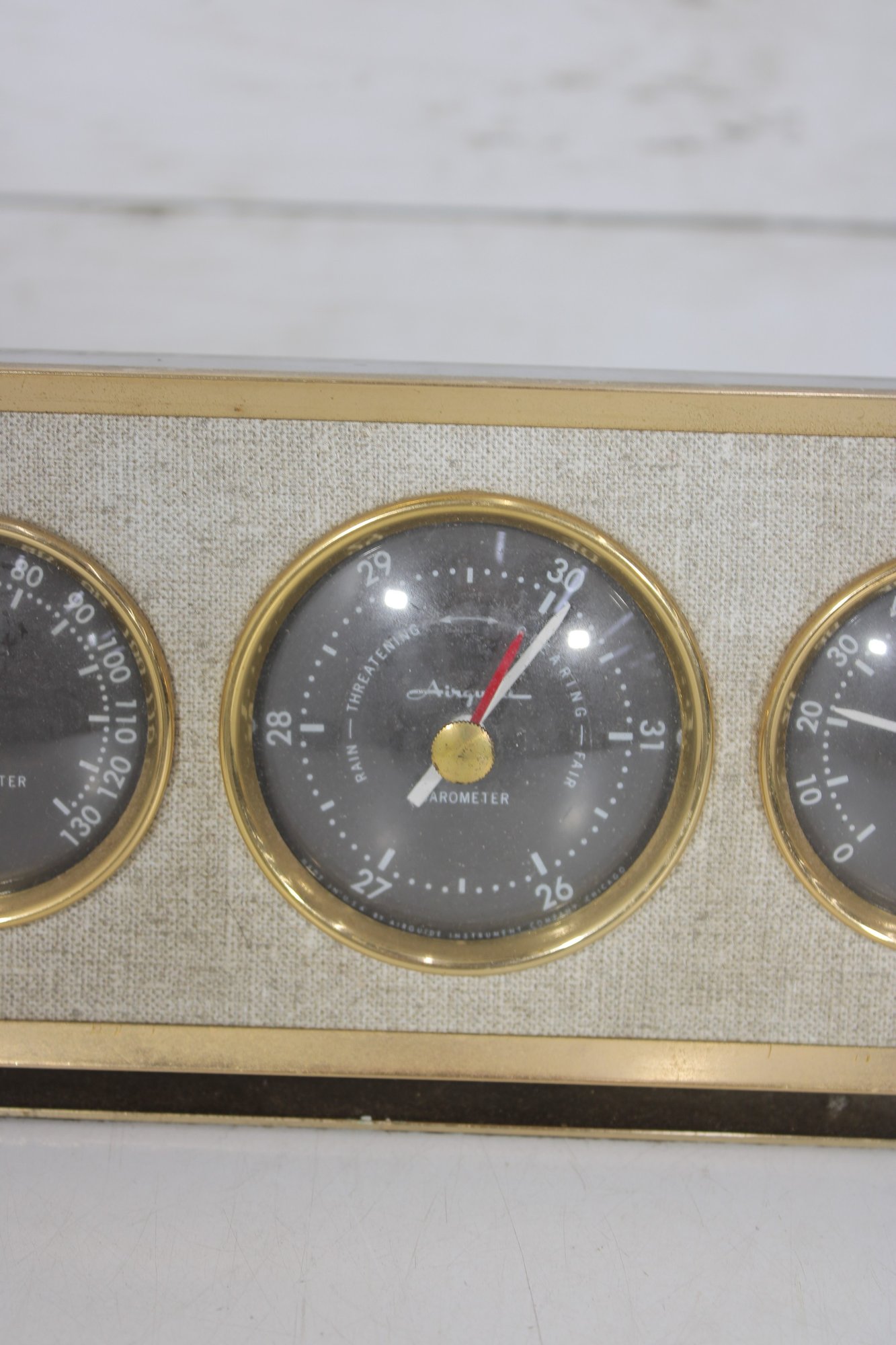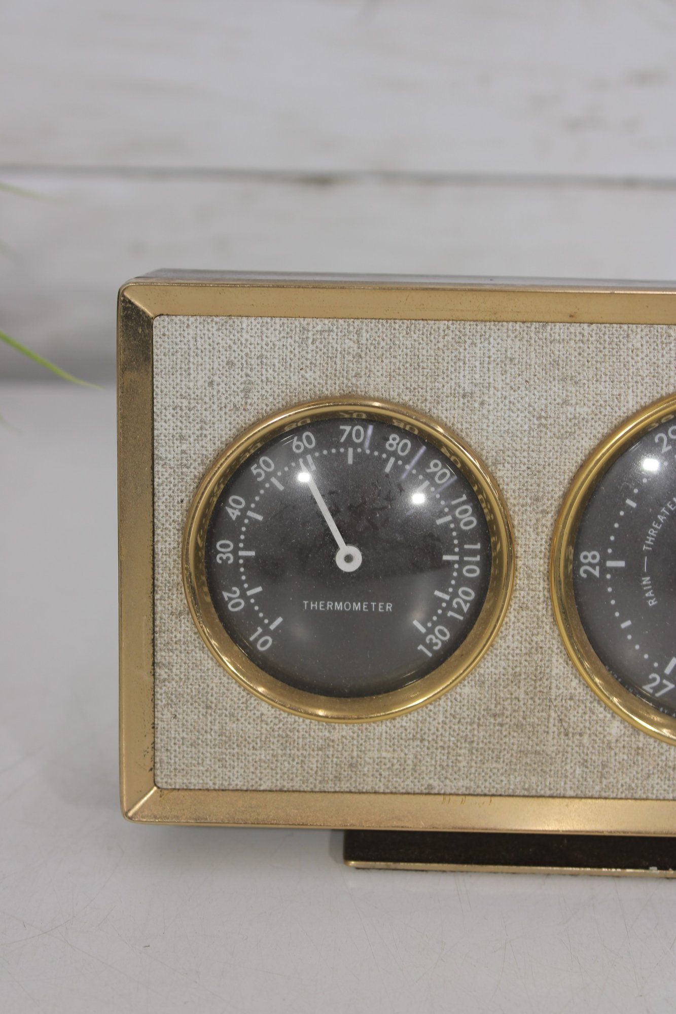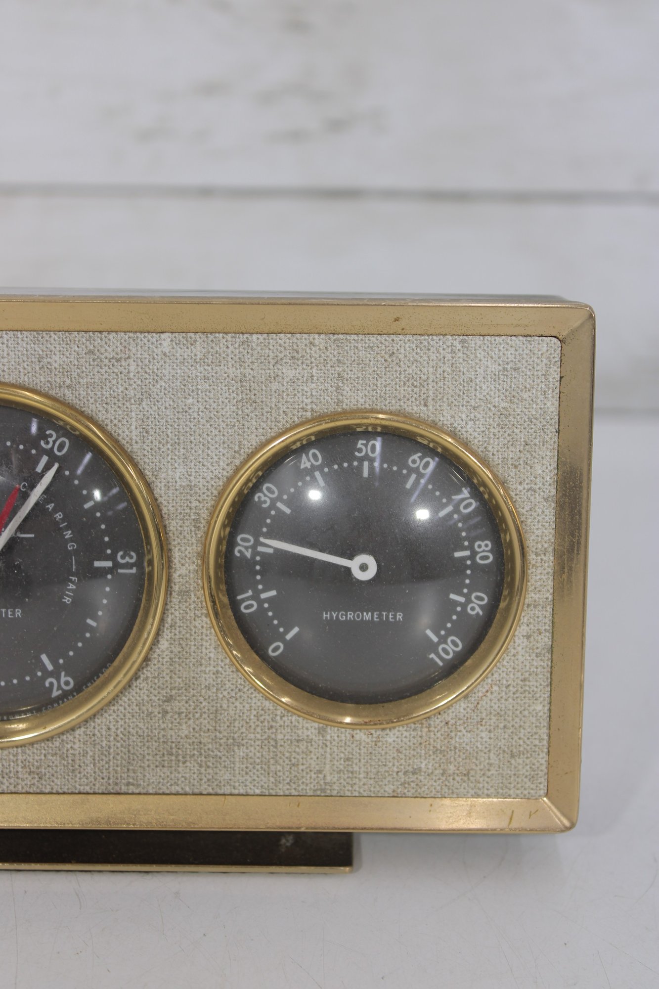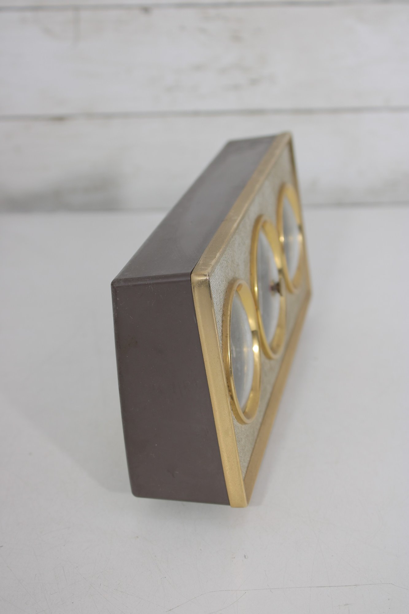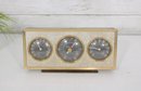 Vintage tabletop weather station featuring three round gauges in a rectangular case with brass-tone trim. The center dial appears to be a barometer, flanked by thermometer and hygrometer gauges.