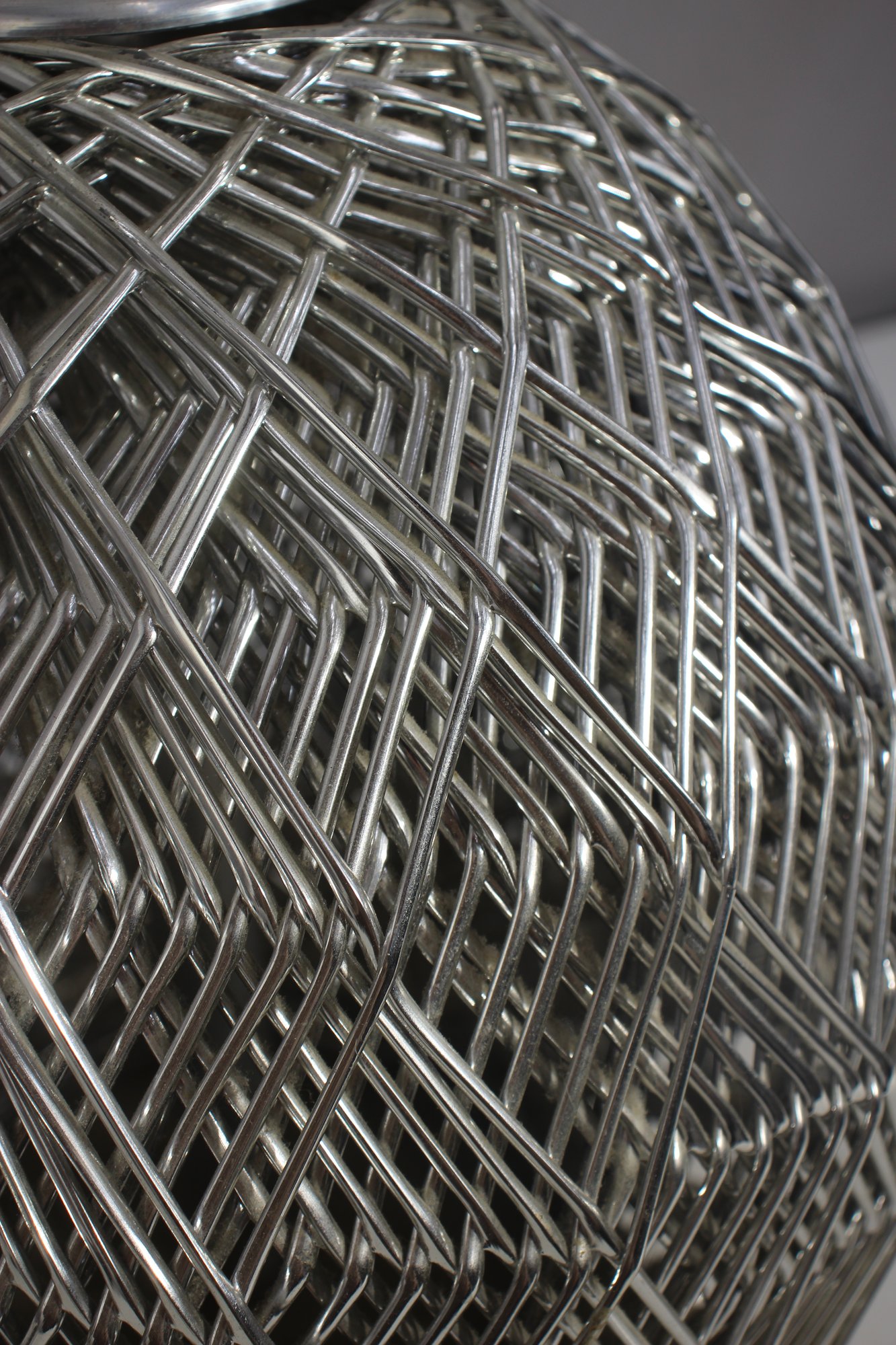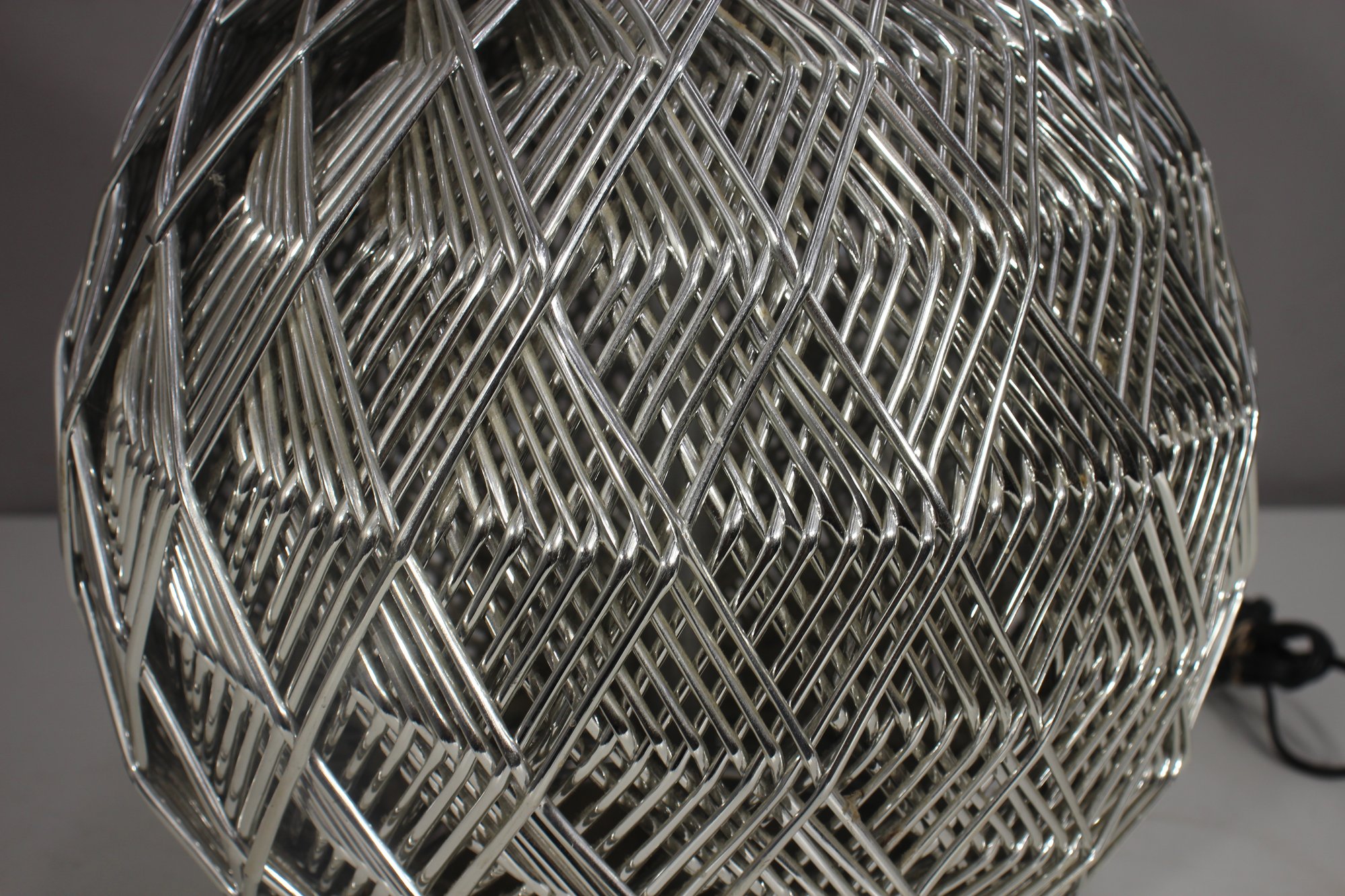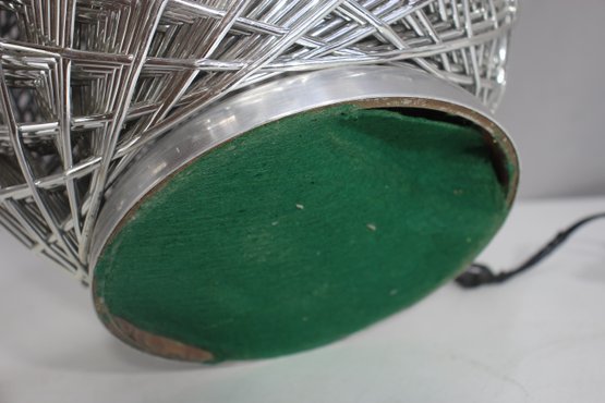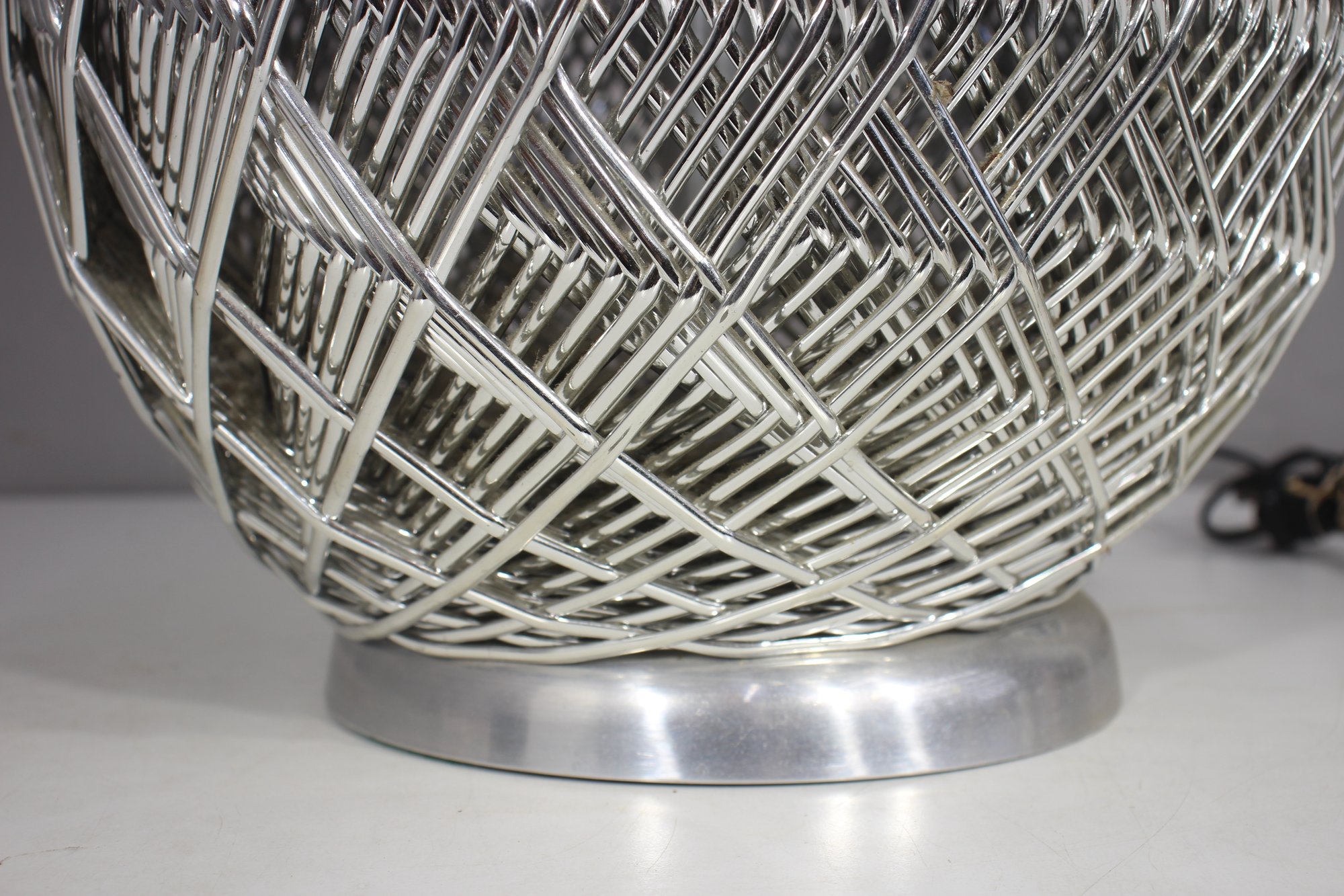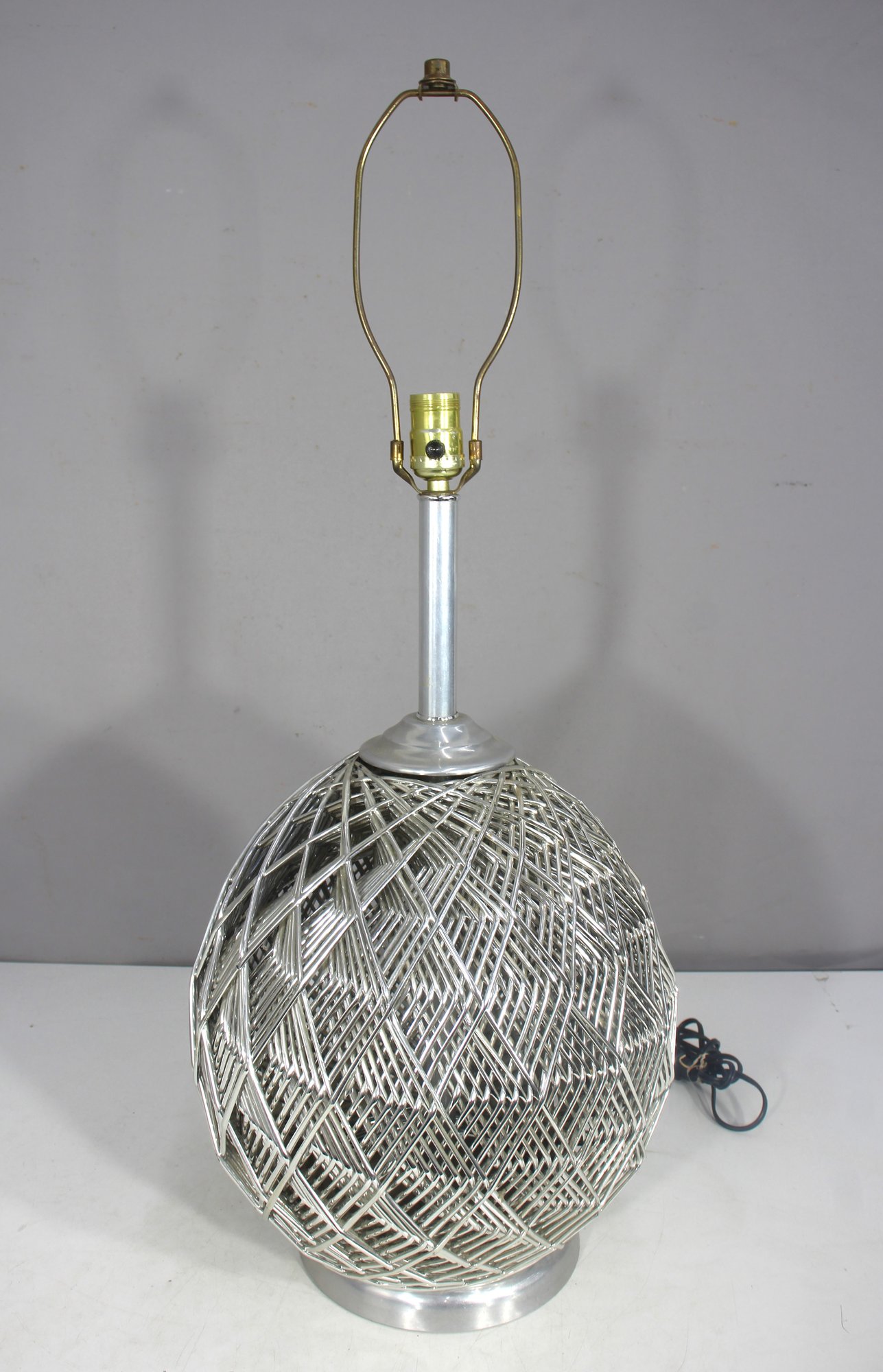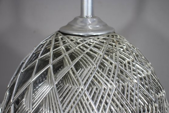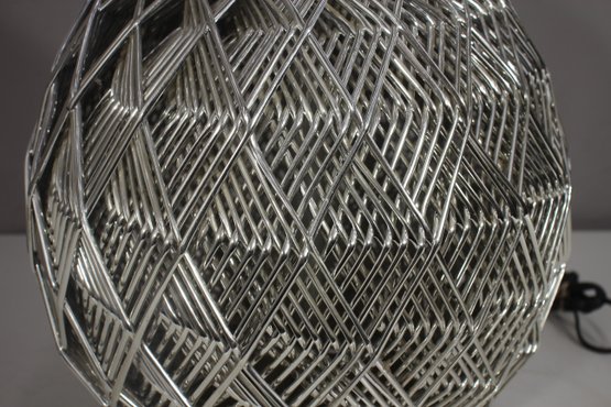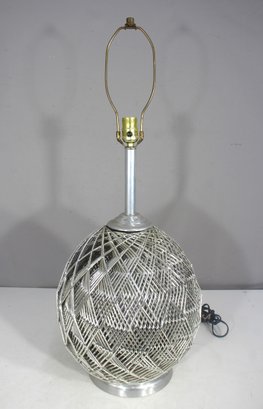 This stunning 32-inch vintage table lamp features a modernist sculptural metal wire cage design with a sleek aluminum base. The intricate crisscrossing metal pattern creates a dynamic geometric effect, making this lamp a statement piece for any space.