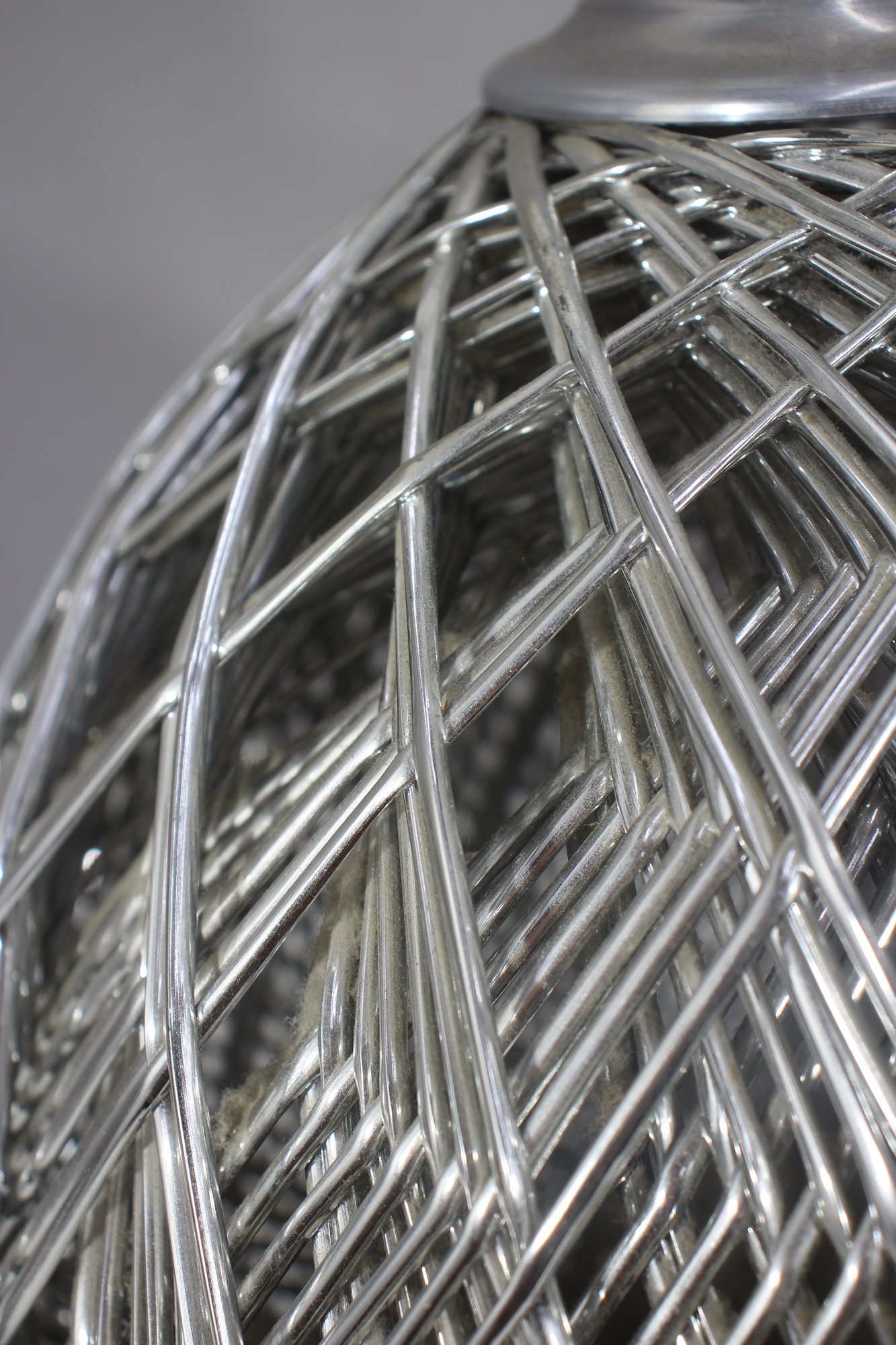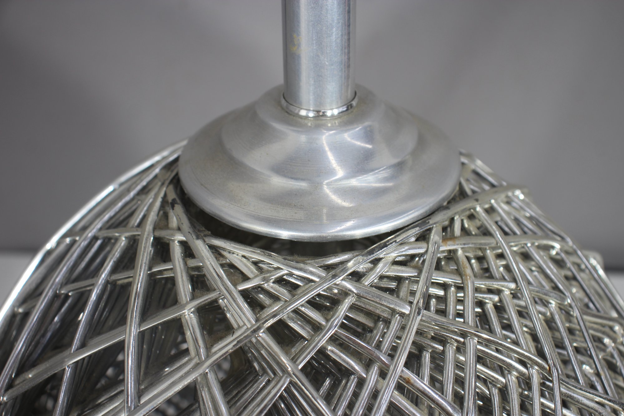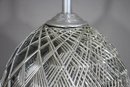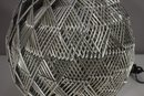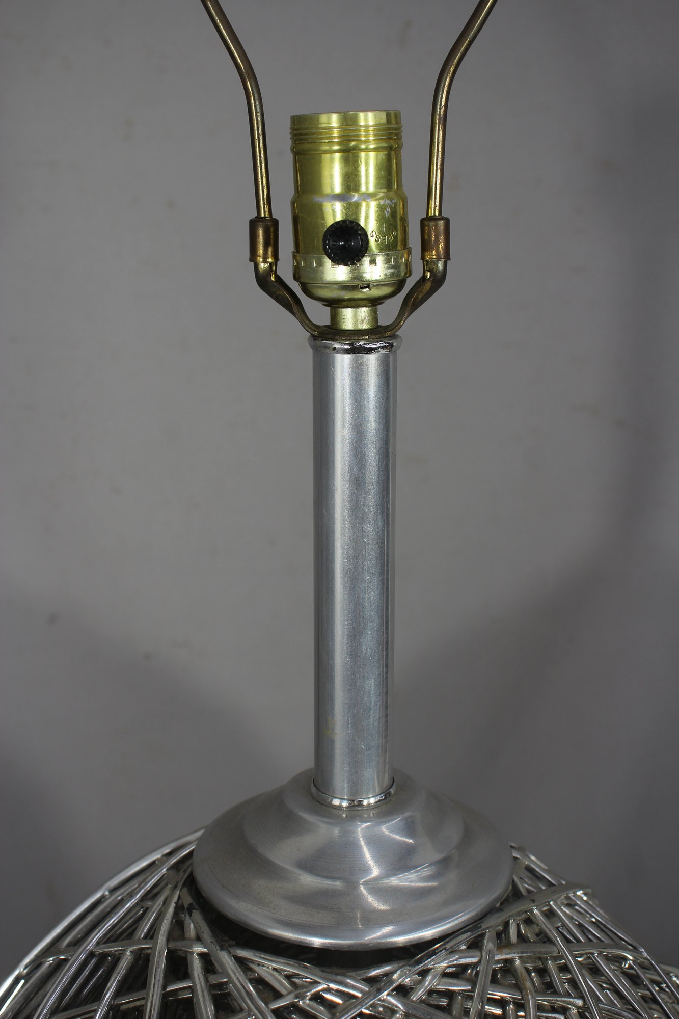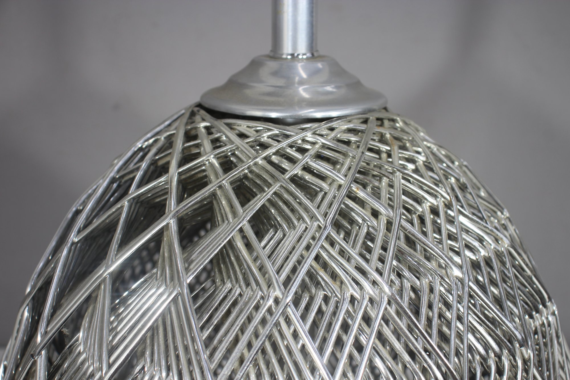 This stunning 32-inch vintage table lamp features a modernist sculptural metal wire cage design with a sleek aluminum base. The intricate crisscrossing metal pattern creates a dynamic geometric effect, making this lamp a statement piece for any space.