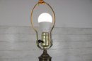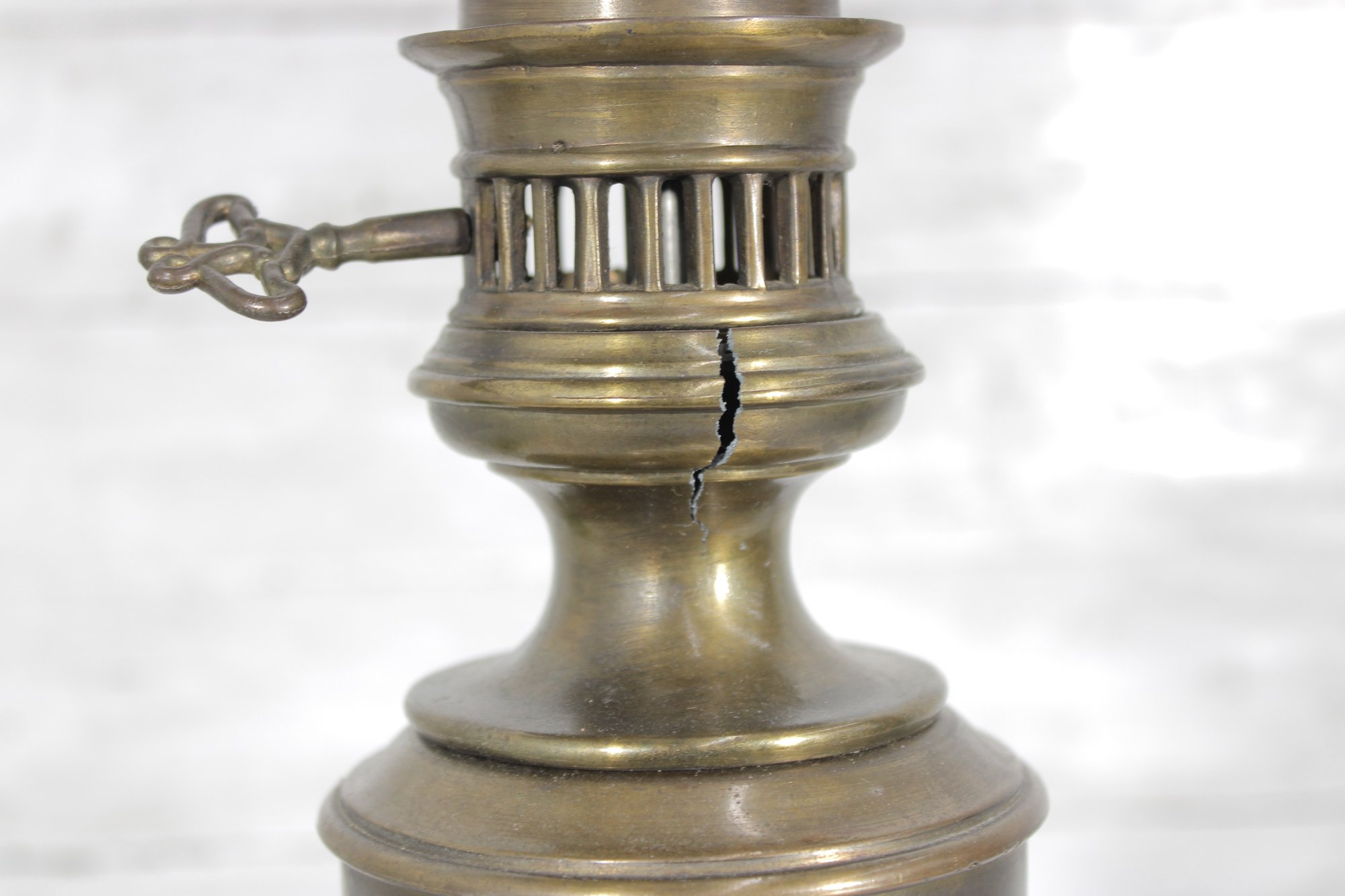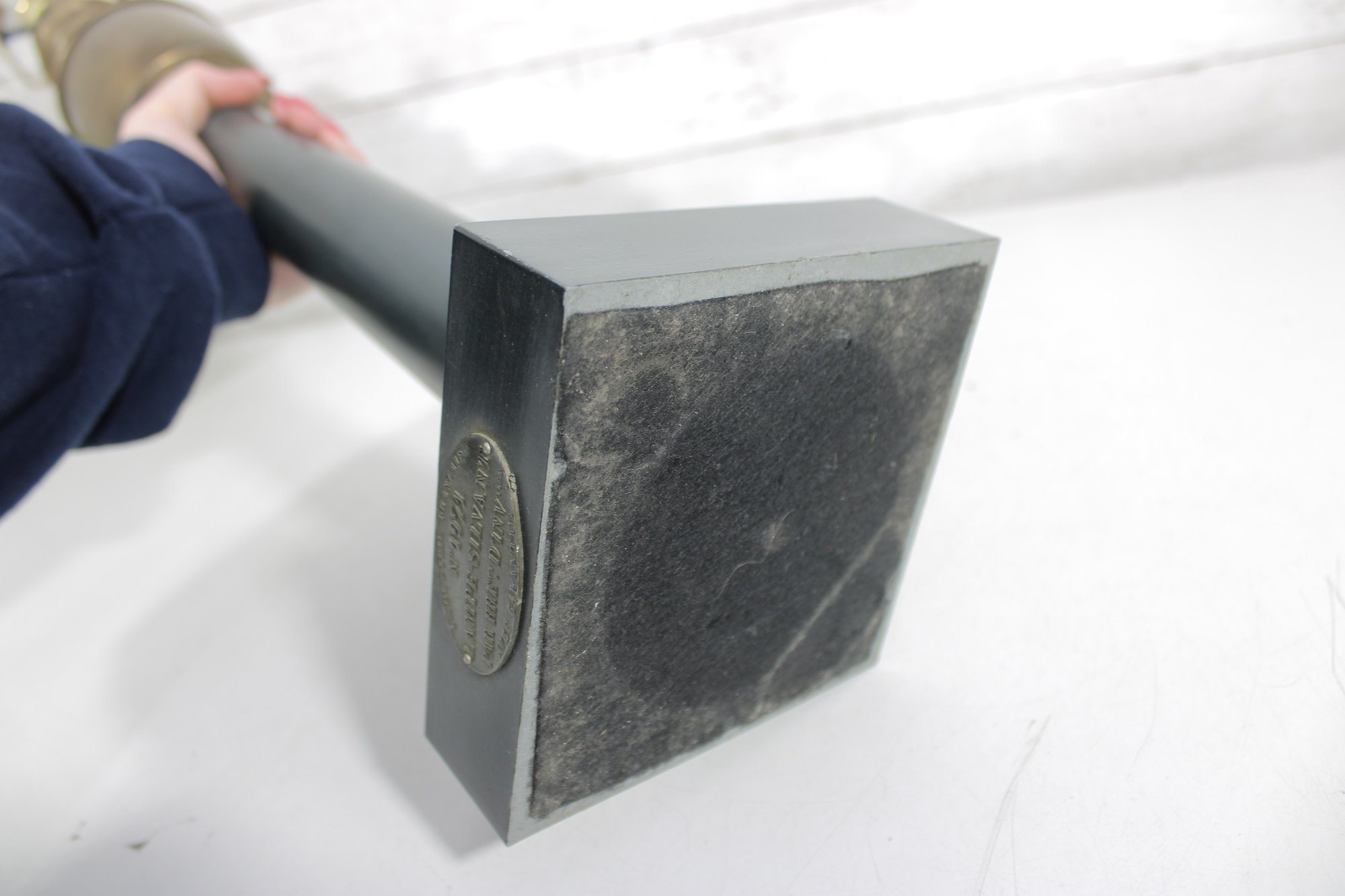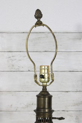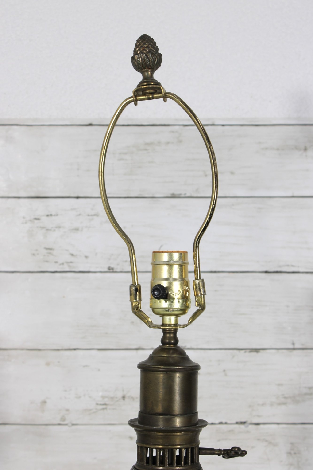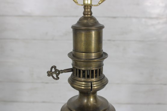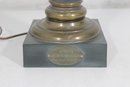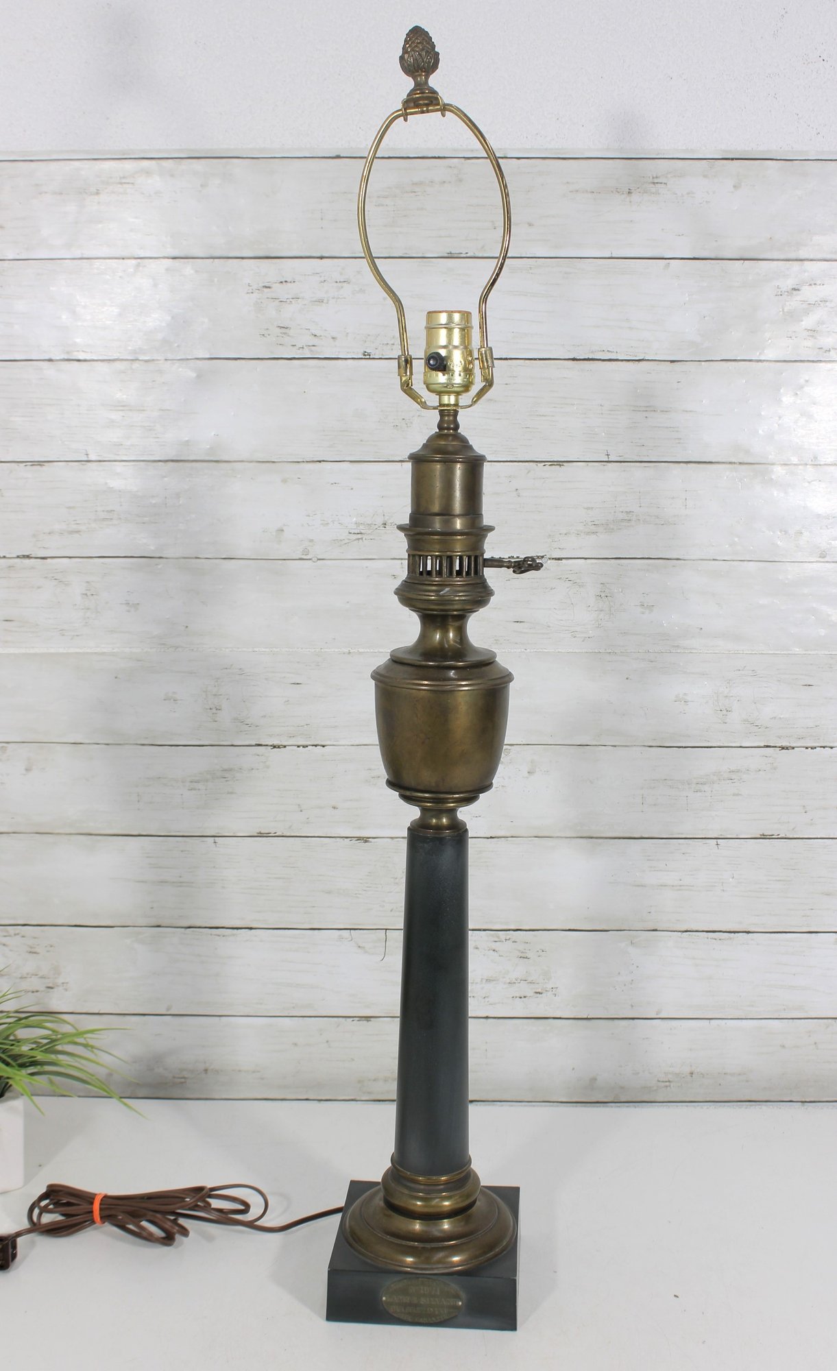 The lamp features a rotary key switch, vented brass detailing, and a sturdy square base with an engraved plaque attached to the front (see photos for inscription details). Its height and timeless styling make it perfect for use on a console table, side table, or as a statement piece in a traditional or vintage-inspired interior.
