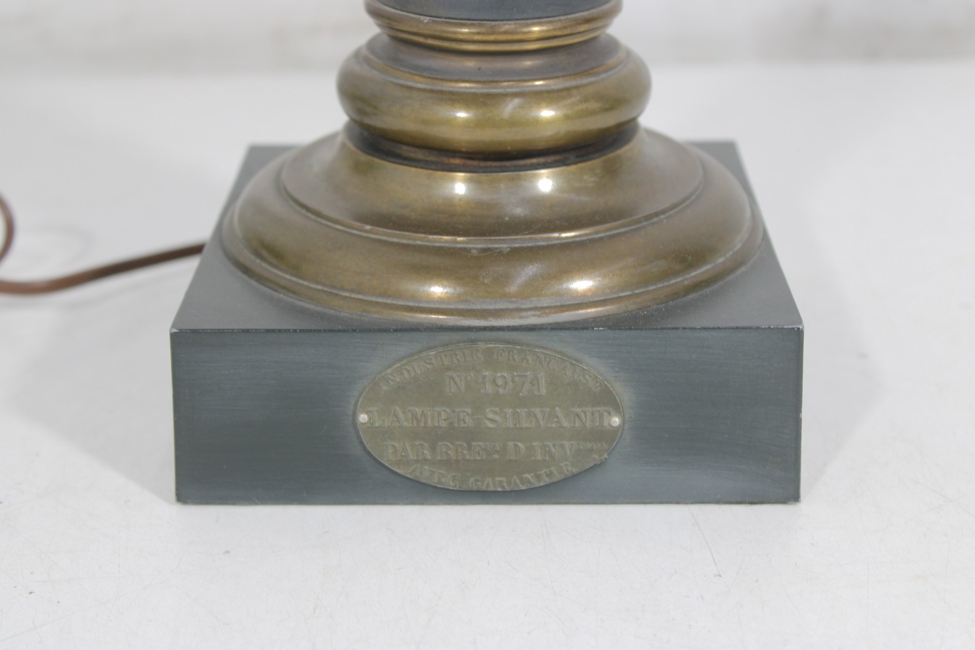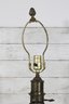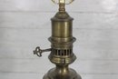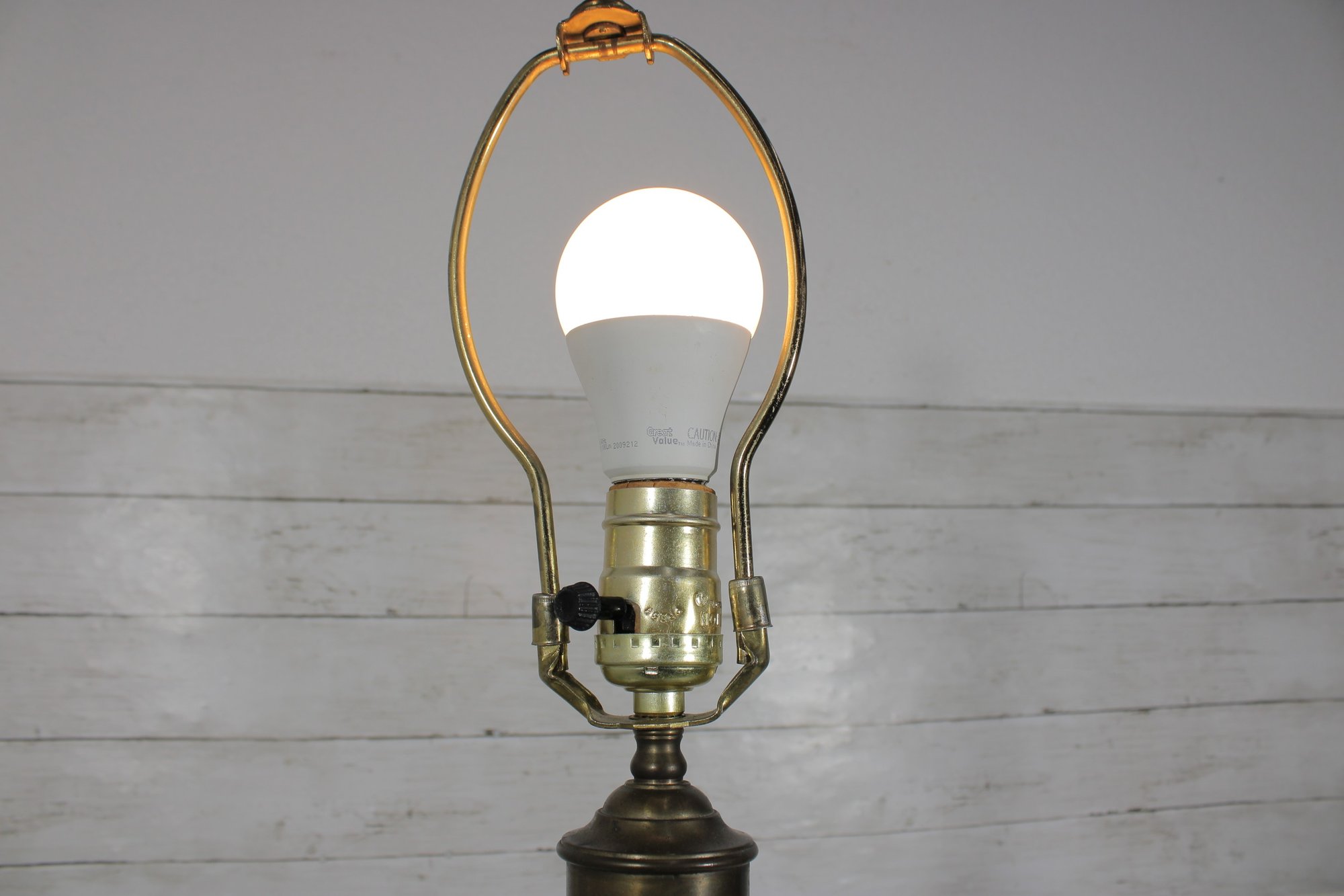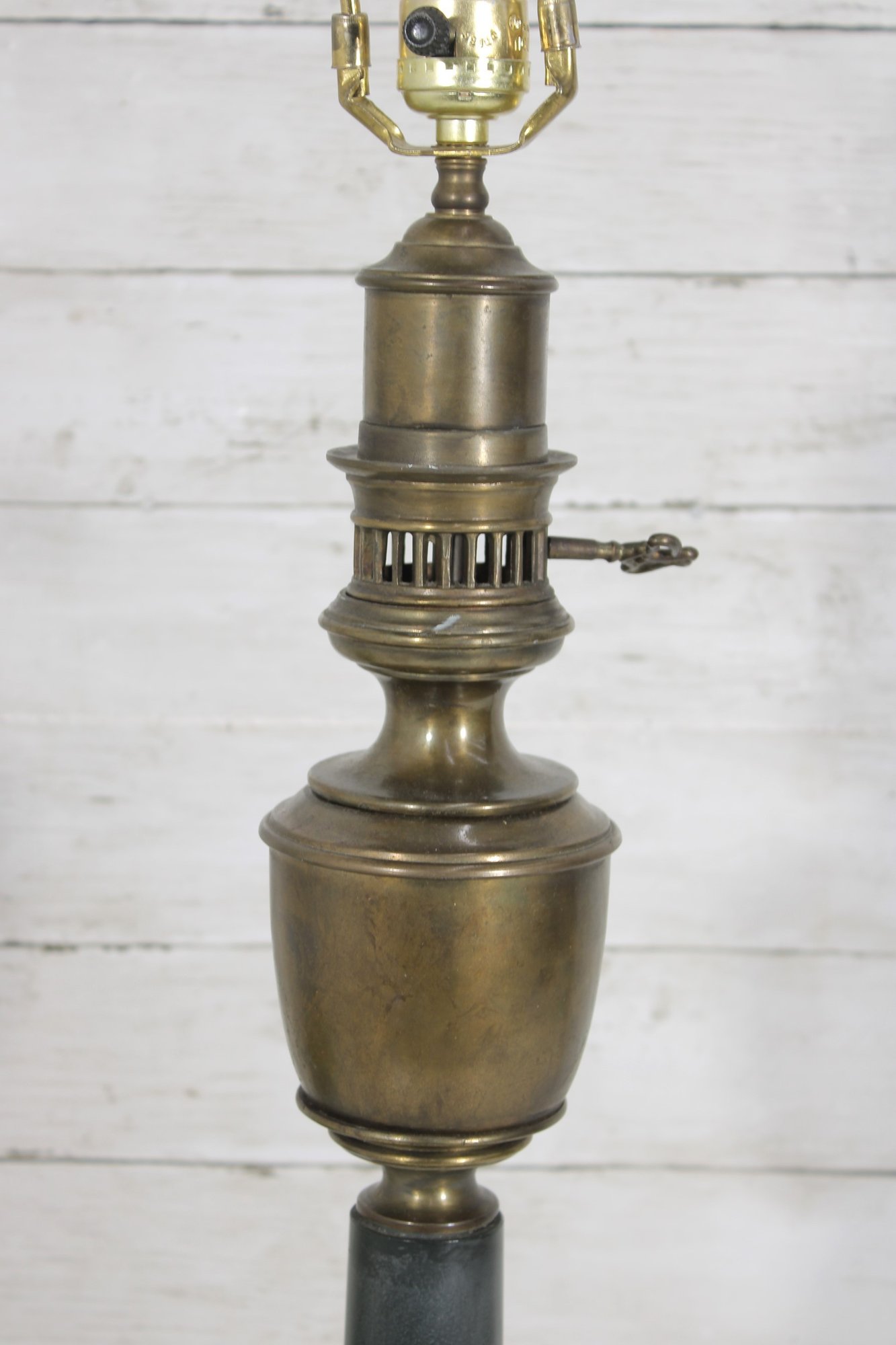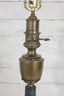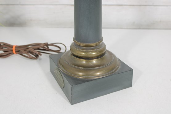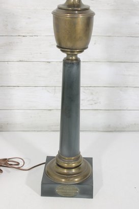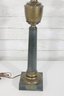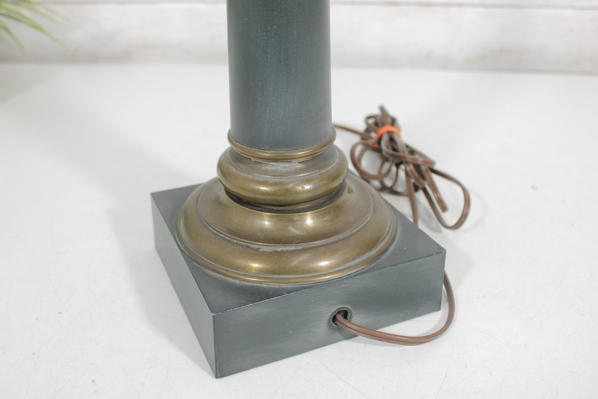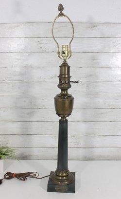 vintage brass column table lamp featuring a tall, classic form with decorative detailing and a substantial square base. This impressive lamp stands approximately 35 inches tall and showcases a traditional design with a rich brass finish and a dark column section that adds contrast and sophistication.