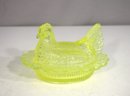 stunning vintage uranium glass "Hen on Nest" covered dish is a must-have for collectors of antique glassware. Measuring 4.5 inches high and 6.5 inches wide, this intricate glass hen sits atop a beautifully detailed nest base, featuring a classic basketweave and scalloped edge design.