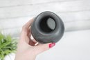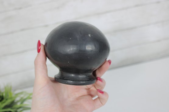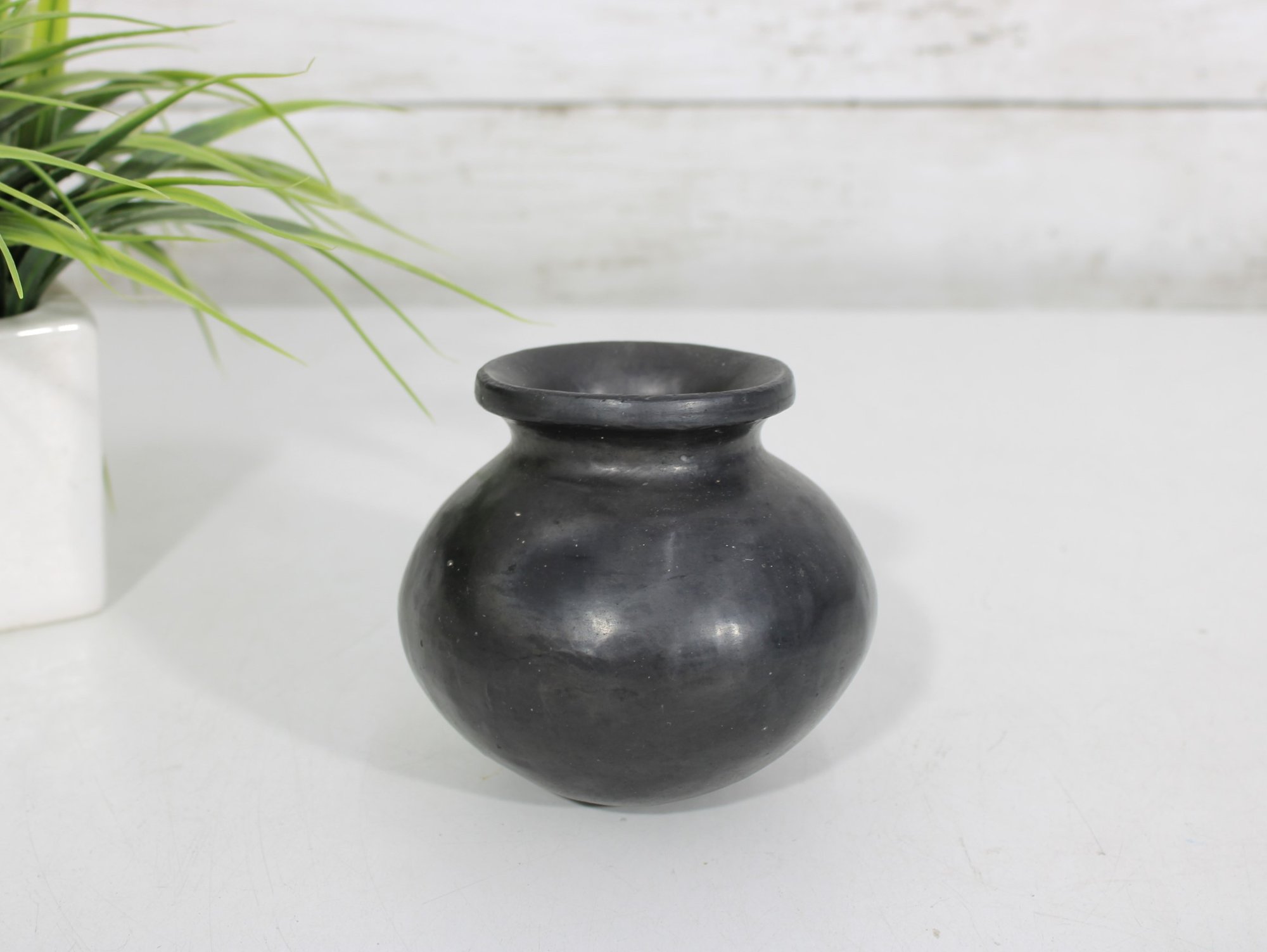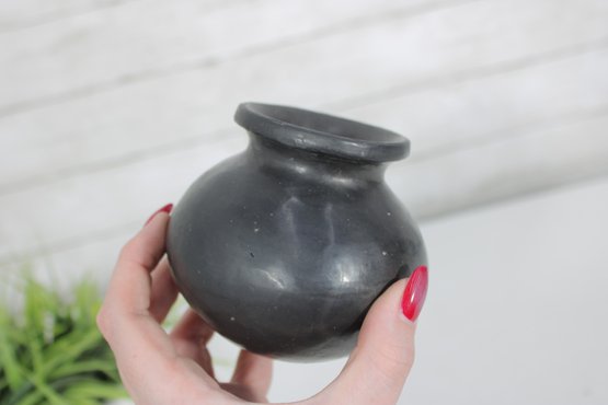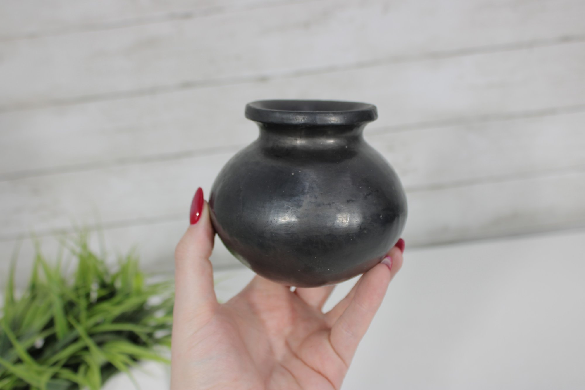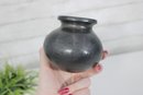 Authentic vintage black pottery vase from Oaxaca, Mexico, measuring approximately 4 inches tall. This piece is crafted in the traditional barro negro style made famous by Dona Rosa, known for its distinctive burnished black finish and smooth, reflective surface.