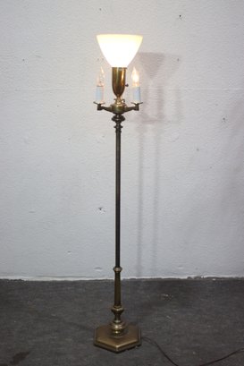 This vintage brass torchiere floor lamp offers both elegance and functionality with four individual light sources, creating a warm and inviting ambiance. The classic brass finish and hexagonal base provide a timeless look that complements traditional and vintage-inspired interiors.