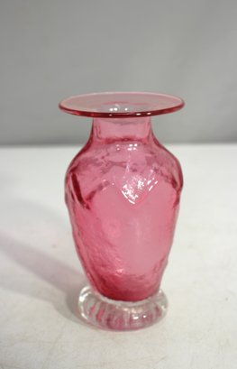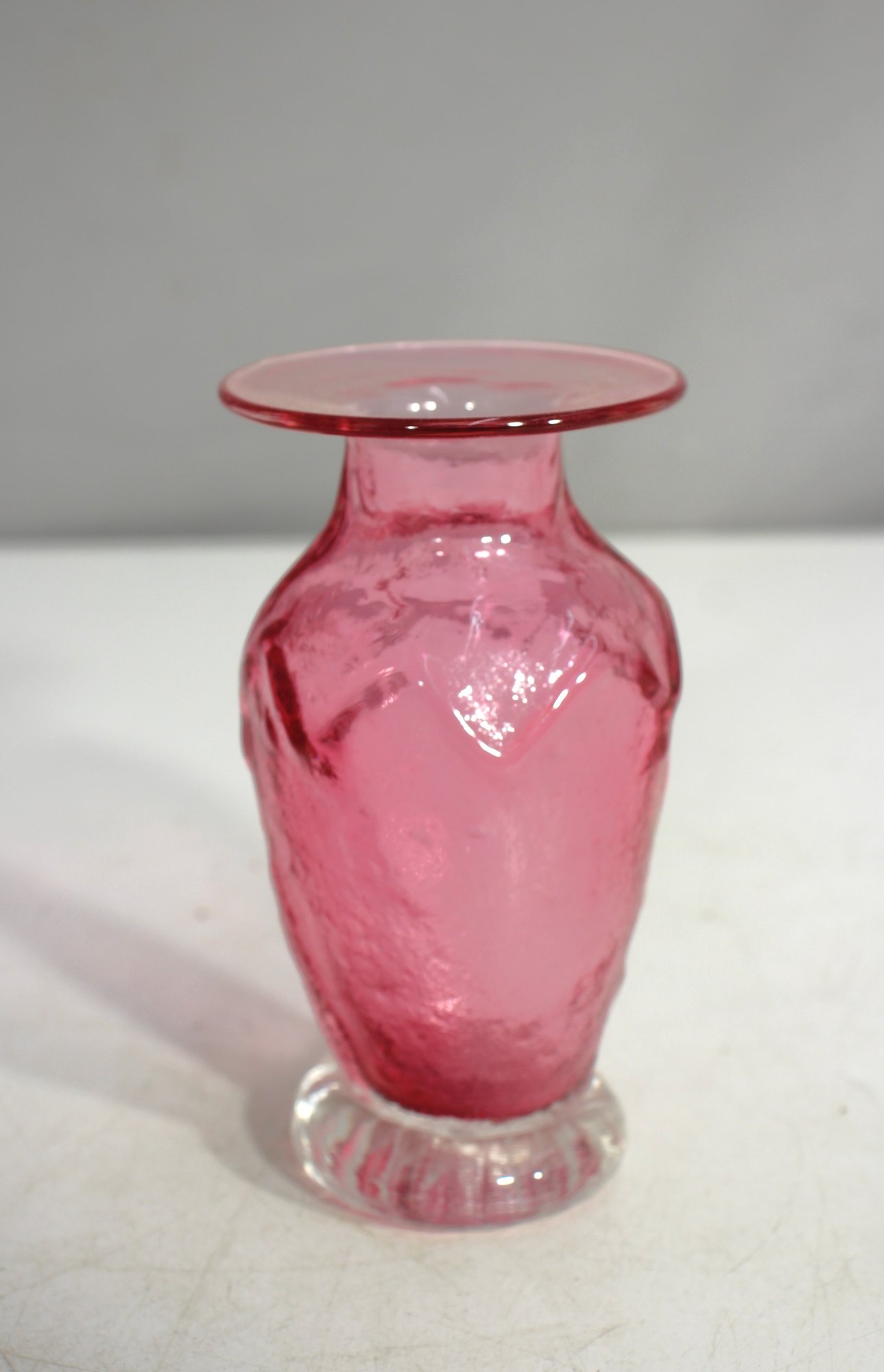 5.5-inch hand-blown cranberry glass vase is a beautiful addition to any glassware collection. The vase features a lovely deep pink hue with a textured surface and an elegant floral motif. The clear glass base adds contrast, showcasing the artistry of the hand-blown design.