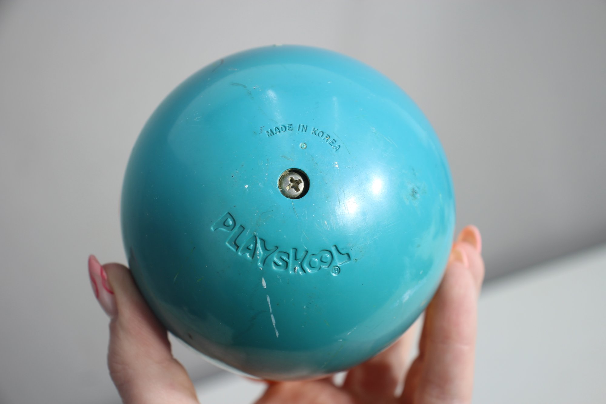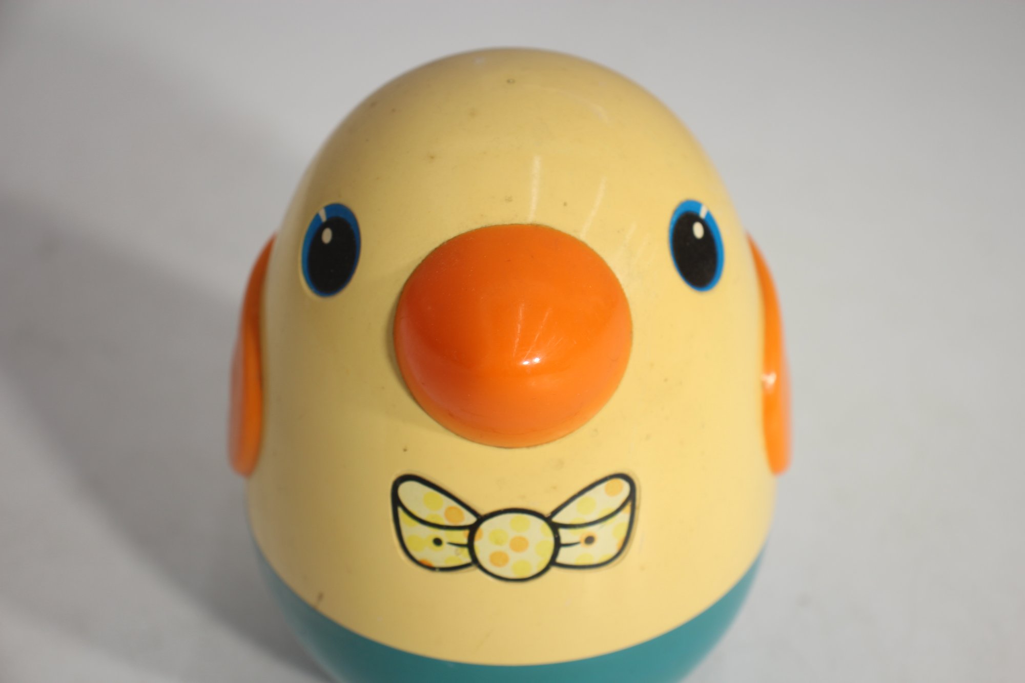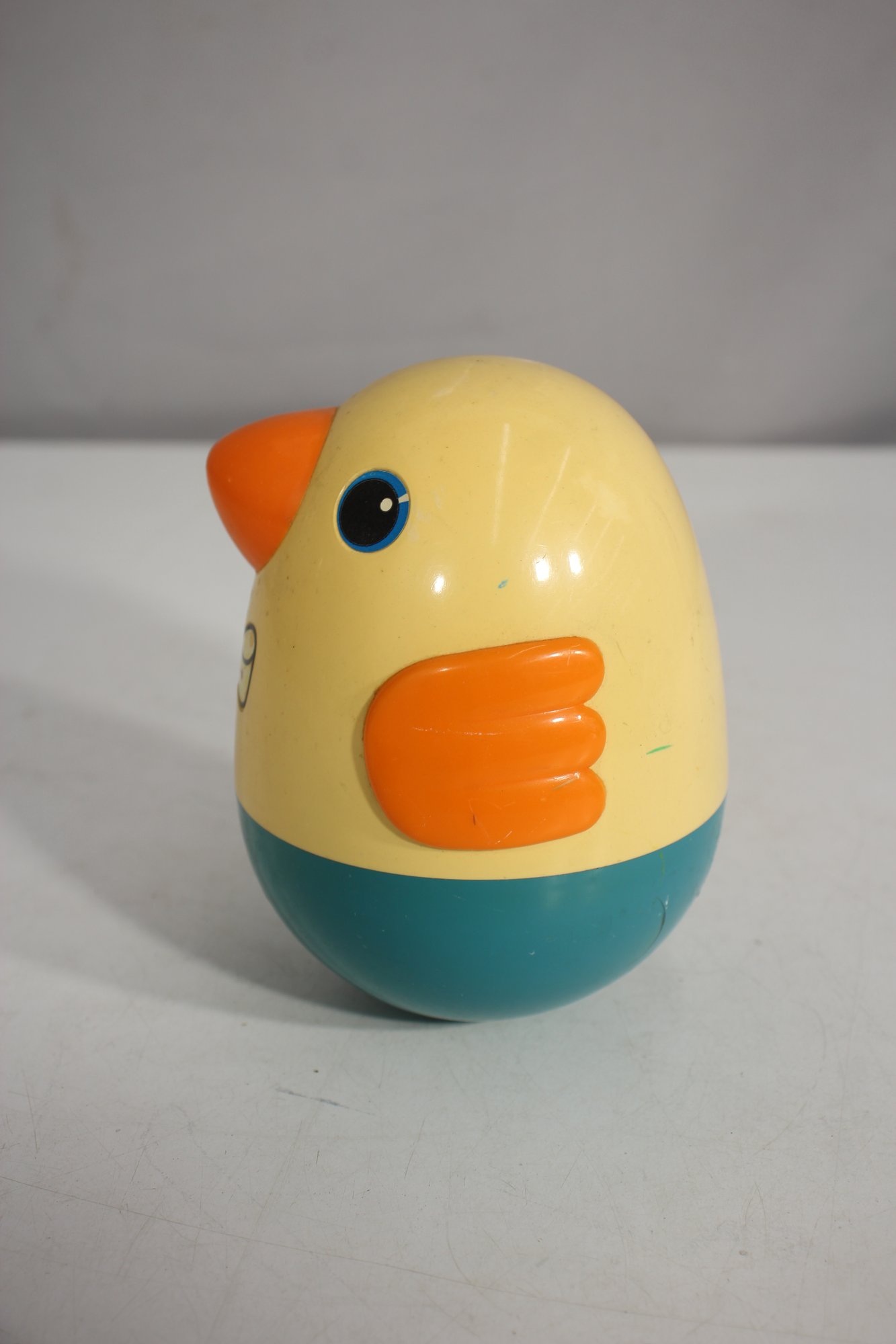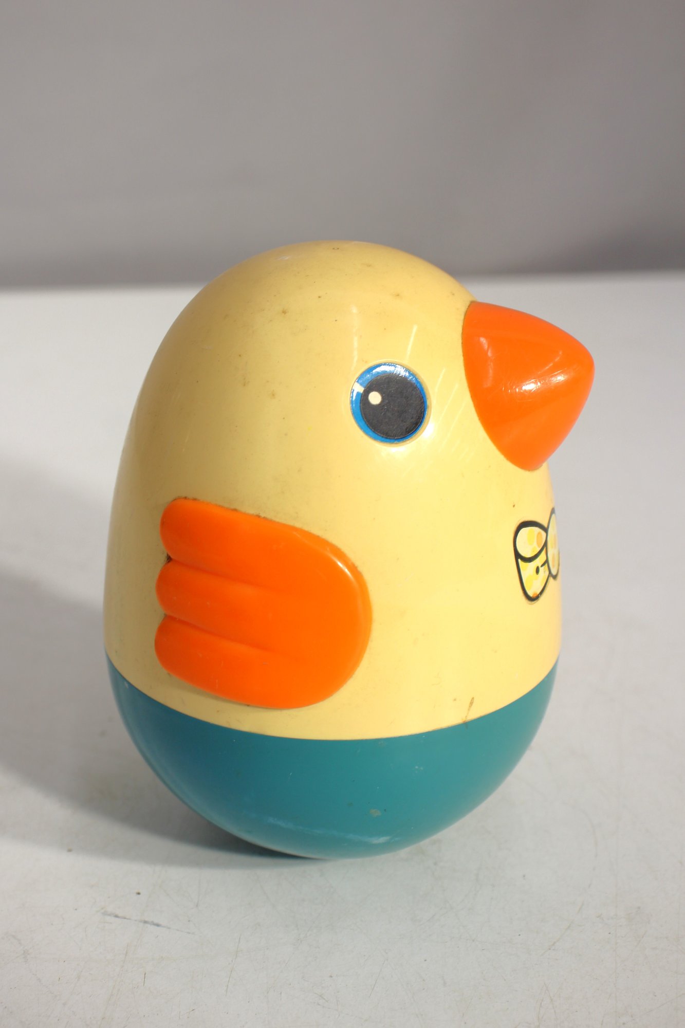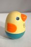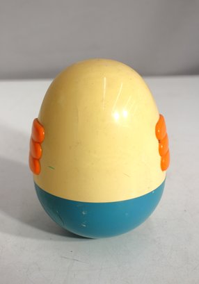 Relive childhood memories with this vintage PLAYSKOOL Weeble Wobble Bird, a delightful roly-poly toy that never falls over! This classic chick/duck design features a charming yellow body, orange beak and wings, and a blue base.