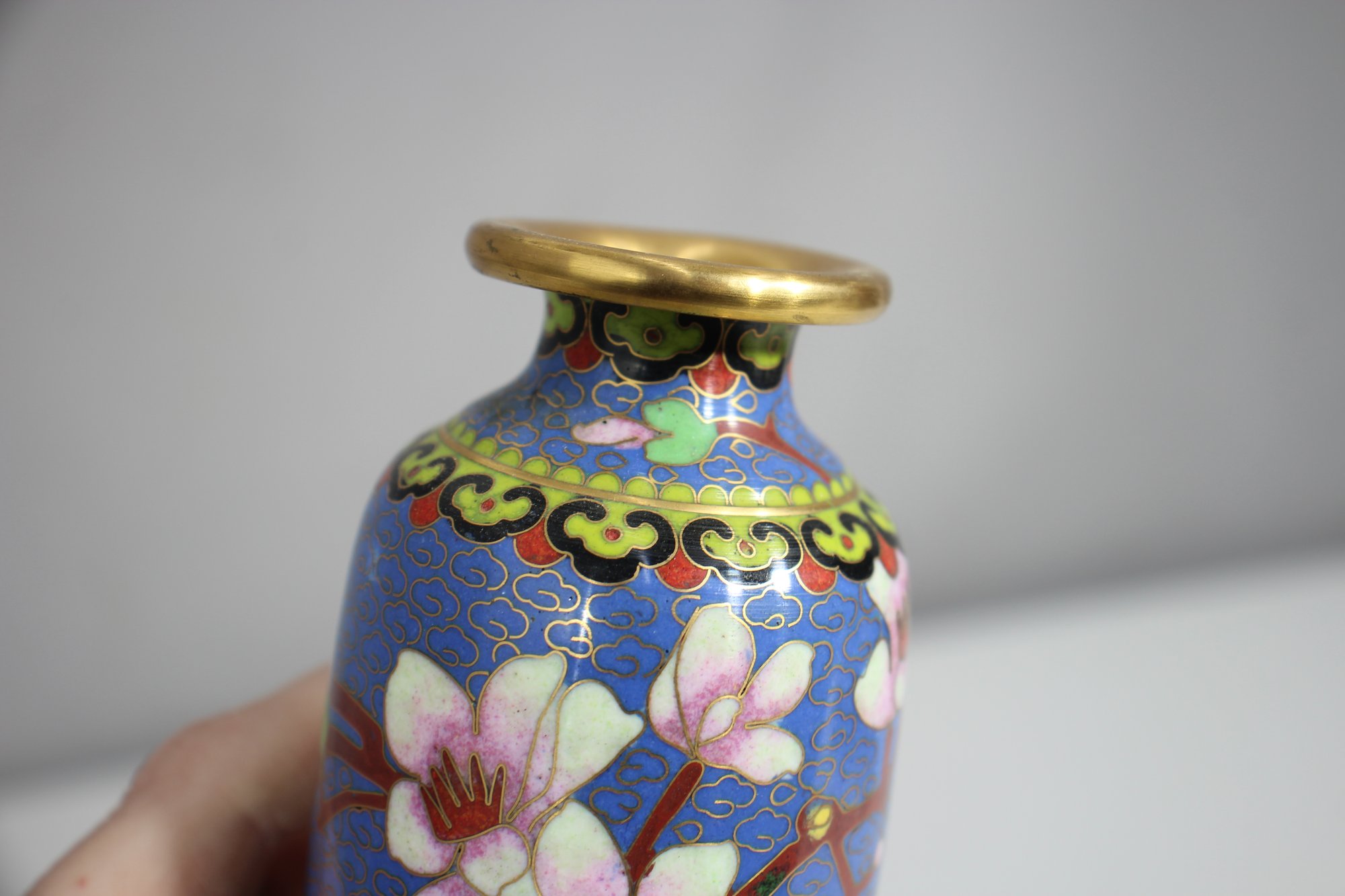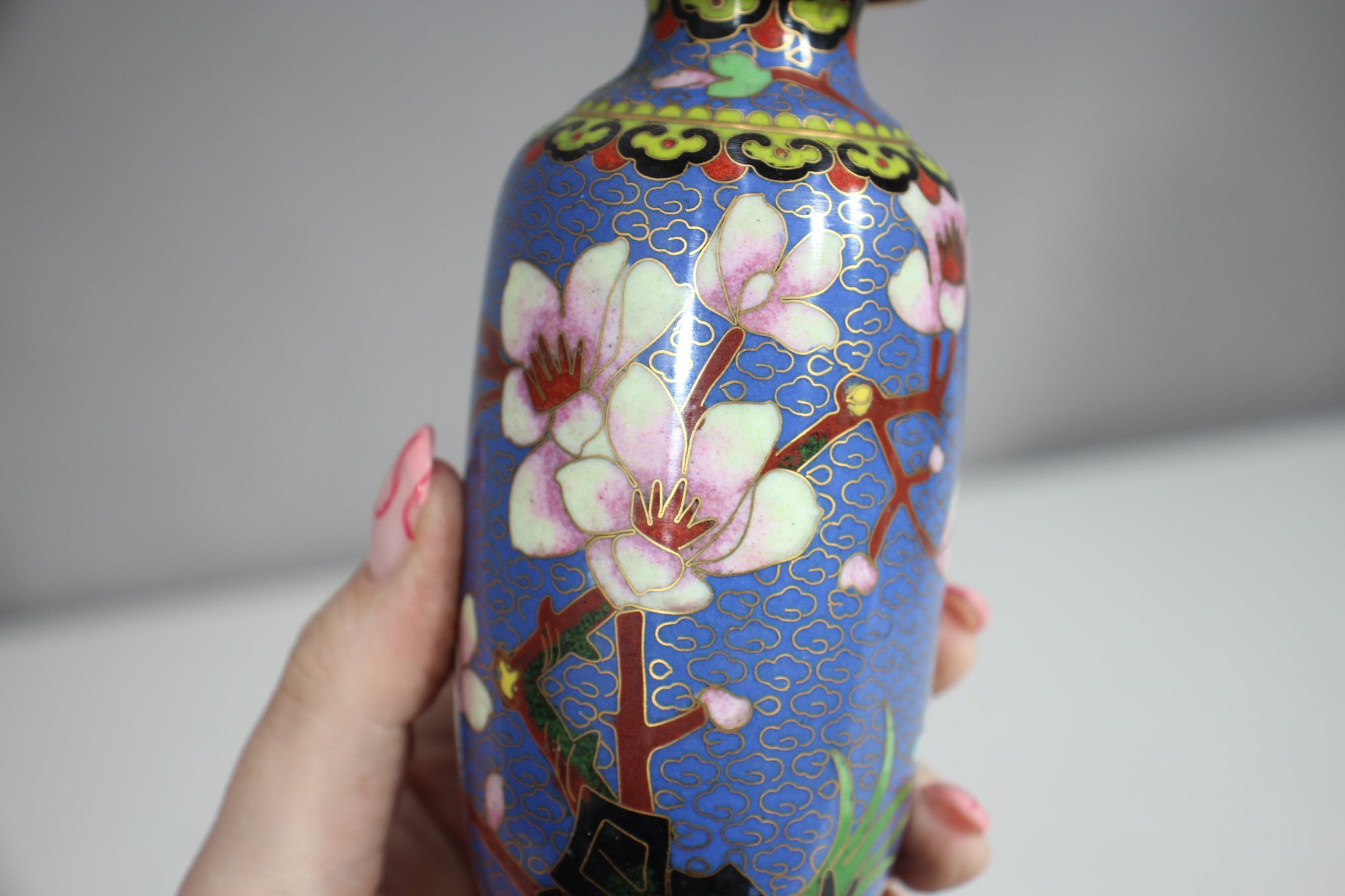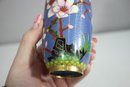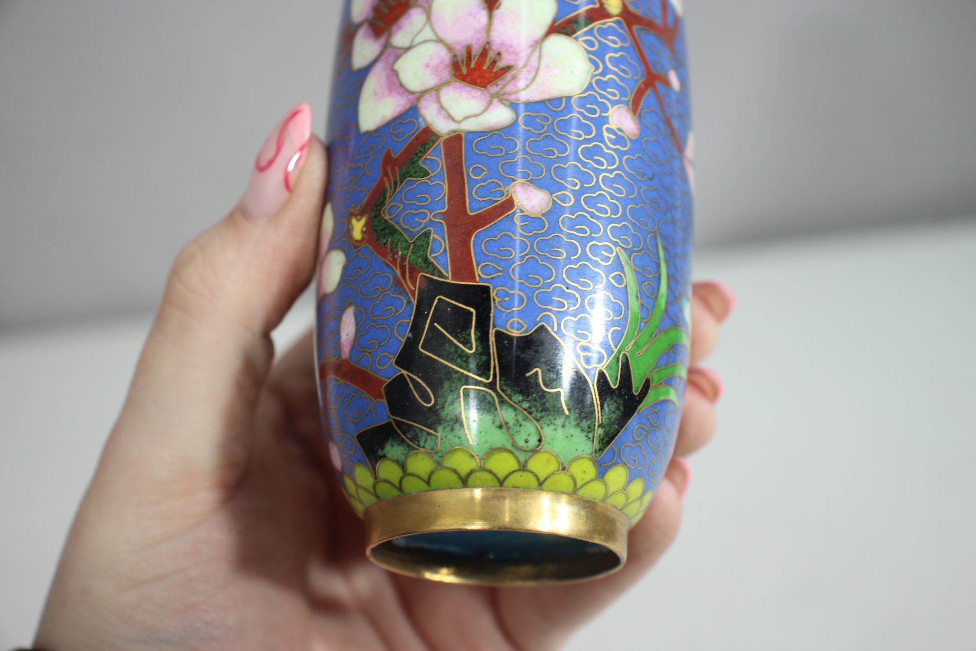 5-inch vintage Chinese cloisonné enamel vase features a stunning blue background with hand-decorated cherry blossoms, gold accents, and traditional geometric patterns. The detailed craftsmanship and vibrant colors make this an excellent addition to any Asian art collection or home décor.