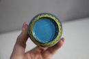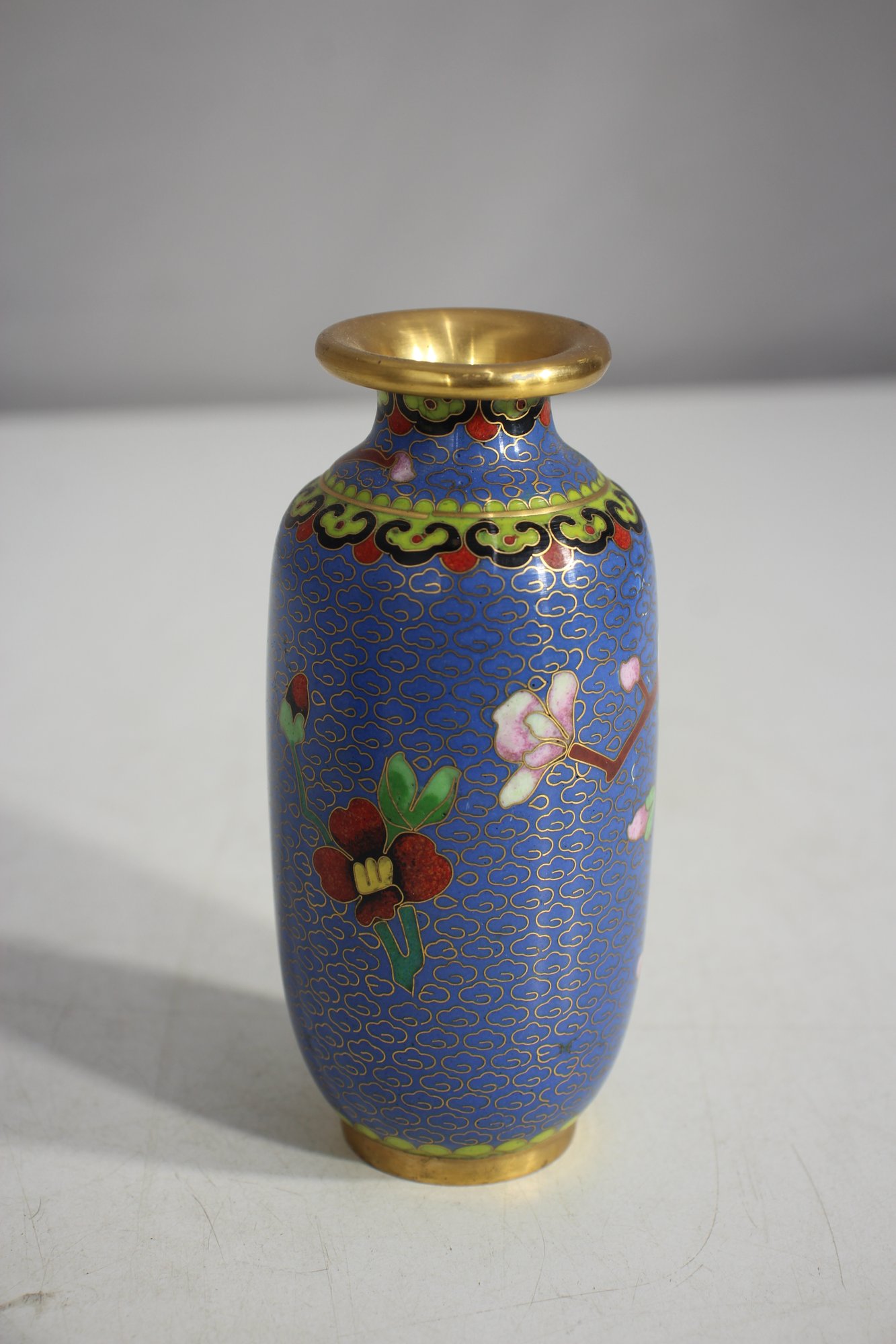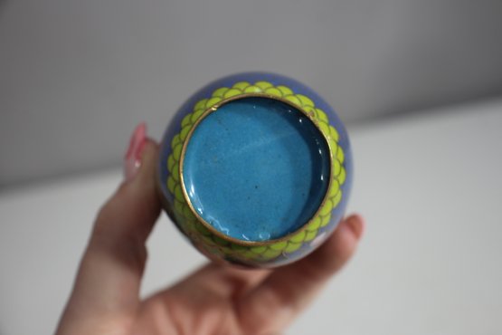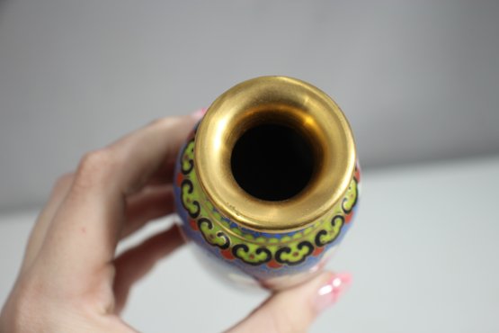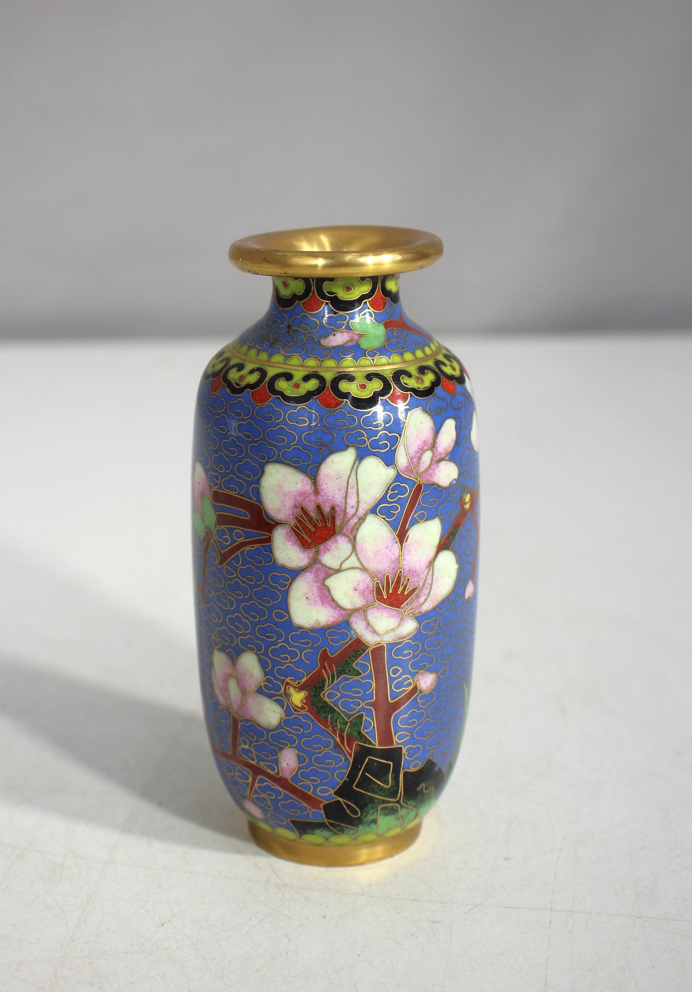 5-inch vintage Chinese cloisonné enamel vase features a stunning blue background with hand-decorated cherry blossoms, gold accents, and traditional geometric patterns. The detailed craftsmanship and vibrant colors make this an excellent addition to any Asian art collection or home décor.
