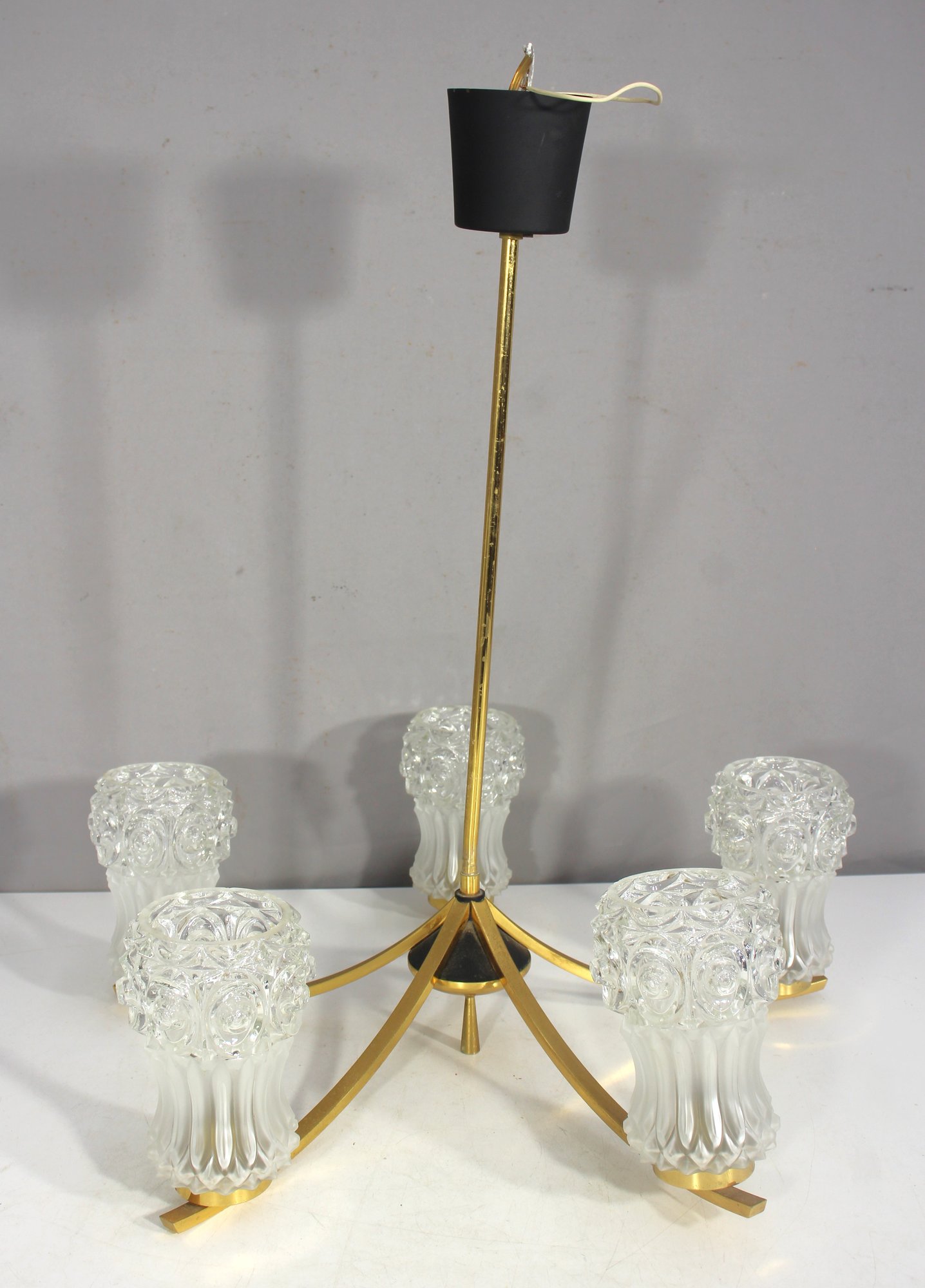 a stunning vintage 5-light brass chandelier, featuring an elegant mid-century modern design. This 25-inch tall and 22-inch wide fixture showcases a sleek gold-tone brass frame with ornate textured glass shades, adding a touch of timeless elegance to any space.