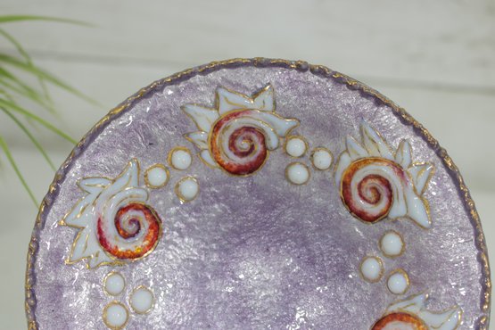 Charming vintage enamel on copper plate featuring a delicate and eye-catching design. The surface displays a soft lavender-purple iridescent ground adorned with raised scroll and floral motifs in white and warm reddish tones, arranged in a circular pattern. The textured enamel gives the piece a luminous, almost pearlescent quality that shifts beautifully in the light.