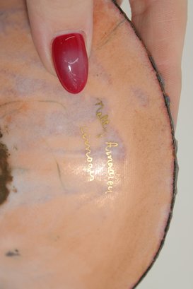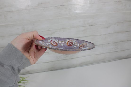 This 6” plate is perfect for display as wall décor, part of a collection, or as a small decorative accent. Its elegant color palette and detailed craftsmanship make it a lovely example of mid-century enamel artistry.
