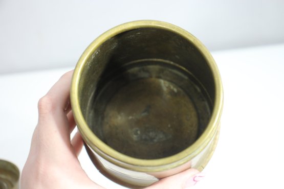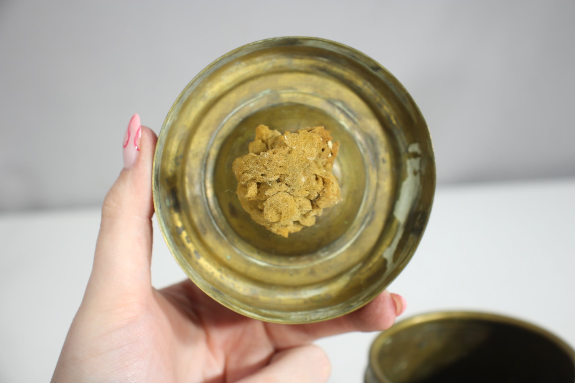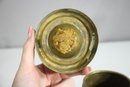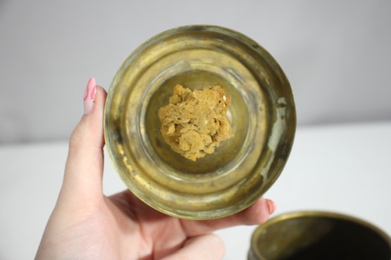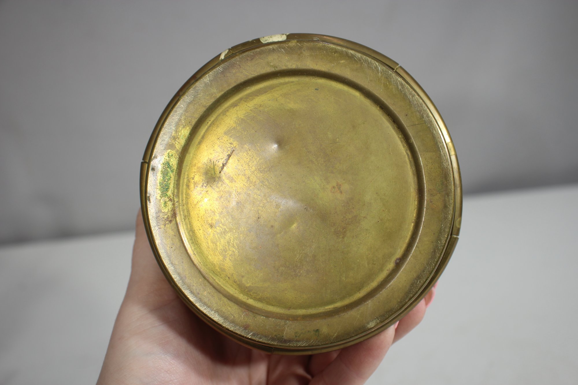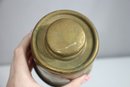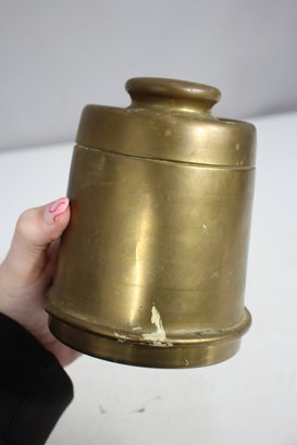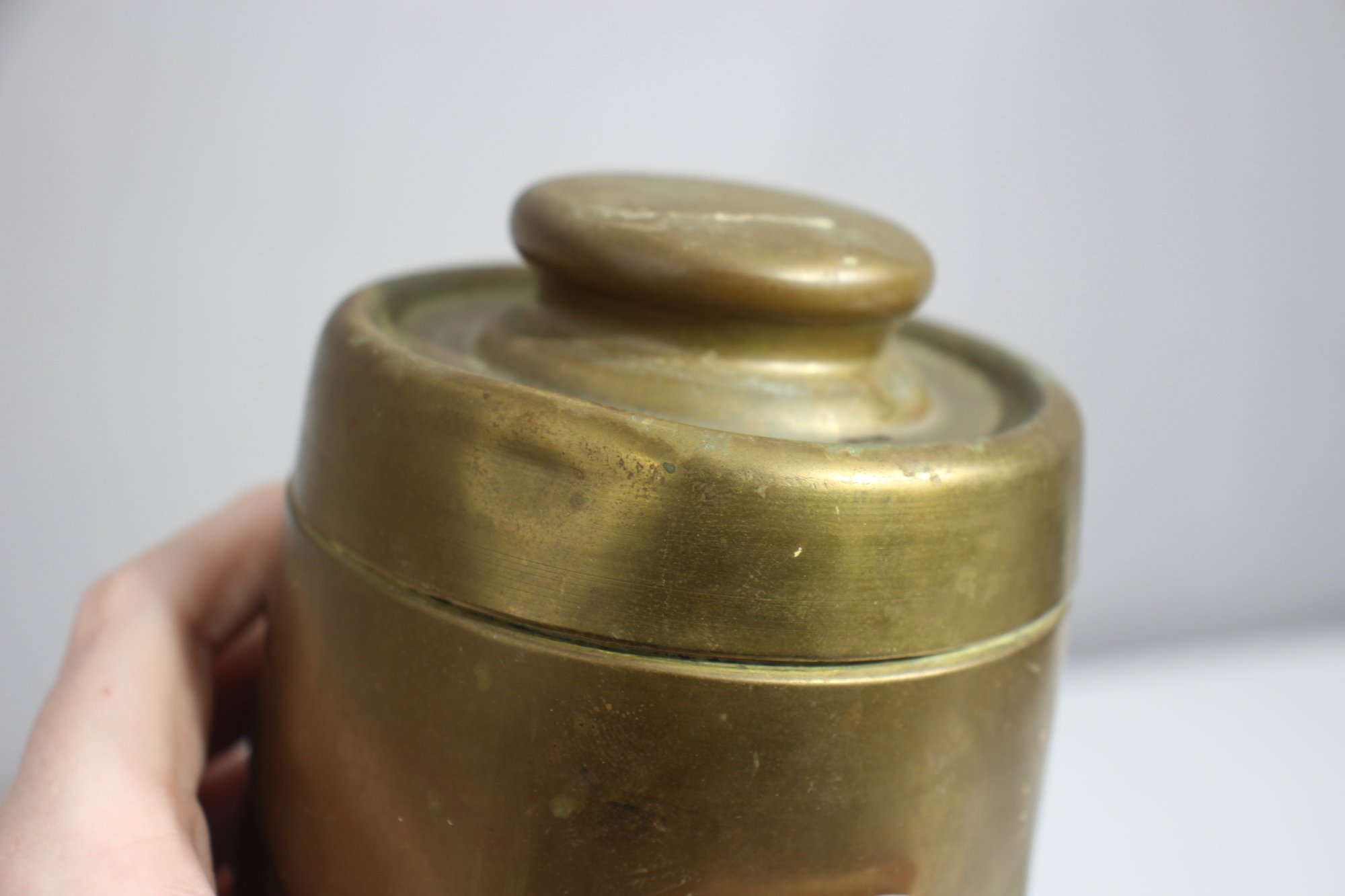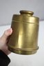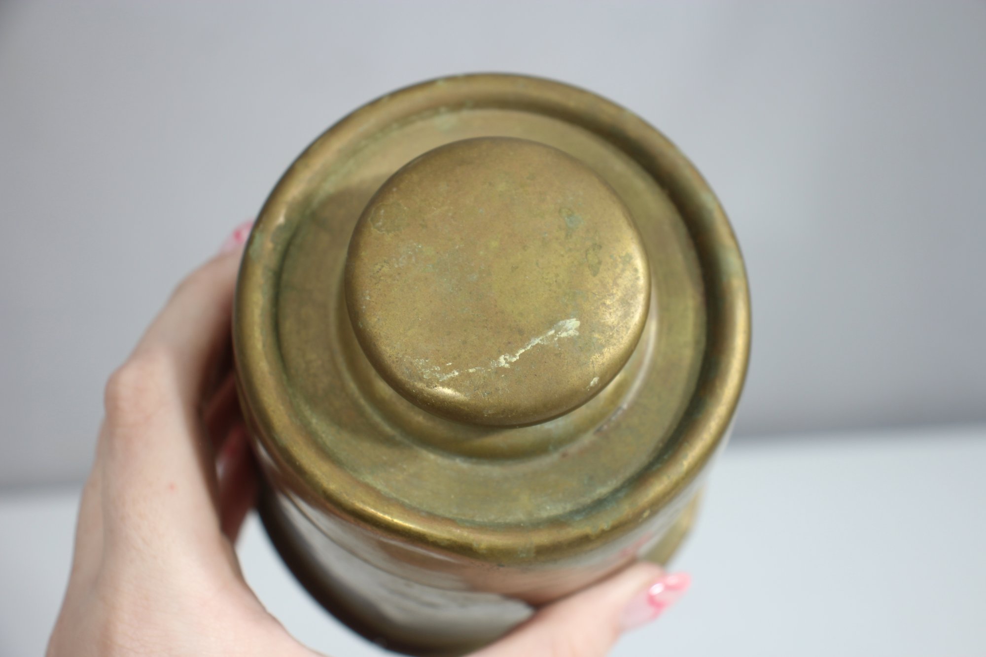 vintage 6-inch solid brass lidded container is a heavy, well-crafted piece with a rich natural patina, making it a perfect addition to any antique décor collection. The smooth, rounded lid fits snugly on the canister, making it ideal for storage, decorative display, or repurposing as a unique accent piece.