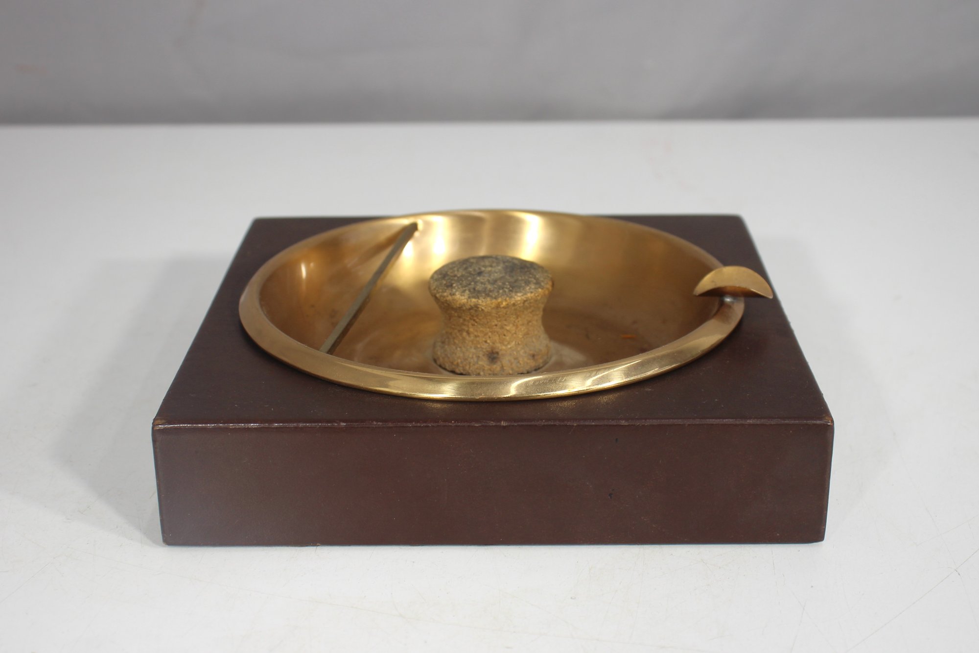vintage brass and wood ashtray, measuring 7.5” x 7.5”, designed with a Mid-Century Modern aesthetic. This unique ashtray features a solid brass bowl with an integrated cigar rest, mounted on a wooden base, creating a stylish and functional piece.