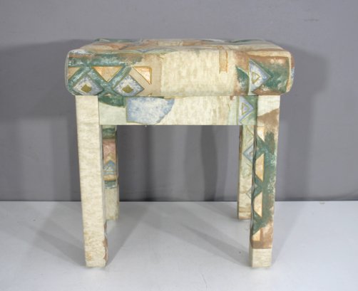 Add a pop of retro flair to your space with this vintage upholstered stool featuring a bold Southwest-inspired geometric fabric in desert tones of sage, terra cotta, and beige. Its compact design makes it perfect as an accent seat, vanity stool, or footrest.