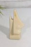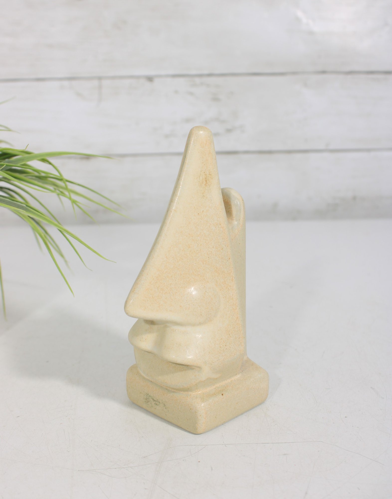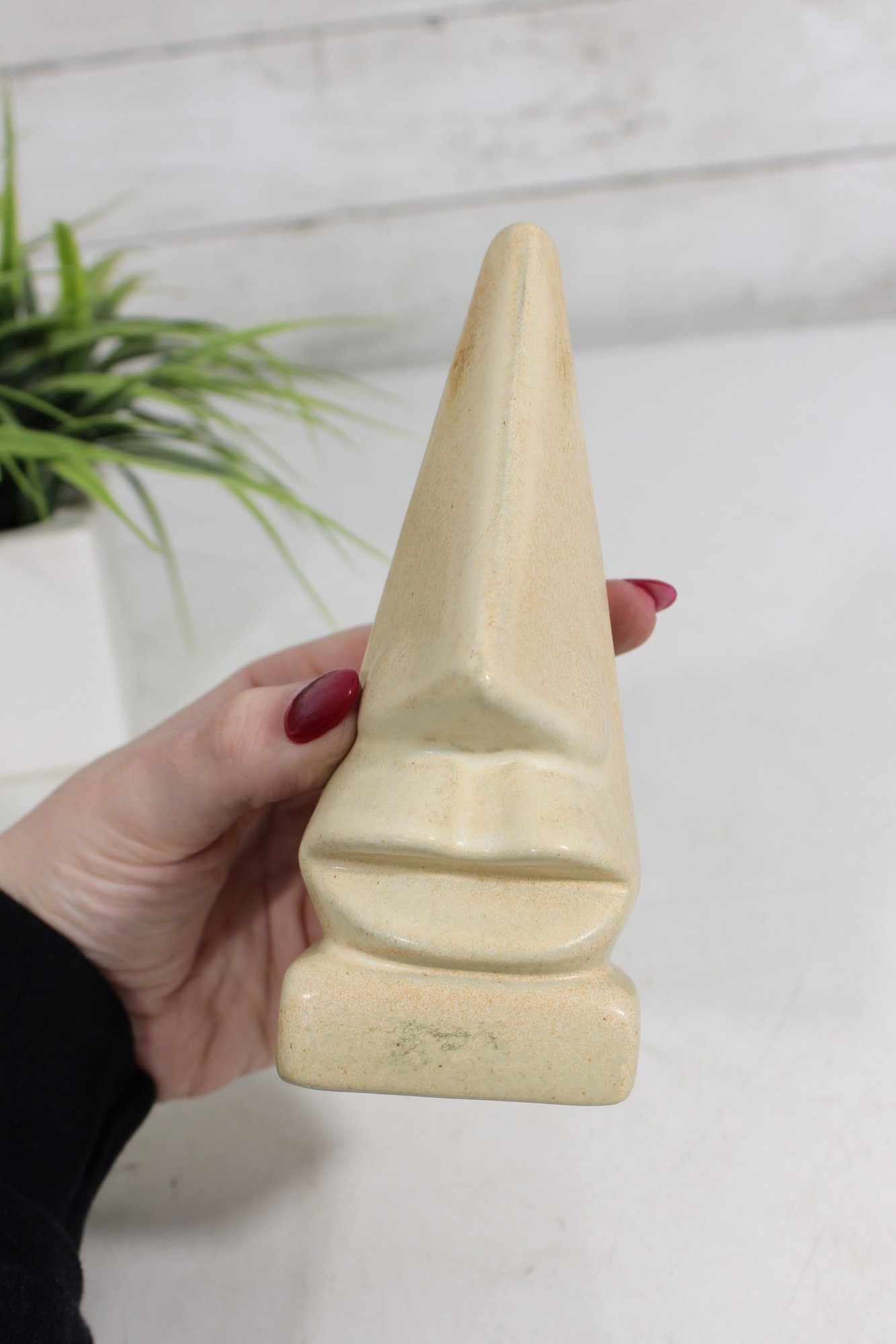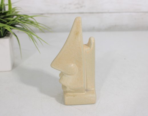 abstract ceramic sculpture featuring a stylized human face with elongated, geometric features. The minimalist design emphasizes a long angular nose and simplified facial structure, giving the piece a bold modernist aesthetic.