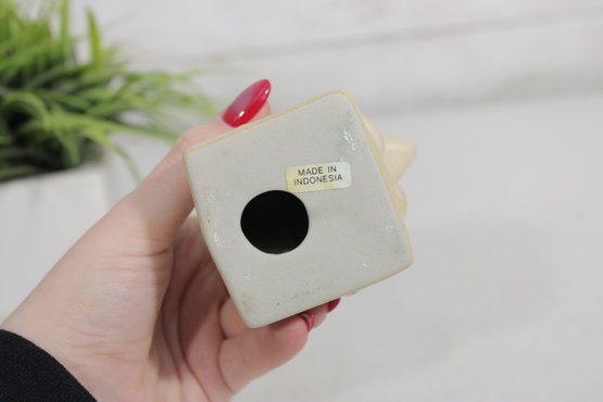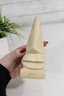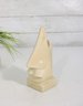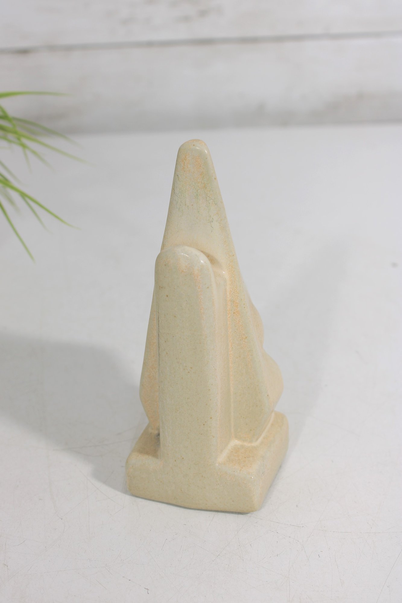 Finished in a soft cream glaze, this sculpture has a smooth, slightly speckled surface that complements its clean lines and sculptural form. Mounted on a square base, it displays well as a decorative accent on a shelf or desk.